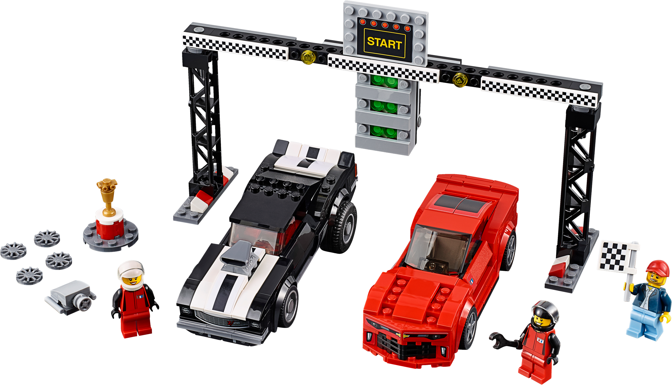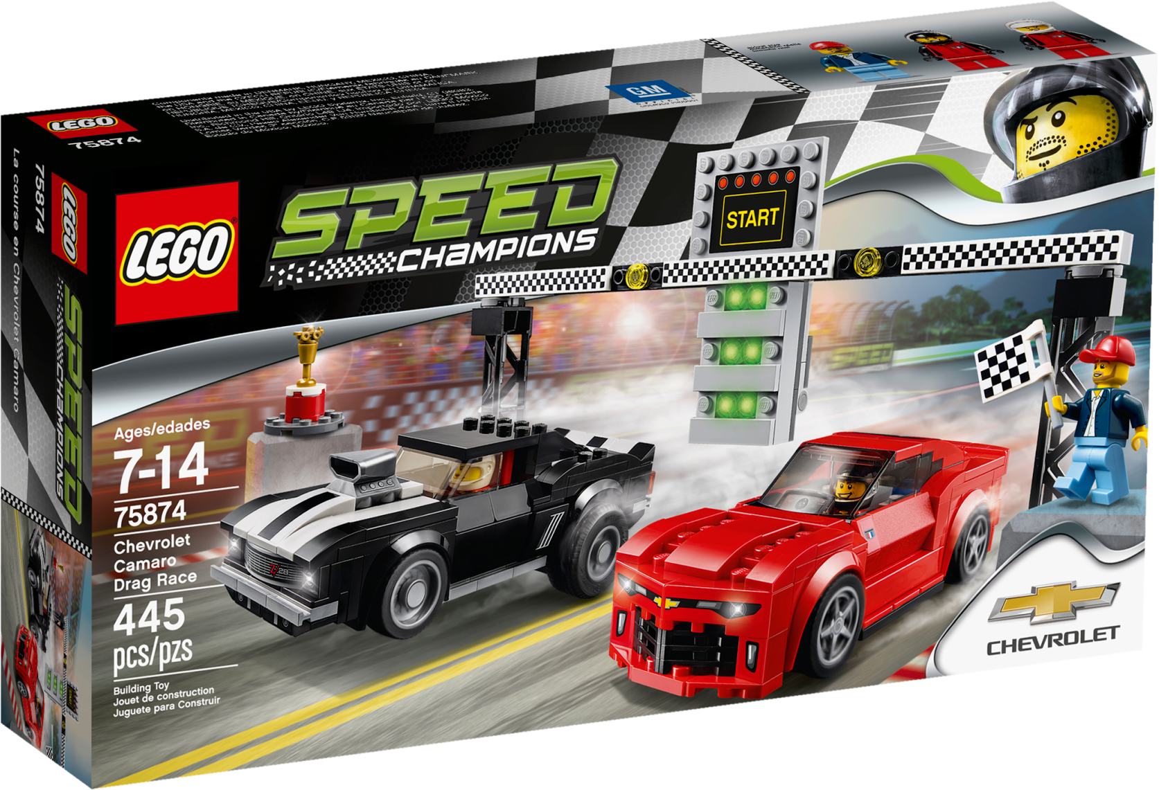 Race your friends in an action-packed race to the finishing line! Choose between the awesome LEGO® Speed Champions 1969 and 2016 Chevrolet Camaro cars. Swap the engines on the '69 Camaro Z/28 and prepare to race against the all-new '16 Camaro. Watch the starting lights turn from red to green and power away. Use all your driving skills to be first past the checkered flag. Then lift the trophy and celebrate a thrilling victory! Includes 3 minifigures: 2 Chevrolet Racing drivers and a race official. The race-ready, buildable 1969 Chevrolet Camaro Z/28 and 2016 Chevrolet Camaro cars can each fit a minifigure inside and come with 2 sets of interchangeable wheel trims, removable windshields, plus authentic Chevrolet logo and headlight stickers. The 1969 Chevrolet Camaro also comes with 2 interchangeable engine blocks. Switch the start/finish line ‘lights' (translucent elements) from red to green to begin the race! Accessory elements include 2 drivers' helmets, the race official's cap and checkered flag, plus a trophy with a stand. 1969 Chevrolet Camaro Z/28 measures over 1” (5cm) high, 5” (14cm) long and 2” (6cm) wide. 2016 Chevrolet Camaro measures over 1” (4cm) high, 5” (14cm) long and 1” (5cm) wide. Start line measures over 5” (15cm) high, 8” (22cm) wide and 2” (6cm) deep.