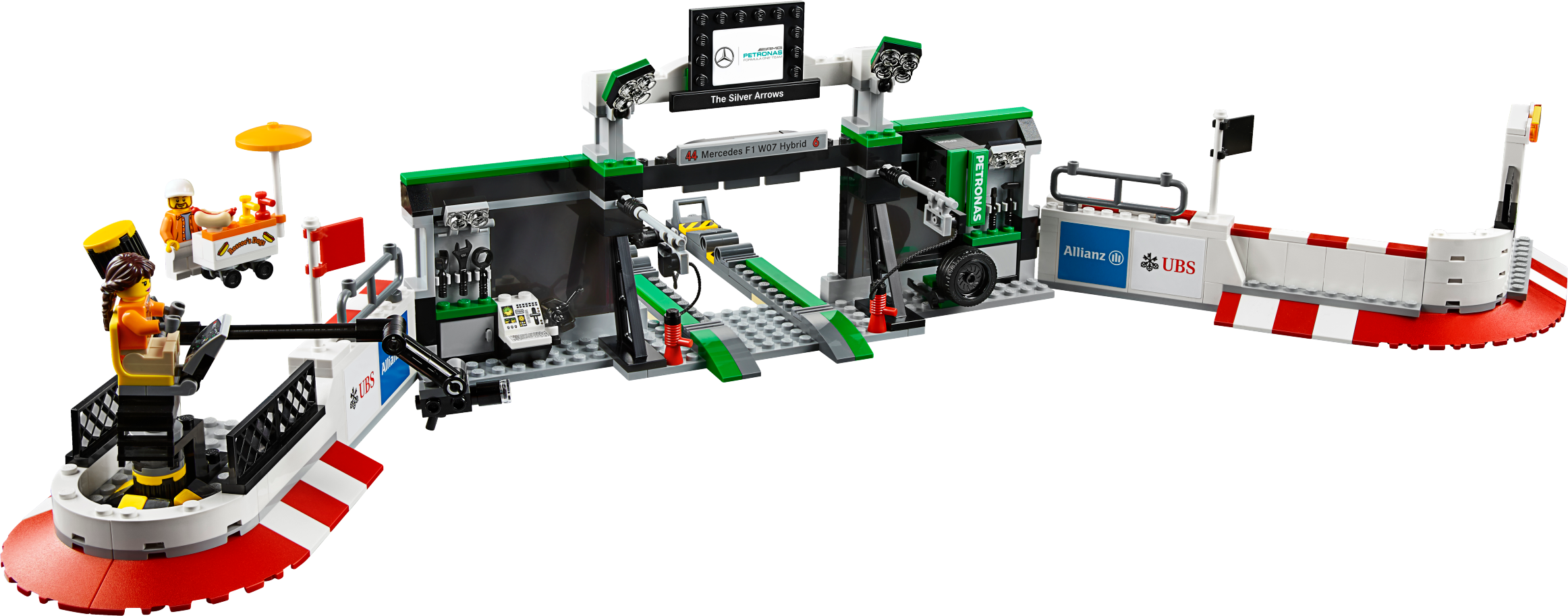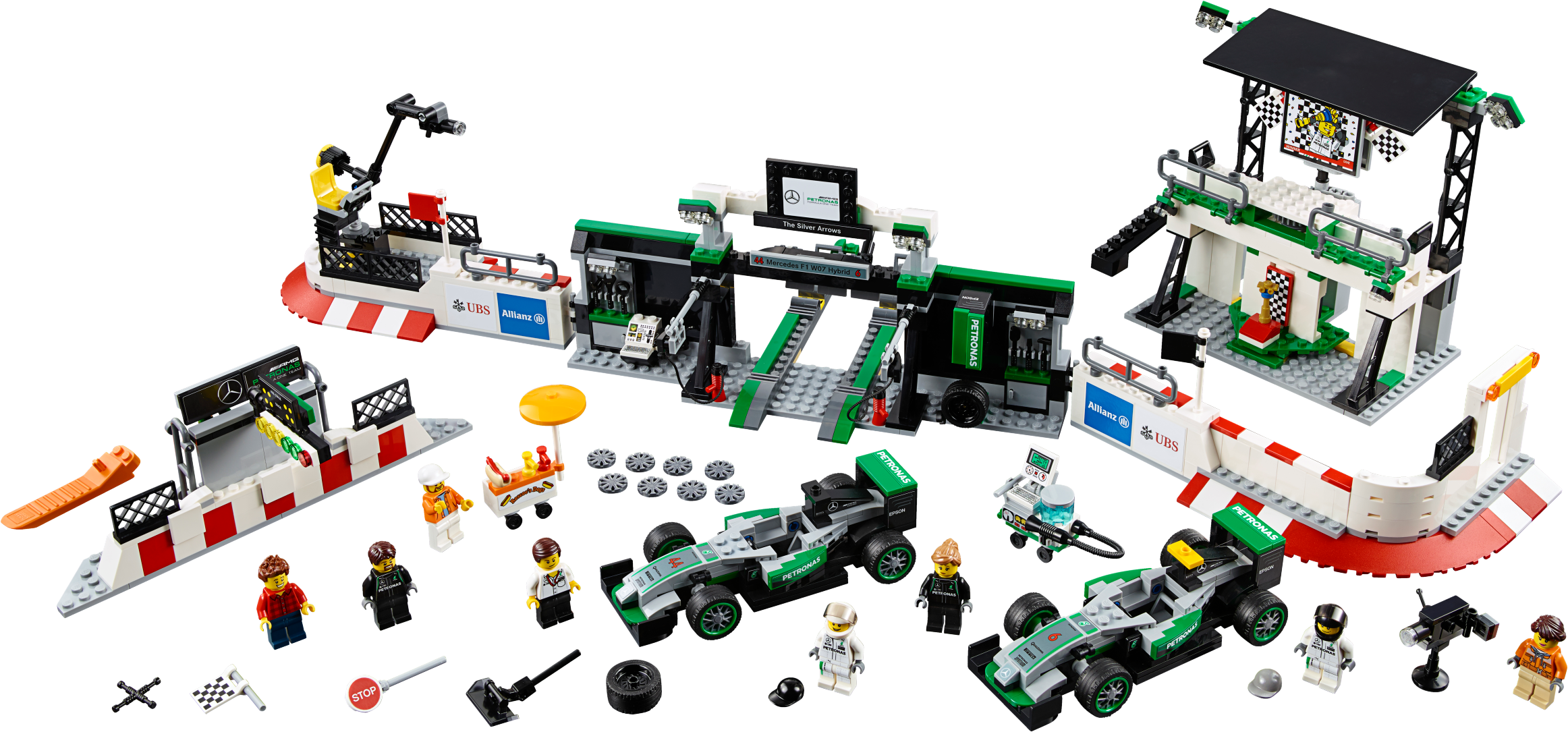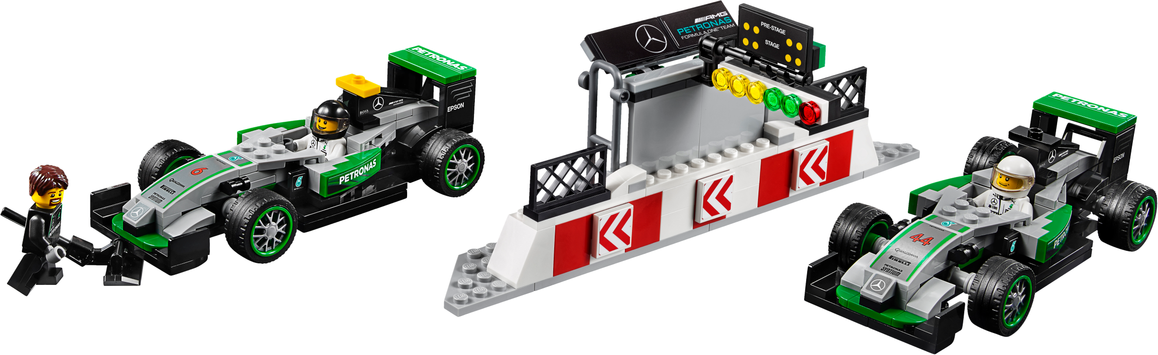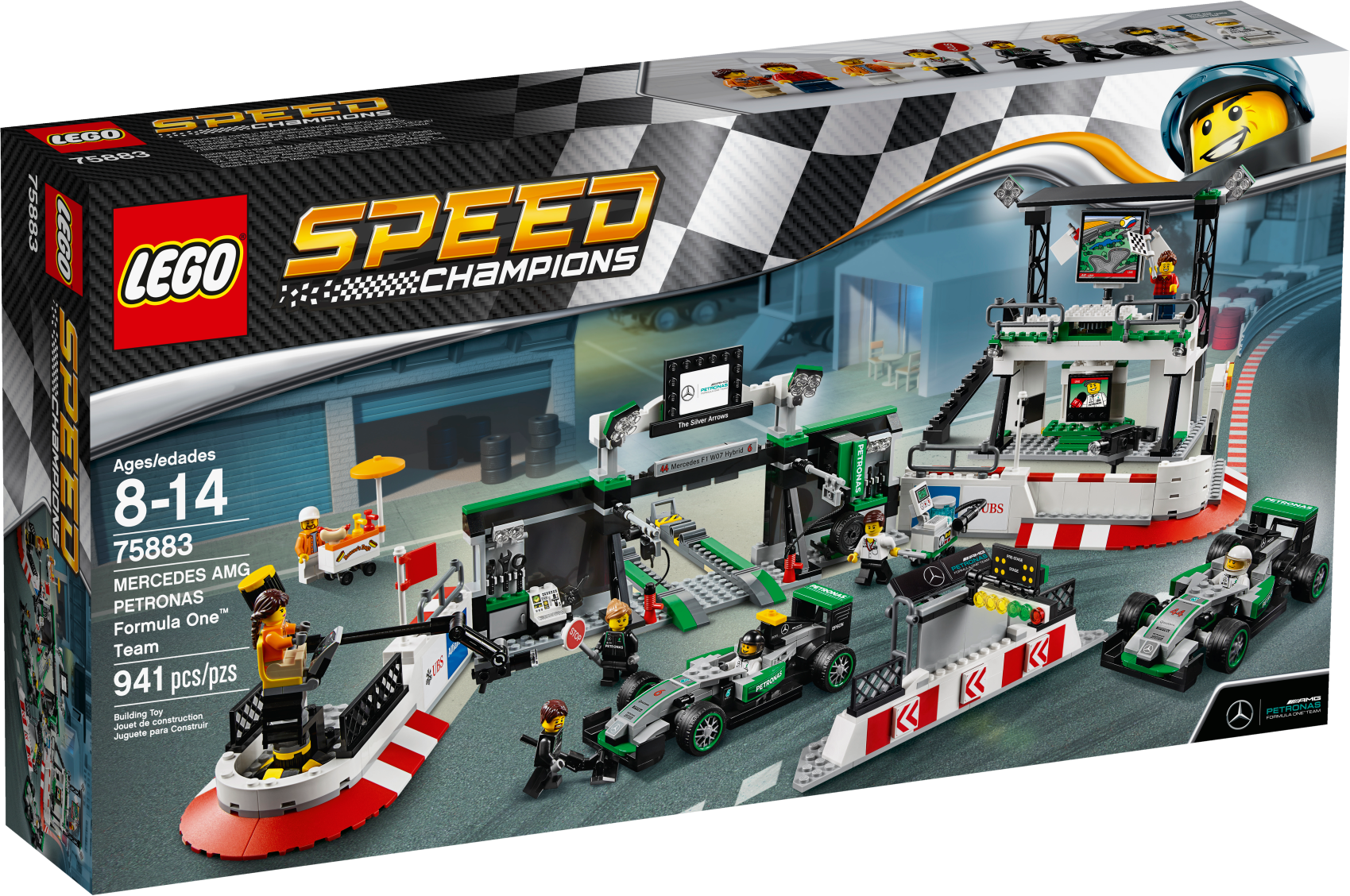 Role-play an entire race day with the MERCEDES AMG PETRONAS Formula One™ Team with this richly detailed LEGO® Speed Champions set, featuring 2 buildable Mercedes F1 W07 Hybrid cars. Packed with play-starting features and functions, it includes a fully equipped pit garage with car jack function, and a pit wall with monitor, checkered flag and translucent start-finish light-style elements. Dial up the big-race atmosphere with the TV camera rig with an adjustable camera arm, plus a grandstand with big screen and rotate function to reveal the winner’s podium. Includes eight minifigures.Includes eight minifigures: two MERCEDES AMG PETRONAS Formula One™ Team drivers, team manager, two engineers, hot dog vendor, cameraman and a race fan.The MERCEDES AMG PETRONAS Formula One™ Team set features a grandstand, pit garage, pit wall, TV rig and two Mercedes F1 W07 Hybrid racing cars.The grandstand has minifigure seats, a media center, big screen with race info graphics and rotate function to reveal the other side of the screen (with winners graphic) and a victory podium with a gold-colored trophy element, plus translucent light elementsThe pit garage includes a car jack function, two mounted computer screens with driver information and assorted elements, including a wheel jack, two spare wheels, two spare wheel caps, five wrenches, drill, oil can, hammer, ‘Stop’ lollipop sign and a team logo.The detailed pit wall includes a start-finish line with translucent green, orange and red light elements, plus a monitor and checkered flag elements.The race-ready, buildable Mercedes F1 W07 Hybrid racing cars each feature a minifigure cockpit, wheels with rubber tires, authentic design details and race livery stickers.Get a bird’s eye view of the race at the hairpin corner with the TV camera rig featuring an adjustable camera arm and camera-style element.Watch the race with the race fan minifigure at the racing corner barrier with a high wall and doorway.Also includes a hot dog stand with a parasol and hot dog element.Accessory elements include two racing driver helmets.This set offers an age-appropriate build and play experience for ages 8+.Grandstand measures over 7” (20cm) high, 8” (21cm) wide and 3” (10cm) deep.Pit garage measures over 5” (14cm) high, 11” (28cm) wide and 7” (18cm) deep.Corner barrier measures over 2” (7cm) high, 8” (22cm) wide and 4” (12cm) deep.Hairpin corner with camera rig measures over 3” (8cm) high, 3” (10cm) wide and 8” (22cm) deep.Pit wall measures over 2” (7cm) high, 7” (19cm) wide and 1” (3cm) deep.Mercedes F1 W07 Hybrid cars each measure over 1” (4cm) high, 5” (14cm) long and 2” (6cm) wide.Hot dog stand measures over 2” (7cm) high, 1” (5cm) wide and 1” (3cm) deep.