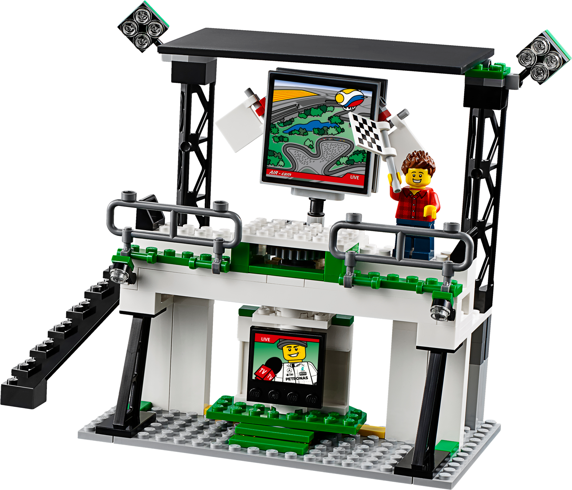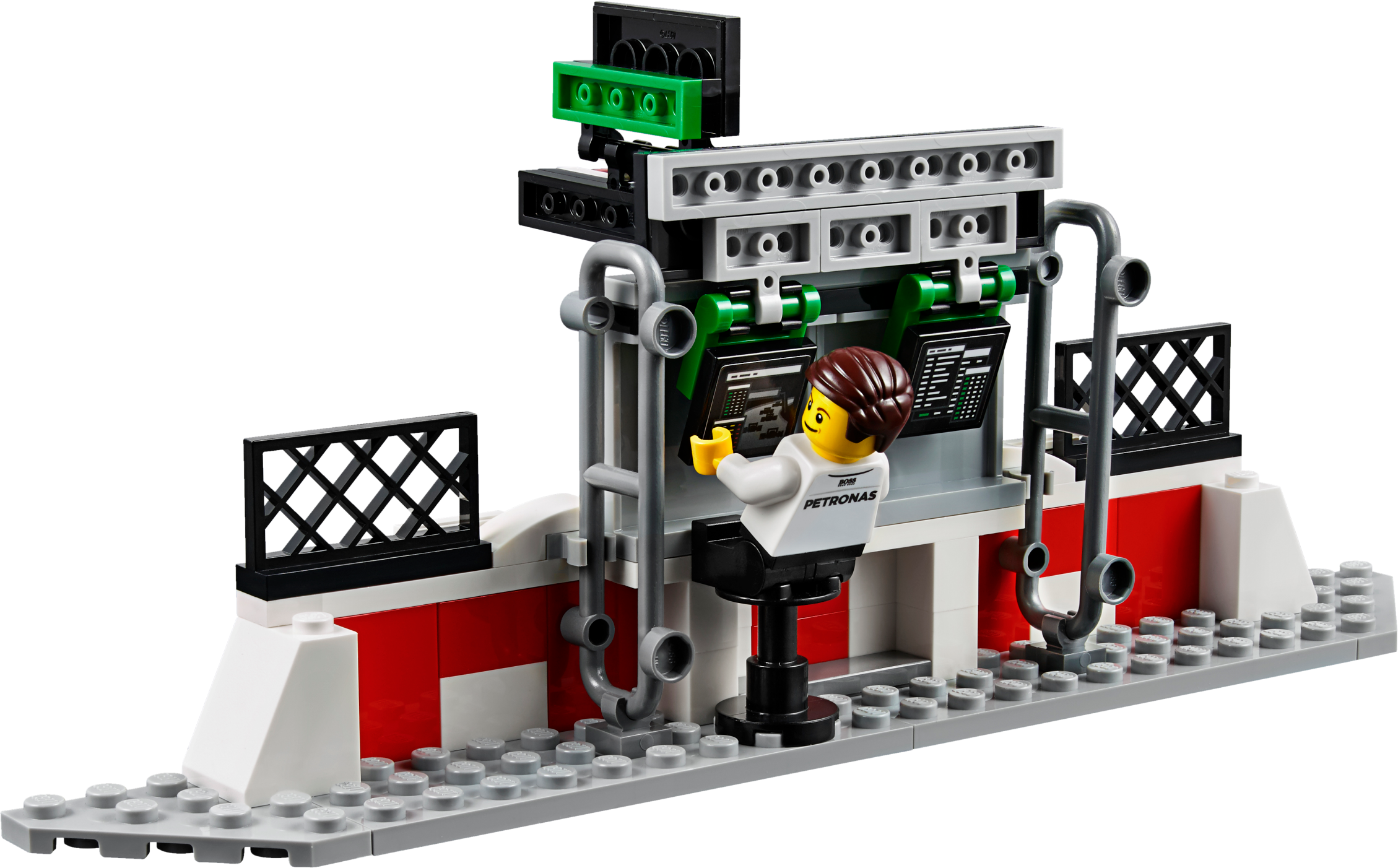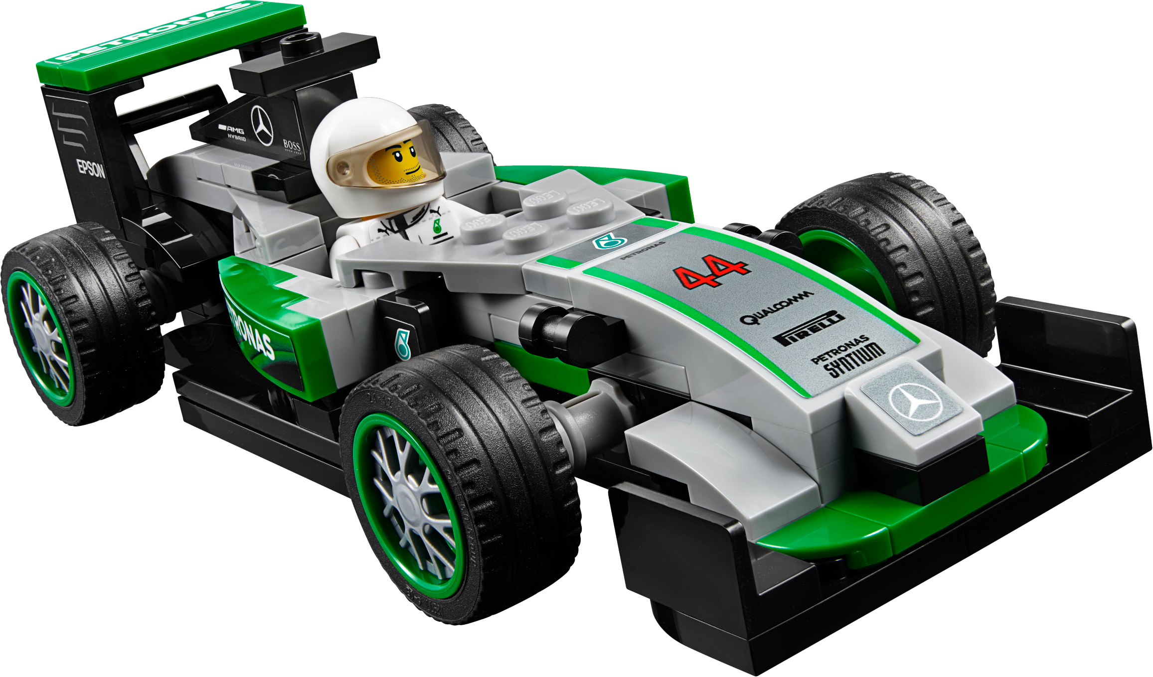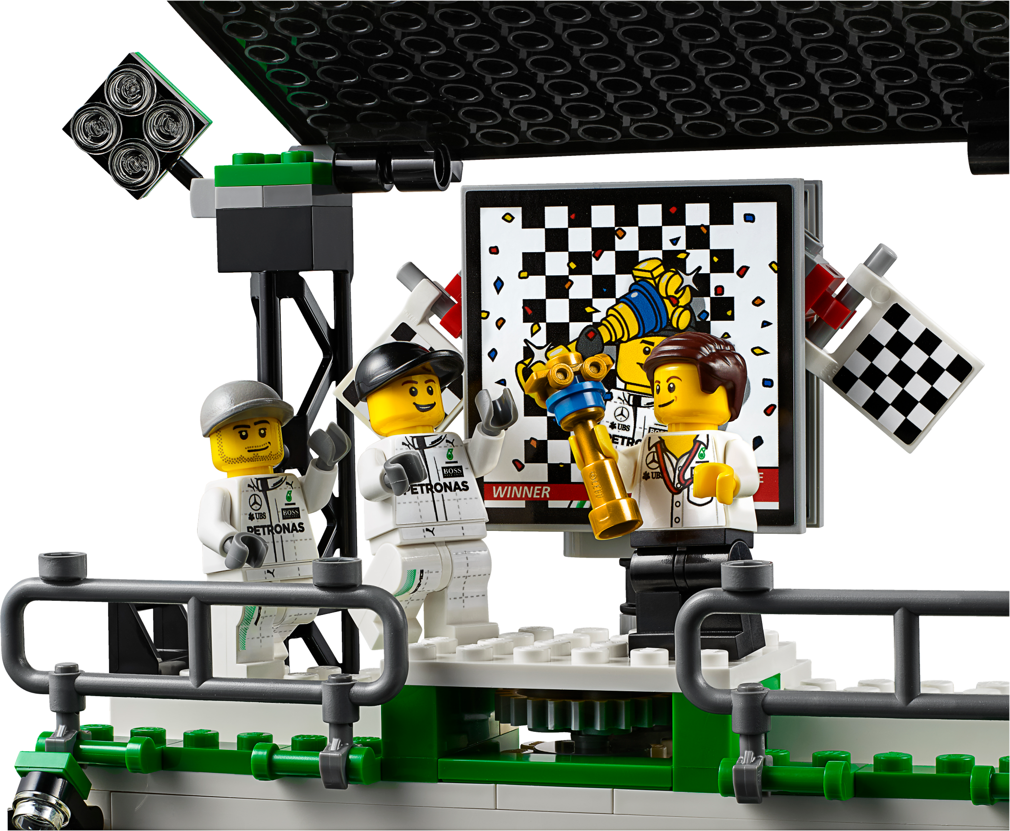 Role-play an entire race day with the MERCEDES AMG PETRONAS Formula One™ Team with this richly detailed LEGO® Speed Champions set, featuring 2 buildable Mercedes F1 W07 Hybrid cars. Packed with play-starting features and functions, it includes a fully equipped pit garage with car jack function, and a pit wall with monitor, checkered flag and translucent start-finish light-style elements. Dial up the big-race atmosphere with the TV camera rig with an adjustable camera arm, plus a grandstand with big screen and rotate function to reveal the winner’s podium. Includes eight minifigures.Includes eight minifigures: two MERCEDES AMG PETRONAS Formula One™ Team drivers, team manager, two engineers, hot dog vendor, cameraman and a race fan.The MERCEDES AMG PETRONAS Formula One™ Team set features a grandstand, pit garage, pit wall, TV rig and two Mercedes F1 W07 Hybrid racing cars.The grandstand has minifigure seats, a media center, big screen with race info graphics and rotate function to reveal the other side of the screen (with winners graphic) and a victory podium with a gold-colored trophy element, plus translucent light elementsThe pit garage includes a car jack function, two mounted computer screens with driver information and assorted elements, including a wheel jack, two spare wheels, two spare wheel caps, five wrenches, drill, oil can, hammer, ‘Stop’ lollipop sign and a team logo.The detailed pit wall includes a start-finish line with translucent green, orange and red light elements, plus a monitor and checkered flag elements.The race-ready, buildable Mercedes F1 W07 Hybrid racing cars each feature a minifigure cockpit, wheels with rubber tires, authentic design details and race livery stickers.Get a bird’s eye view of the race at the hairpin corner with the TV camera rig featuring an adjustable camera arm and camera-style element.Watch the race with the race fan minifigure at the racing corner barrier with a high wall and doorway.Also includes a hot dog stand with a parasol and hot dog element.Accessory elements include two racing driver helmets.This set offers an age-appropriate build and play experience for ages 8+.Grandstand measures over 7” (20cm) high, 8” (21cm) wide and 3” (10cm) deep.Pit garage measures over 5” (14cm) high, 11” (28cm) wide and 7” (18cm) deep.Corner barrier measures over 2” (7cm) high, 8” (22cm) wide and 4” (12cm) deep.Hairpin corner with camera rig measures over 3” (8cm) high, 3” (10cm) wide and 8” (22cm) deep.Pit wall measures over 2” (7cm) high, 7” (19cm) wide and 1” (3cm) deep.Mercedes F1 W07 Hybrid cars each measure over 1” (4cm) high, 5” (14cm) long and 2” (6cm) wide.Hot dog stand measures over 2” (7cm) high, 1” (5cm) wide and 1” (3cm) deep.