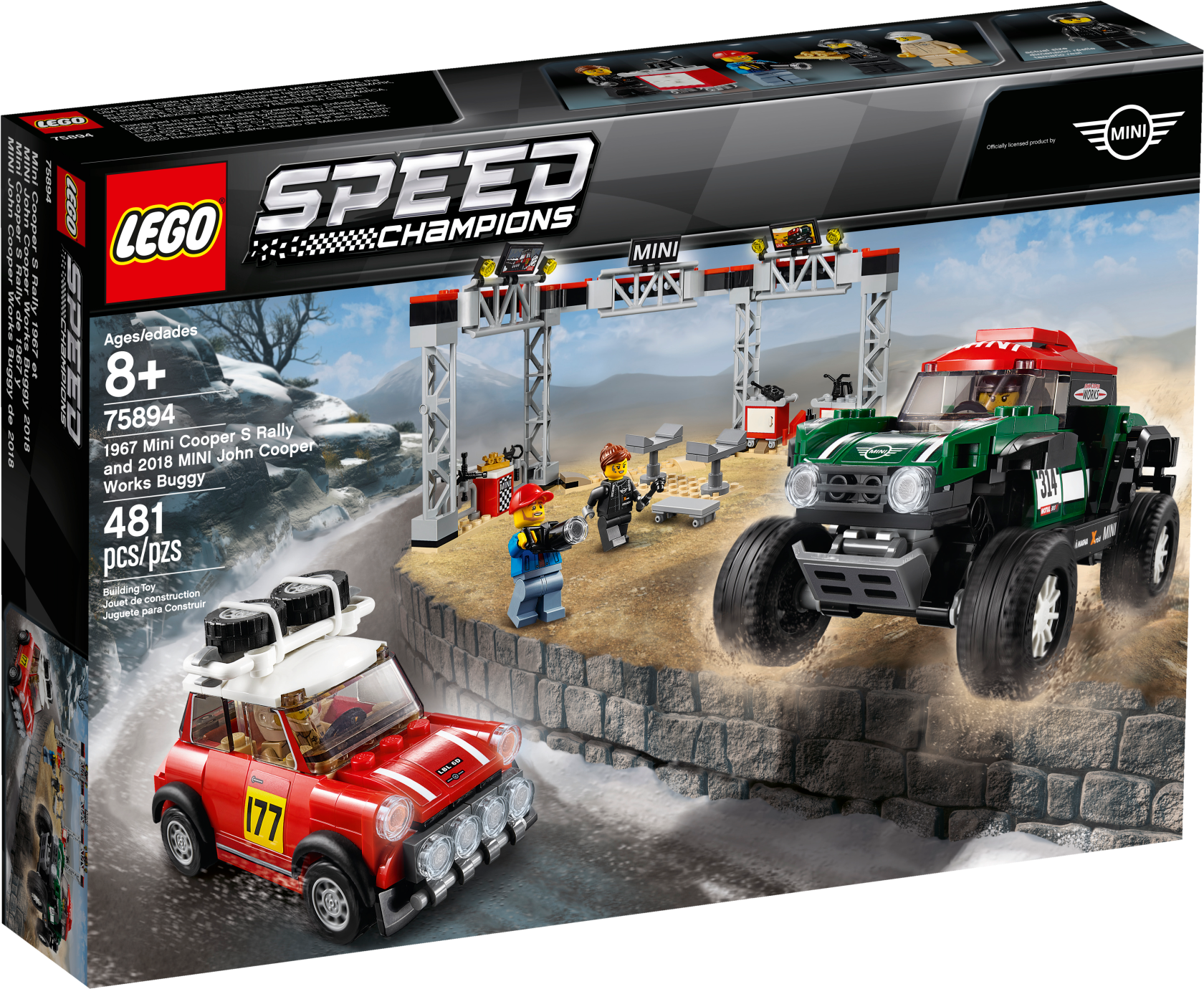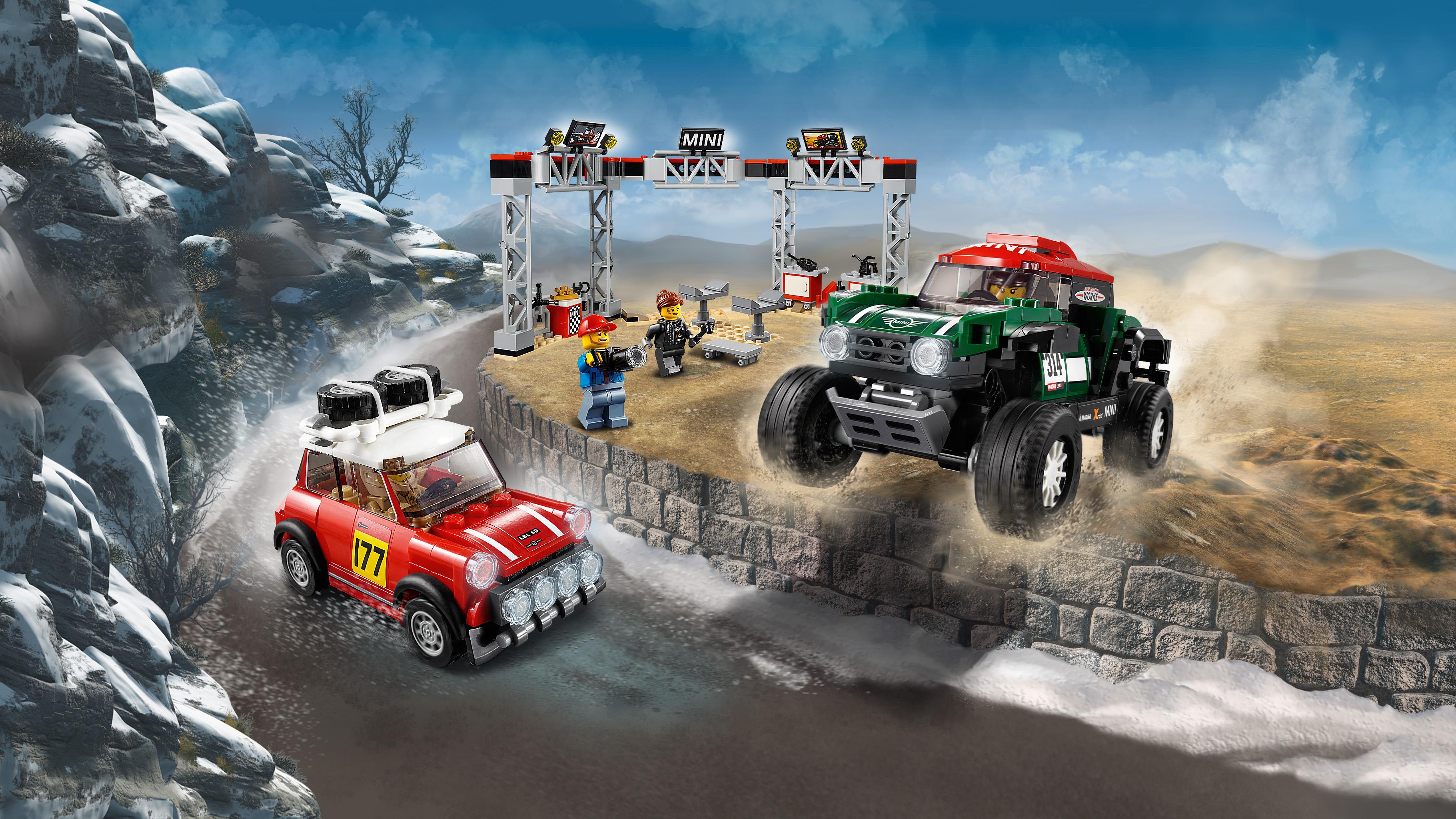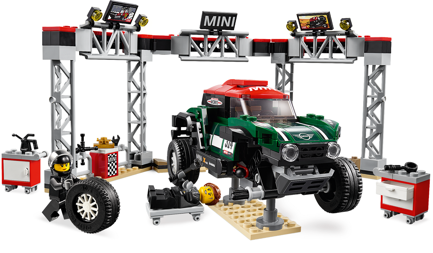 Stage a classic vs. modern rally race with these cool LEGO® Speed Champions 75894 1967 Mini Cooper S Rally and 2018 MINI John Cooper Works Buggy car toys! The 1967 Mini Cooper S Rally features a roof rack with 2 spare tires, just like the original car, while the 2018 MINI John Cooper Works Buggy has suspension to drive over rough terrain. Play out exciting rally racing scenarios with 4 LEGO minifigures and a fully equipped pit stop station, including a buildable car jack stand, a mechanic's creeper, tool racks, assorted tools and computer screen elements. Includes 4 minifigures: Mini Cooper S Rally driver, MINI John Cooper Works Buggy rally driver, race marshal and a mechanic. The race-ready, buildable 1967 Mini Cooper S Rally features a minifigure cockpit, removable windshield, wheels with rubber tires, roof rack with 2 spare tires, racing colors, race-graphics stickers, translucent light-style elements and authentic design details. The speedy, buildable 2018 MINI John Cooper Works Buggy features a minifigure cockpit, removable windshield, wheels with rubber tires, suspension, racing colors, race-graphics stickers, translucent light-style elements and authentic design details. Remove the windshields to place a minifigure in each car. Pit stop station features tool racks, a buildable car jack stand, 2 mobile opening tool cabinets, a mechanic's creeper with wheels and assorted elements including 2 TV screens, a ‘MINI' sign, trophy, gas can, camera, flag and various tools. Place a car on the jack stand and use the mechanic's creeper to check underneath. Accessory elements include a helmet for each driver and the race marshal’s cap and checkered flag. 1967 Mini Cooper S Rally toy car for kids measures over 2” (6cm) high, 3” (9cm) long and 1” (4cm) wide. 2018 MINI John Cooper Works Buggy measures over 2” (7cm) high, 5” (13cm) long and 2” (7cm) wide. Pit stop station measures over 5” (13cm) high, 11” (30cm) wide and 4” (12cm) deep.