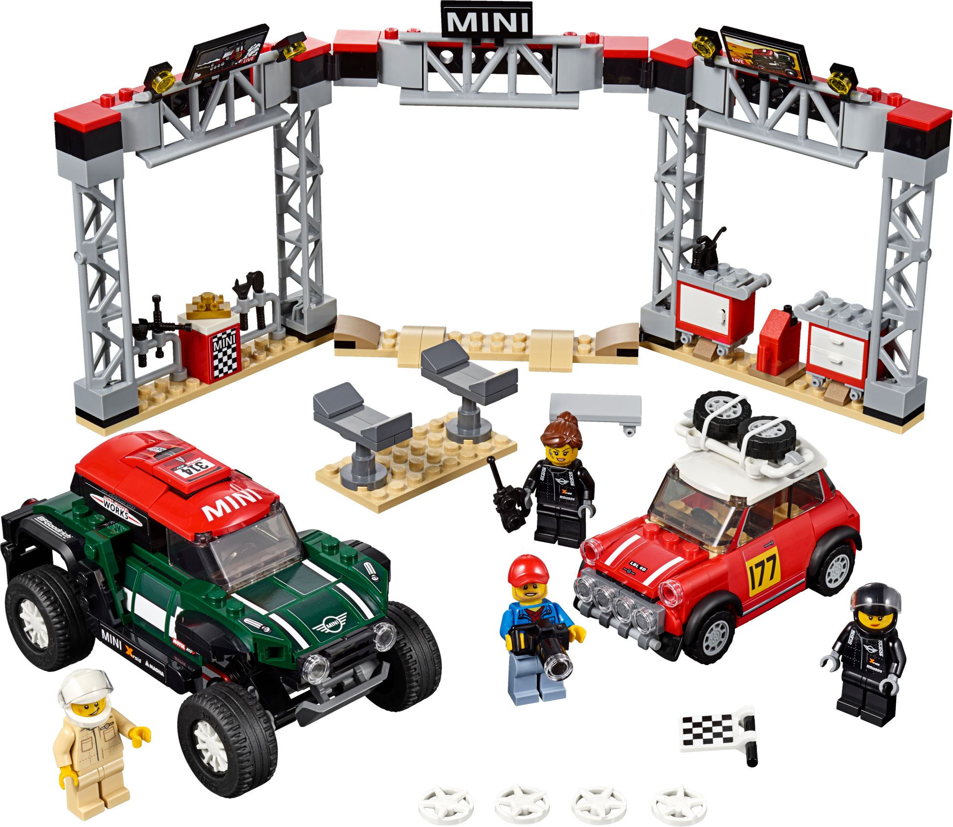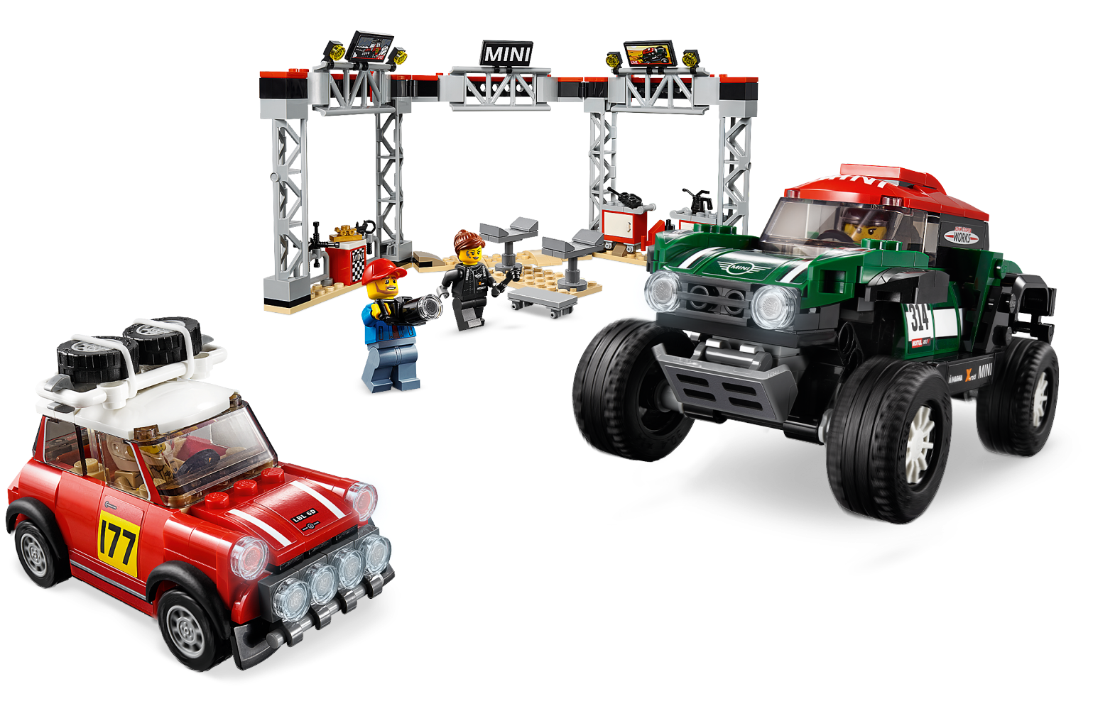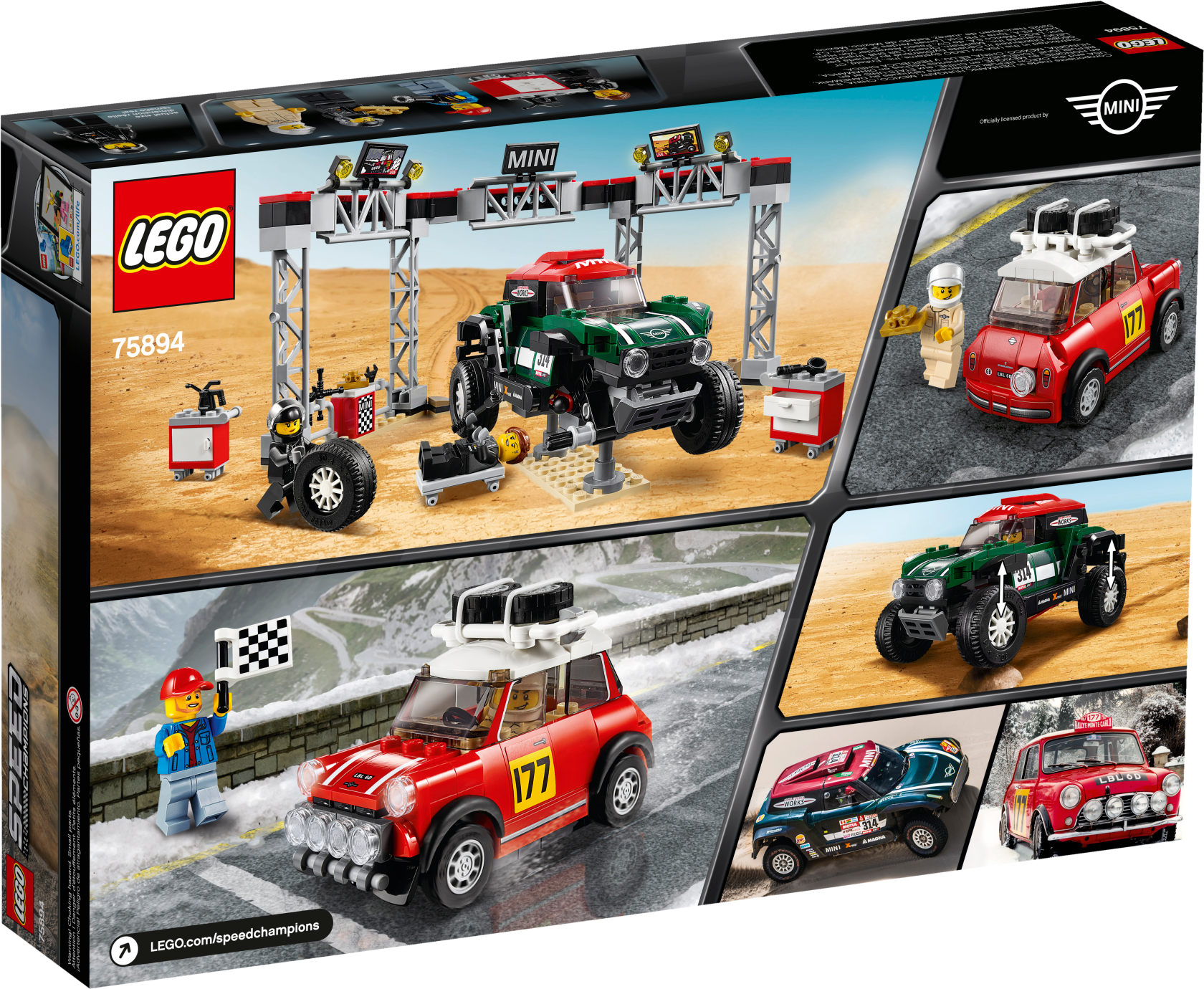 Stage a classic vs. modern rally race with these cool LEGO® Speed Champions 75894 1967 Mini Cooper S Rally and 2018 MINI John Cooper Works Buggy car toys! The 1967 Mini Cooper S Rally features a roof rack with 2 spare tires, just like the original car, while the 2018 MINI John Cooper Works Buggy has suspension to drive over rough terrain. Play out exciting rally racing scenarios with 4 LEGO minifigures and a fully equipped pit stop station, including a buildable car jack stand, a mechanic's creeper, tool racks, assorted tools and computer screen elements. Includes 4 minifigures: Mini Cooper S Rally driver, MINI John Cooper Works Buggy rally driver, race marshal and a mechanic. The race-ready, buildable 1967 Mini Cooper S Rally features a minifigure cockpit, removable windshield, wheels with rubber tires, roof rack with 2 spare tires, racing colors, race-graphics stickers, translucent light-style elements and authentic design details. The speedy, buildable 2018 MINI John Cooper Works Buggy features a minifigure cockpit, removable windshield, wheels with rubber tires, suspension, racing colors, race-graphics stickers, translucent light-style elements and authentic design details. Remove the windshields to place a minifigure in each car. Pit stop station features tool racks, a buildable car jack stand, 2 mobile opening tool cabinets, a mechanic's creeper with wheels and assorted elements including 2 TV screens, a ‘MINI' sign, trophy, gas can, camera, flag and various tools. Place a car on the jack stand and use the mechanic's creeper to check underneath. Accessory elements include a helmet for each driver and the race marshal’s cap and checkered flag. 1967 Mini Cooper S Rally toy car for kids measures over 2” (6cm) high, 3” (9cm) long and 1” (4cm) wide. 2018 MINI John Cooper Works Buggy measures over 2” (7cm) high, 5” (13cm) long and 2” (7cm) wide. Pit stop station measures over 5” (13cm) high, 11” (30cm) wide and 4” (12cm) deep.