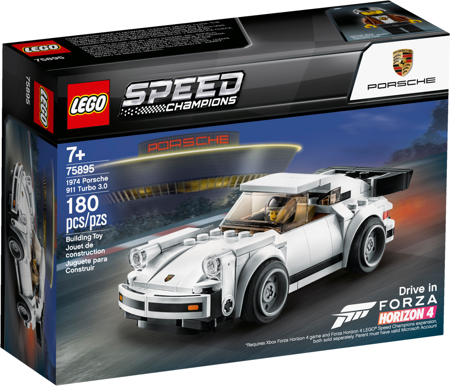 Porsche fans will love to build, race and proudly display the LEGO® Speed Champions 75895 1974 Porsche 911 Turbo 3.0. This white, collectible toy car model for kids of one of the world’s most recognizable classic sports cars features a minifigure cockpit with a removable windshield and is packed with authentic details, including the iconic ‘whale tail' rear spoiler. A classic Porsche 911 driver minifigure and 3 cones to play out race scenarios are also included in this LEGO car set. Fans can add an exciting digital dimension to their racing play and ‘drive’ this car in the Forza Horizon 4 LEGO Speed Champions expansion pack (sold separately). This model car kit includes a new-for-August-2019 classic Porsche 911 driver minifigure. The white, buildable 1974 Porsche 911 Turbo 3.0 toy car for kids features a minifigure cockpit with removable windshield, wheels with rubber racing tires and authentic design details such as the 911 Turbo's iconic ‘whale tail' rear spoiler. Remove the windshield to place the minifigure in the car. Accessory elements include the Porsche 911 driver's helmet, plus 3 cones for racing play action. Kids can add an exciting digital dimension to their racing play and ‘drive’ this car in the Forza Horizon 4 LEGO® Speed Champions expansion pack (sold separately). This cool toy model car for kids makes a great birthday gift. 1974 Porsche 911 Turbo 3.0 measures over 1” (4cm) high, 5” (15cm) long and 2” (6cm) wide.