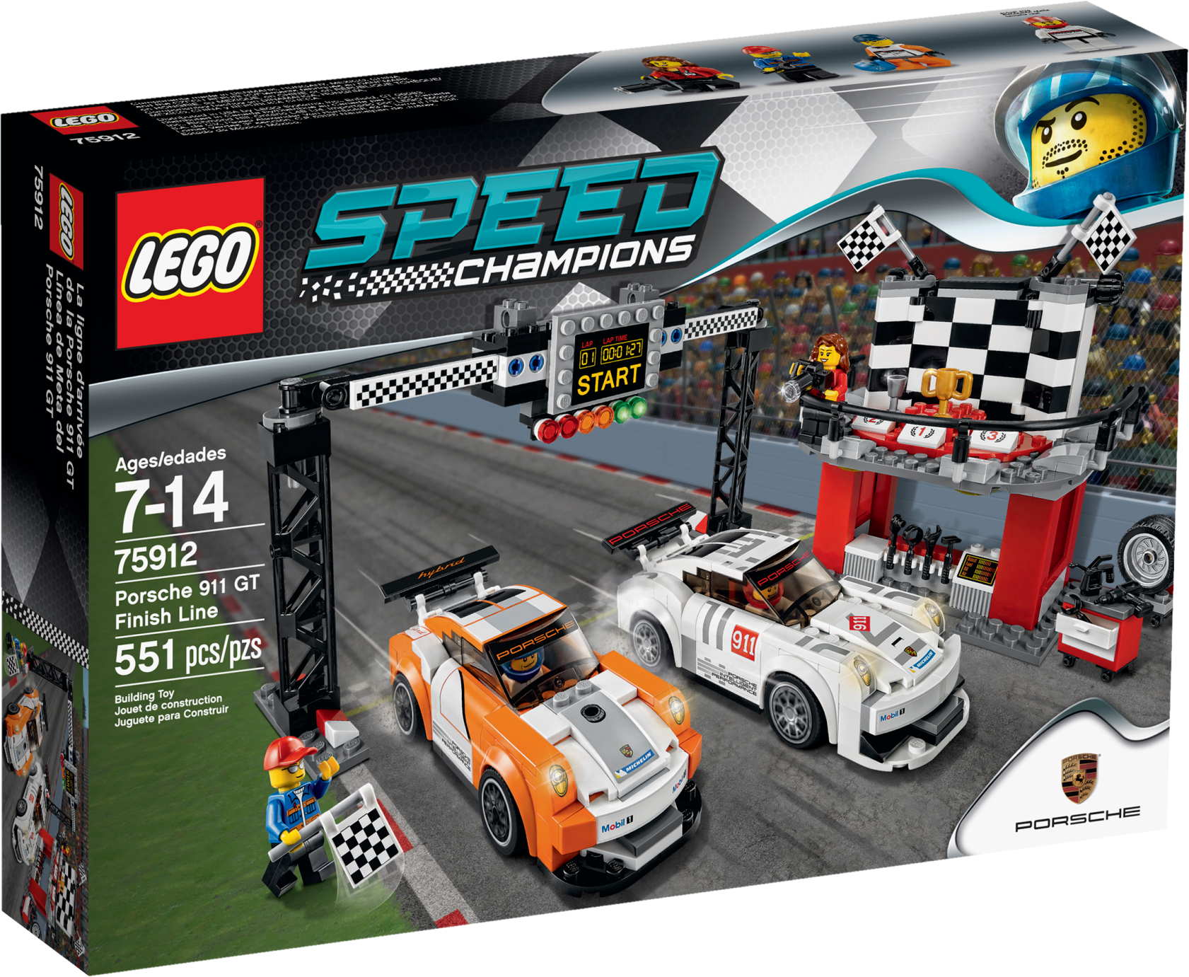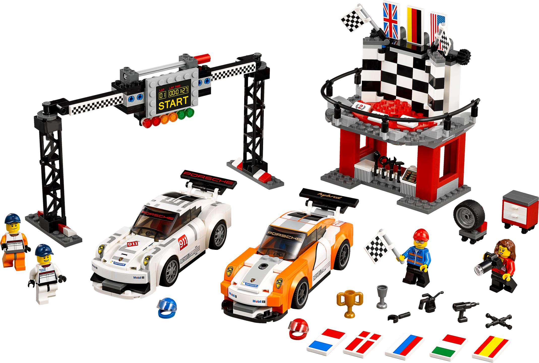 Race for a podium position in your Porsche 911 GT! Race against your friends and claim a place on the podium with this exciting LEGO® Speed Champions play set. Prep the 2 powerful, Porsche 911 GT race cars with the tools in the mini-garage. Attach the unique Porsche 911 wheel trims to make your car look super-sleek and then drive to the start-finish line. Activate the dropping start lights and it’s red, amber, green for go! Capture all the action with the camerawoman as you race to be first past the checkered flag. Then climb up to the podium for the prize-giving ceremony. Accept your trophy and stand proudly as the national flags are raised! Includes 4 minifigures with assorted accessories: 2 Porsche drivers, a camerawoman and a race marshal. Includes 4 minifigures with assorted accessories: 2 Porsche drivers, a camerawoman and a race marshal. Start/finish line features a race-starting lights function with translucent red, amber and green elements Podium/mini-garage features a national flag-raising function for prize ceremony, 8 interchangeable national flags (Denmark, France, Germany, Italy, Russia, Spain, UK and USA), 2 checkered flags, 1st, 2nd and 3rd position tags, golden trophy, silver-colored trophy, mini-garage withsmall work station, tool trolley with assorted tools, and a spare wheel with a trolley. Porsche 911 GT race cars each feature a removable windscreen, driver’s cockpit and unique Porsche 911 wheel trims Driver outfits feature Porsche race team decoration Accessories include 2 driver’s helmets, 2 winner’s caps, flag man’s cap, checkered flag and a TV camera Work on the Porsche 911 GT cars at the mini-garage Attach the special wheel trims Remove the windscreens to place the minifigure in the cockpit Drop the red, amber and green start lights one by one to start the race Capture the race action with the camerawoman Compete against your friends to win the golden trophy! Celebrate victory on top of the podium Raise the national flags in the prize-giving ceremony Start/finish line measures over 5” (13cm) high, 8” (21cm) wide and 3” (8cm) deep Podium/mini-garage measures over 5” (15cm) high, 4” (12cm) wide and 3” (9cm) deep Porsche 911 GT cars each measure over 1” (4cm) high, 5” (15cm) long and 1” (5cm) wide
