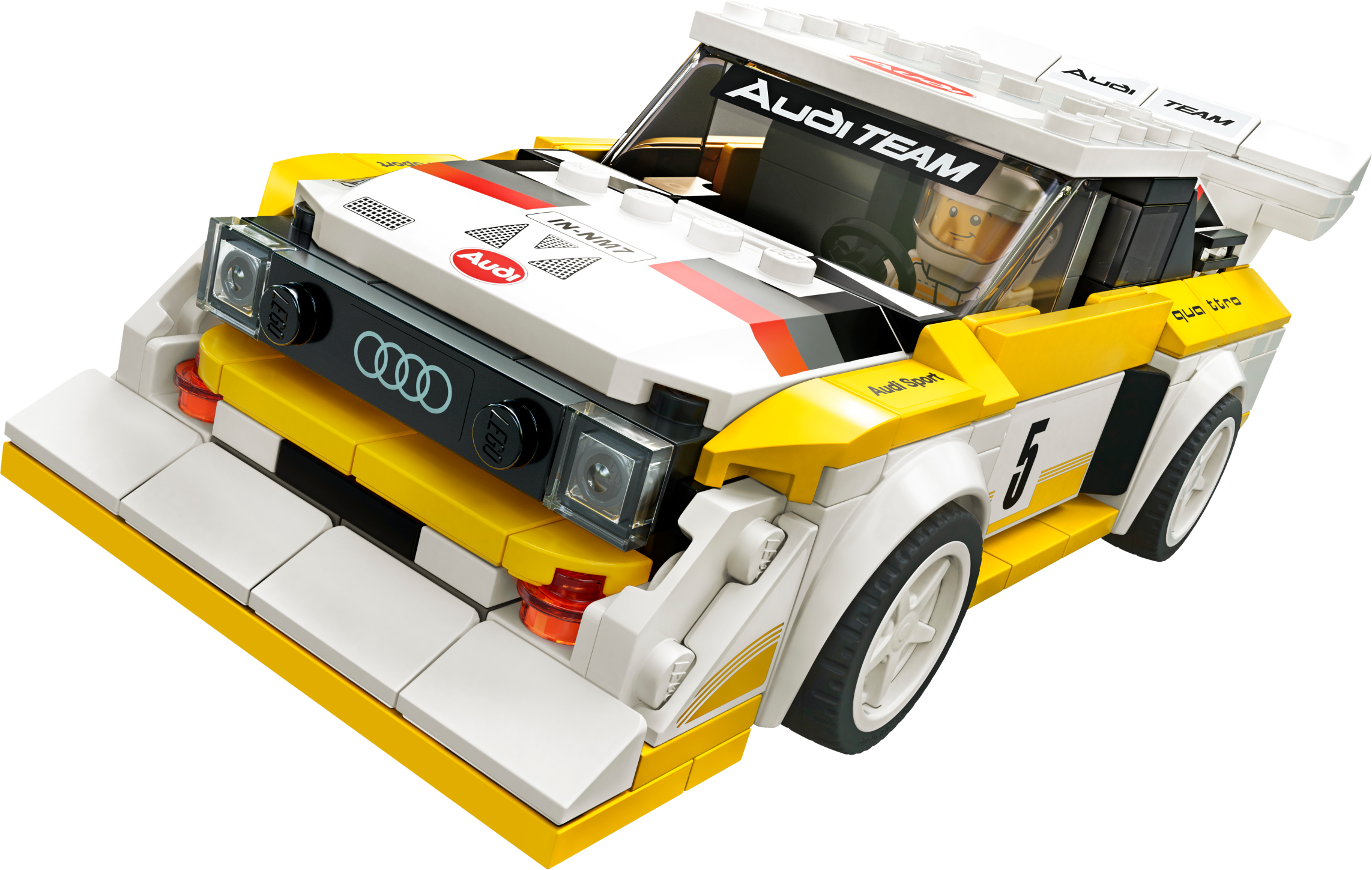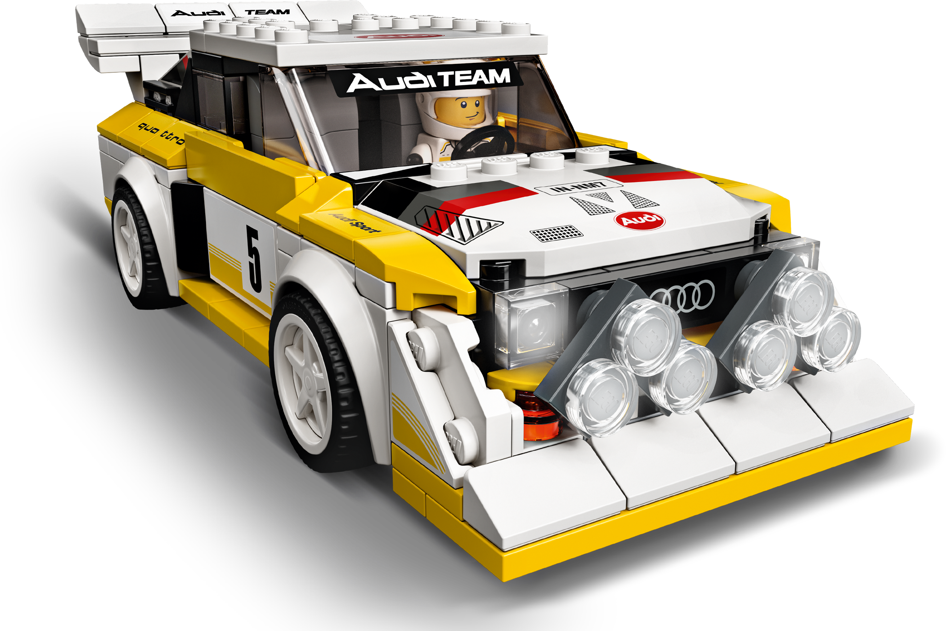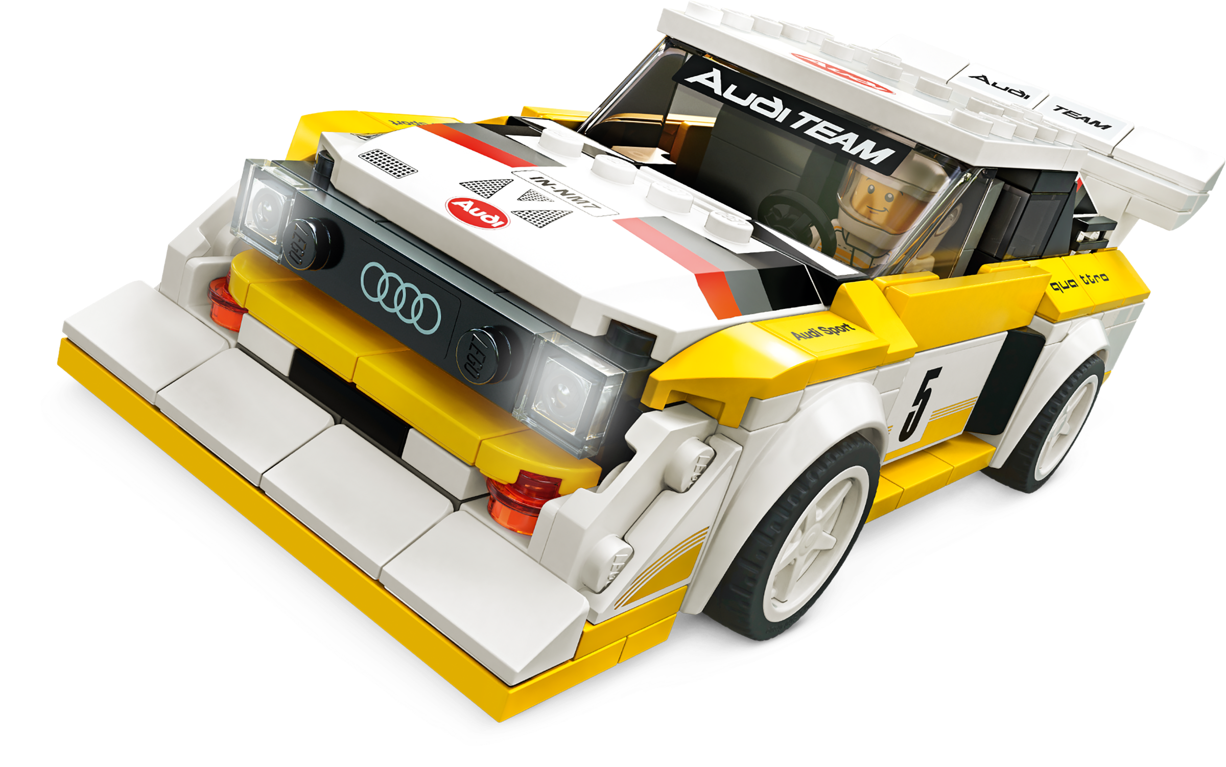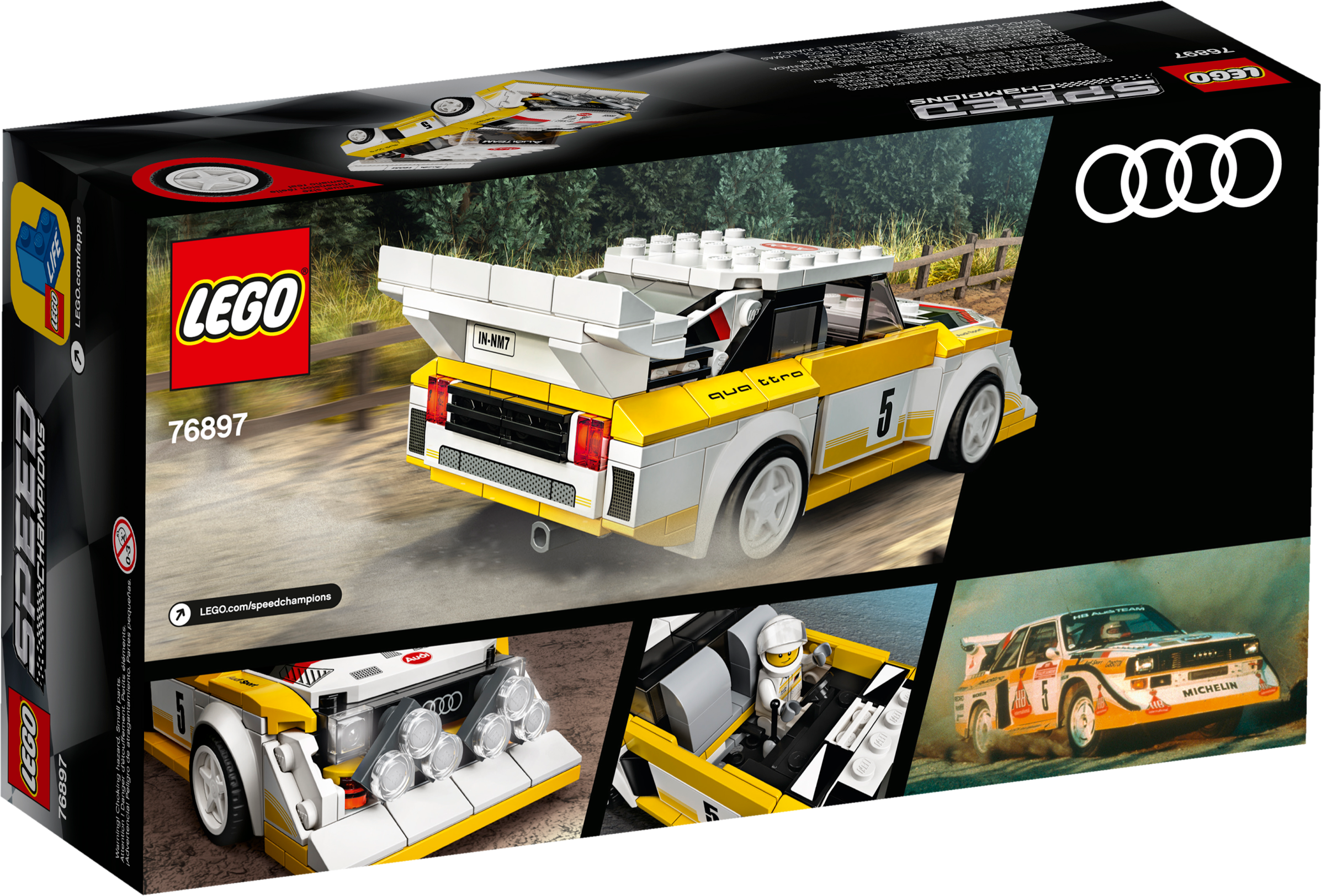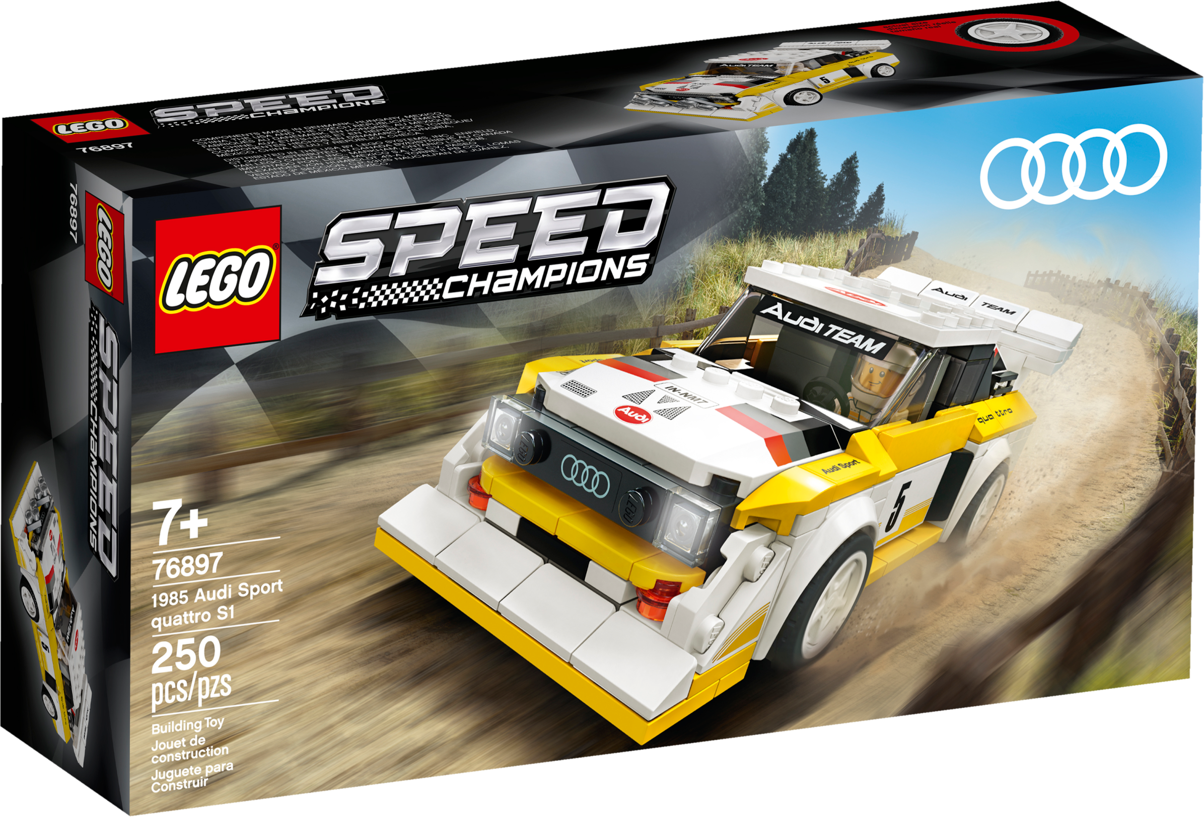 The 1985 Audi Sport quattro S1 (76897) was one of the kings of the Group B rally racing circuit. Race fans can now construct their own car toy of this beloved model from LEGO® building bricks. Celebrate the 35th anniversary of the quattro by owning a model car replicating this rally icon. A classic rally car reborn!This racing car model of the famous 1985 Audi Sport quattro S1 brilliantly reflects the original with its famous yellow and white livery, front engine, bulked-up bumper and vast rear wing. This model car kit also comes with a minifigure in an Audi Sport quattro race suit. Jump behind the wheel of this Audi toy car and make a lasting impression – just like the original did! Recreate all the drama of the racetrackLEGO Speed Champions building kits provide car fans of all ages with the chance to create racing toys of their favourite models and recreate the thrills of the racetrack. New for January 2020, these cool replicas are now more realistic and 25% bigger than ever before.