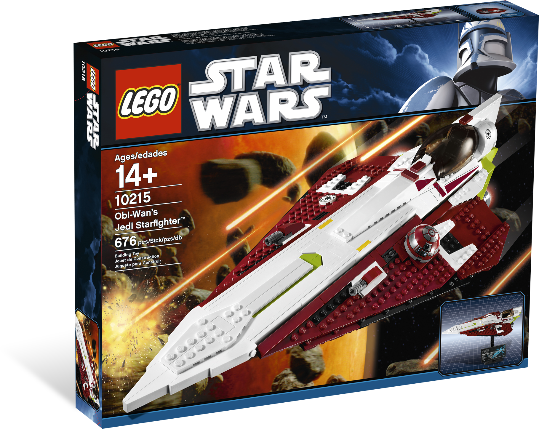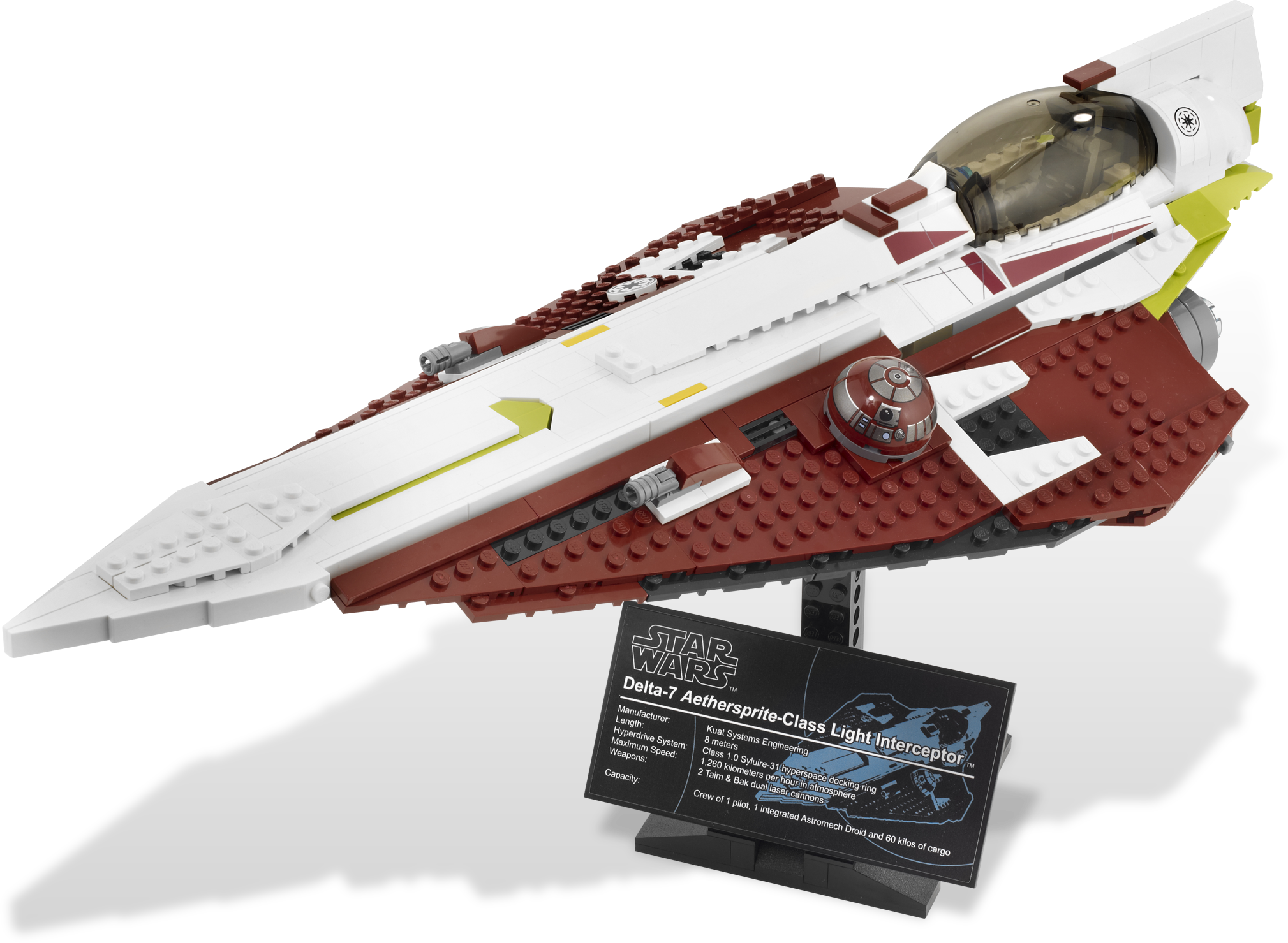 Blast off into The Clone Wars with Obi-Wan's collector-series Jedi starfighter! Now, you can build the ultimate LEGO version of Jedi general Obi-Wan Kenobi's Delta-7 Aethersprite-class Jedi starfighter! Larger and more detailed than any previous Jedi starfighter model, this limited-edition collector vehicle is equipped with twin laser cannons, a full cockpit interior and a wing-mounted R4-P17 astromech droid dome that rotates. With a buildable display stand and plaque, it's just the thing to pursue bounty hunter Jango Fett across the galaxy or battle swarms of Separatist fighters in space! Measures 9 in (23 cm) high on stand, 18" (47 cm) long and 9" (22 cm) wide when built.Ultimate Collector's Series Obi-Wan's Jedi Starfighter!Equipped with twin laser cannons!Features fully detailed cockpit interior!The dome of Obi-Wan's wing mounted R4-P17 astromech droid rotates!Includes display stand, plaque and label sheet!Model can be detached from display stand!Measures 9 in (23 cm) high on stand, 18" (47 cm) long and 9" (22 cm) wide when built!