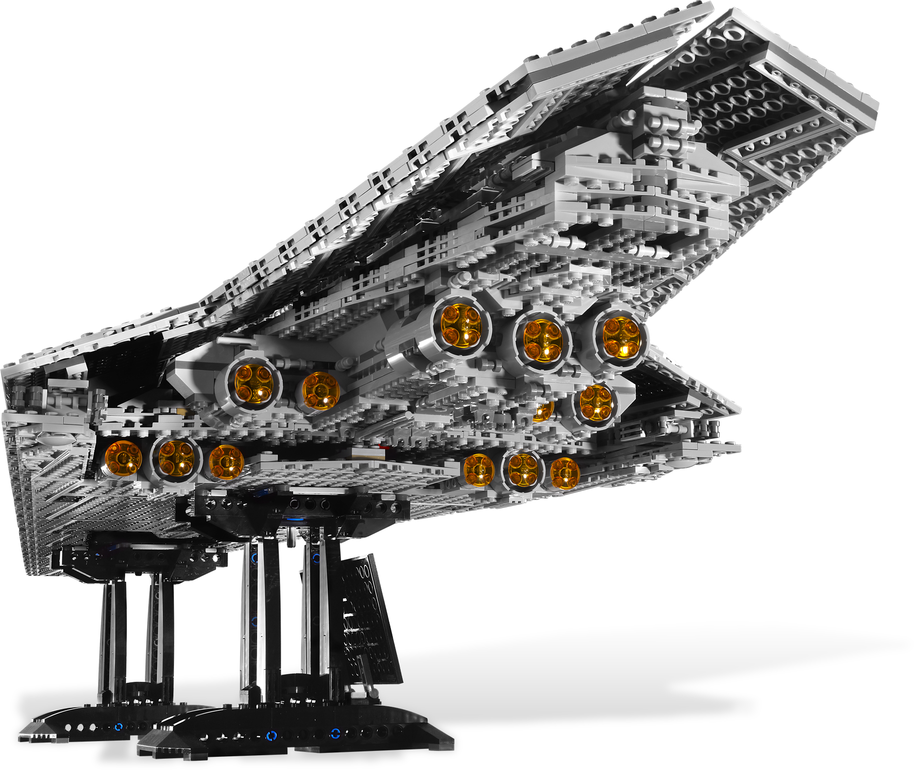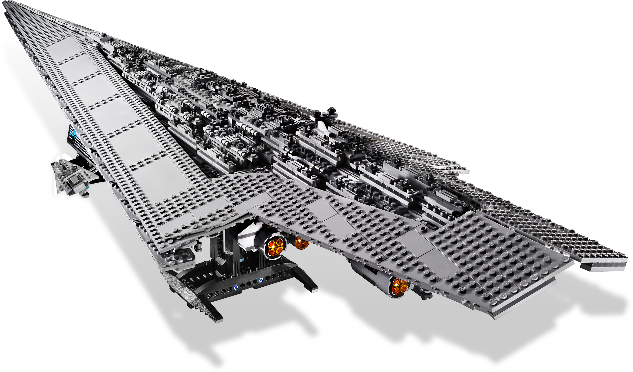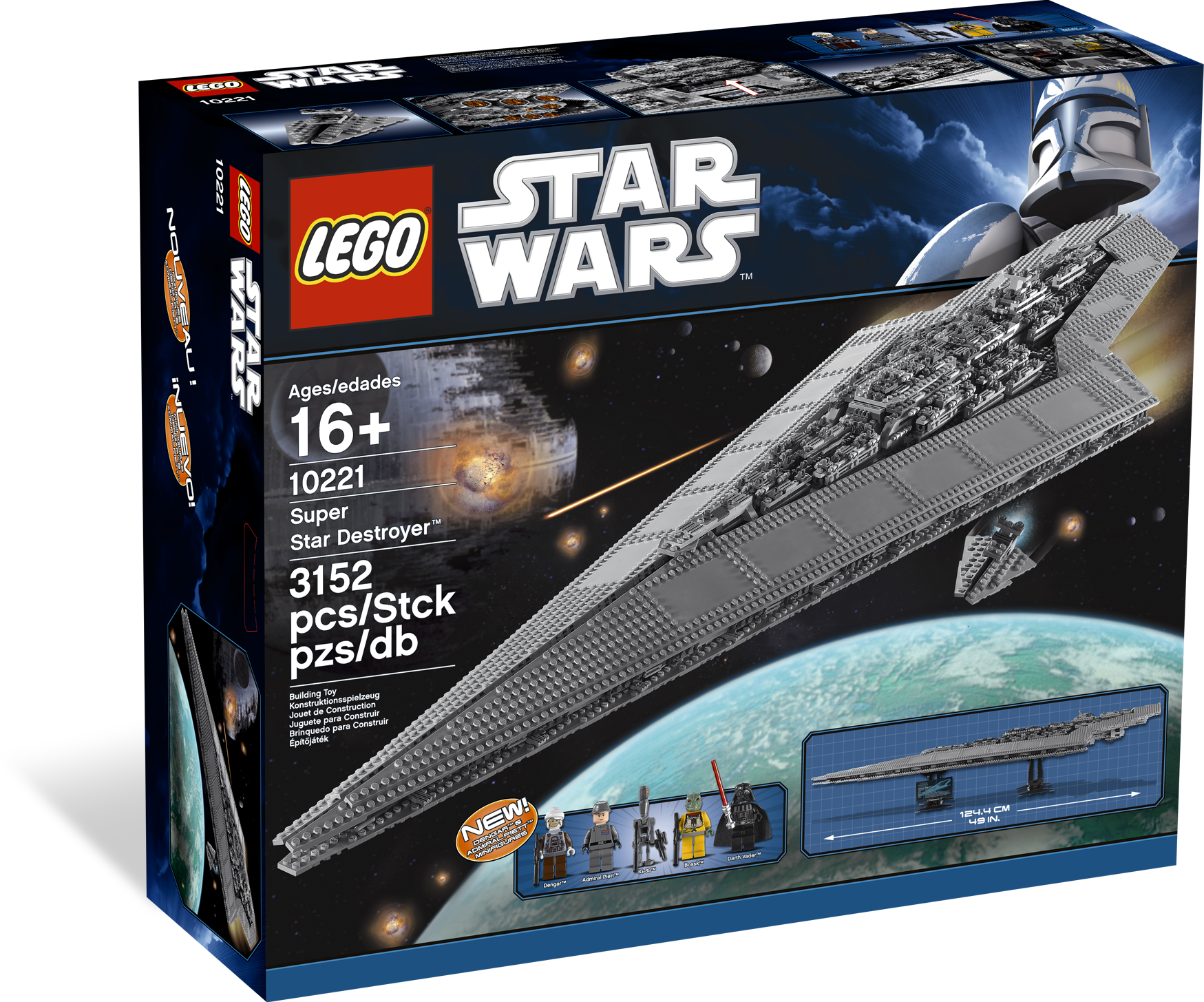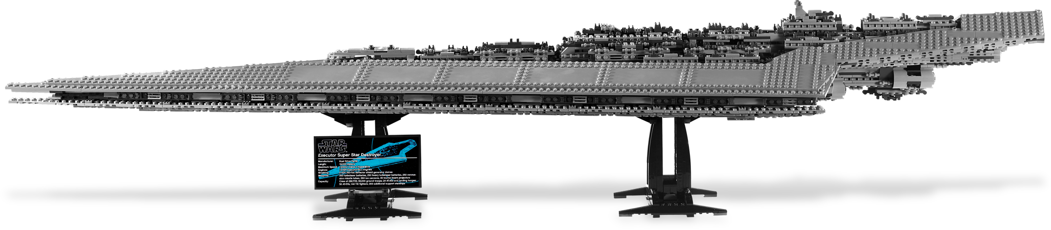 Dare to pilot Darth Vader’s™ deadly destroyer! The Super Star Destroyer Executor has arrived! This jaw-dropping vessel is the personal flagship of Darth Vader, and serves as command ship at both the Battle of Hoth and the Battle of Endor. With its classic dagger-shaped design, the Executor is among the largest and most powerful vessels in the Star Wars galaxy. With over 3,000 pieces, measuring nearly 50 inches (124.5 cm) long and weighing nearly 8 pounds (3.5 kg), every aspect of this fantastic LEGO® Star Wars model impresses. Includes 5 minifigures: Darth Vader, Admiral Piett, Dengar, Bossk and IG-88.Includes 5 minifigures: Darth Vader, Admiral Piett, Dengar, Bossk and IG-88Features over 3,000 pieces!Measures nearly 50 inches (124.5 cm) long and weighs nearly 8 pounds (3.5kg)!Includes display stand and data sheet label!Center section lifts off to reveal command center!