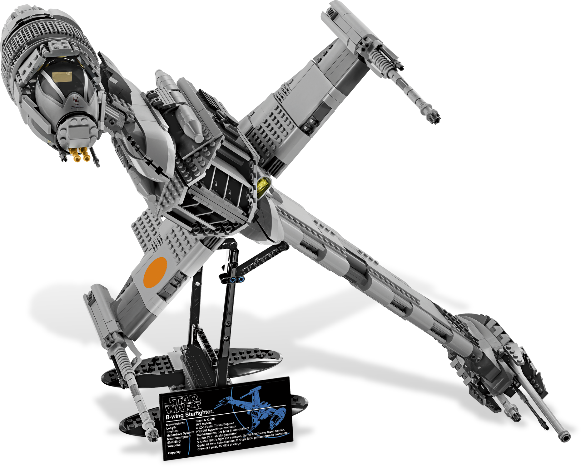 Take on the Empire in the ultimate collector series B-wing Starfighter™! Now you can experience the ultimate B-wing Starfighter from the Star Wars galaxy like never before. This fantastic model features everything you would expect from our premium collector range, including rotating, self-levelling cockpit and realistic wing configurations for landing and flight. And when you're finished battling in the skies above Endor or helping to restore freedom in the galaxy, place this highly detailed B-wing Starfighter on its own dedicated display stand and fact plaque. Measures 26” (66cm) wide and 15” (38cm) high in flight configuration, and 17” (43cm) high on display stand.Ultimate Collector Series B-wing Starfighter!Rotating, self-levelling cockpit!Landing and flight wing configurations!Highly detailed model!Includes display stand and fact plaque!Model can be detached from display stand!Measures 26” (66cm) wide and 15” (38cm) high in flight configuration, and 17” (43cm) high when mounted on display stand!