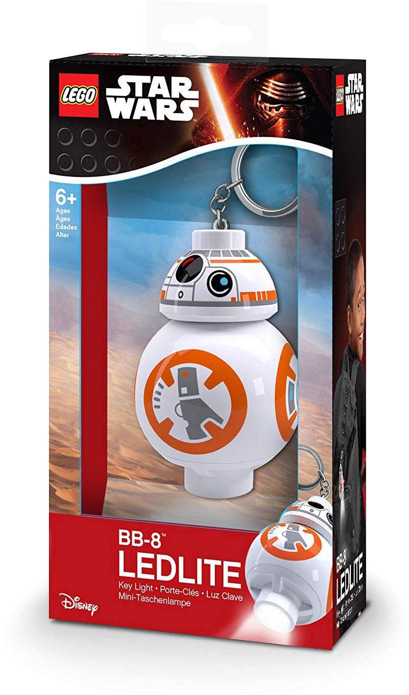 Always shine with the BB-8 Key Light! This large LEGO® brick version of the adorable droid from the Star Wars universe comes complete with a sturdy key ring and chain and features a bright LED light—simply touch the sensor on the body to light up the dark side. Features a BB-8 key chain with a bright LED light. Touch the sensor on the body to activate the light. Switch with auto shut-off saves battery power. Batteries are included. BB-8 figure stands over 2” (7cm) tall.