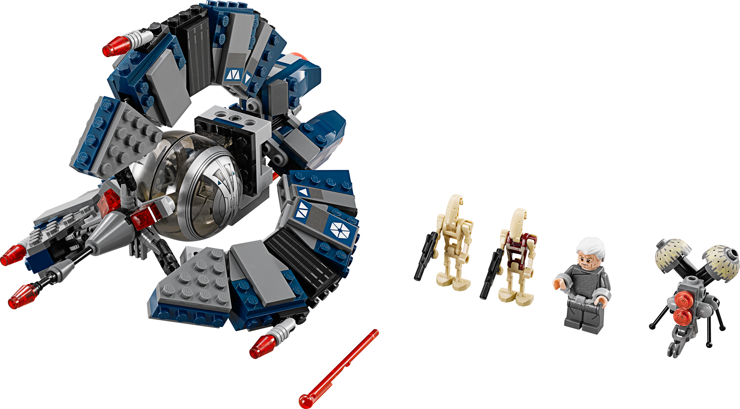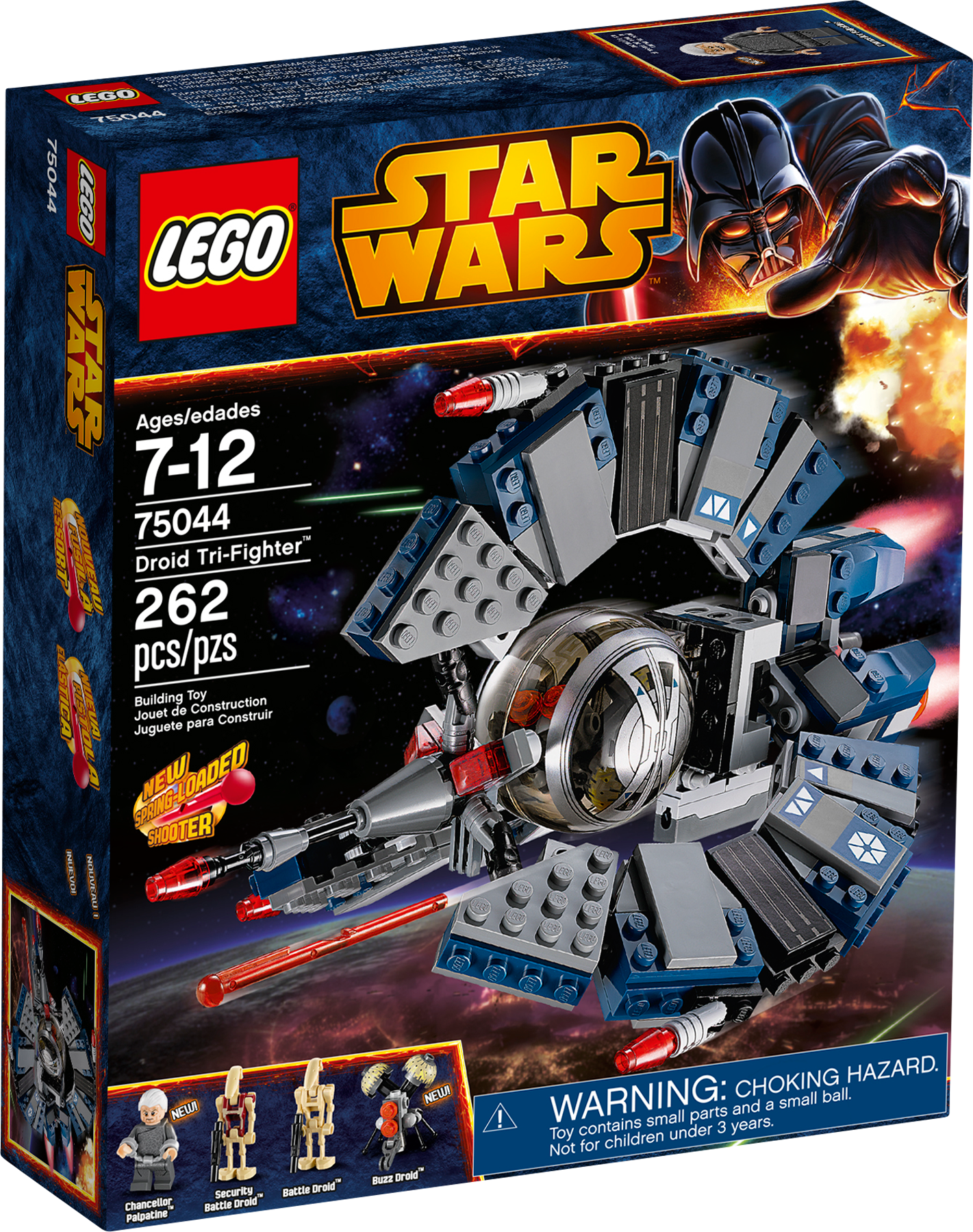 Intercept the Jedi with the super-agile Droid Tri-Fighter™! Chancellor Palpatine™ has been captured and must be taken away before the Jedi are able to retrieve him! Chase them down in the super-agile Droid Tri-Fighter™ with unique tri-wing design. When they come into range, fire the new spring-loaded blasters and release the deadly Buzz Droid™. Those Jedi won’t know what hit them! Includes Chancellor Palpatine™ minifigure and Buzz Droid™, Security Battle Droid™ and Battle Droid™ figures with assorted weapons and an accessory.Includes Chancellor Palpatine™ minifigure and Buzz Droid™, Security Battle Droid™ and Battle Droid™ figures with assorted weapons and an accessoryFeatures unique tri-wing design, new bottom-mounted, spring-loaded shooter, opening center sphere and a Buzz Droid™Includes 2 blastersAlso includes handcuffsIntercept the Jedi enemy and fire the new spring-loaded shooterOpen the sphere and release the deadly Buzz Droid™Fly circles around the enemy starshipsRecreate exciting battle scenes from Star Wars: Episode III Revenge of the SithMeasures over 5” (13cm) high, 7” (20cm) long and 5” (14cm) wideCreate an even more exciting Battle of Coruscant with 75038 Jedi™ Interceptor