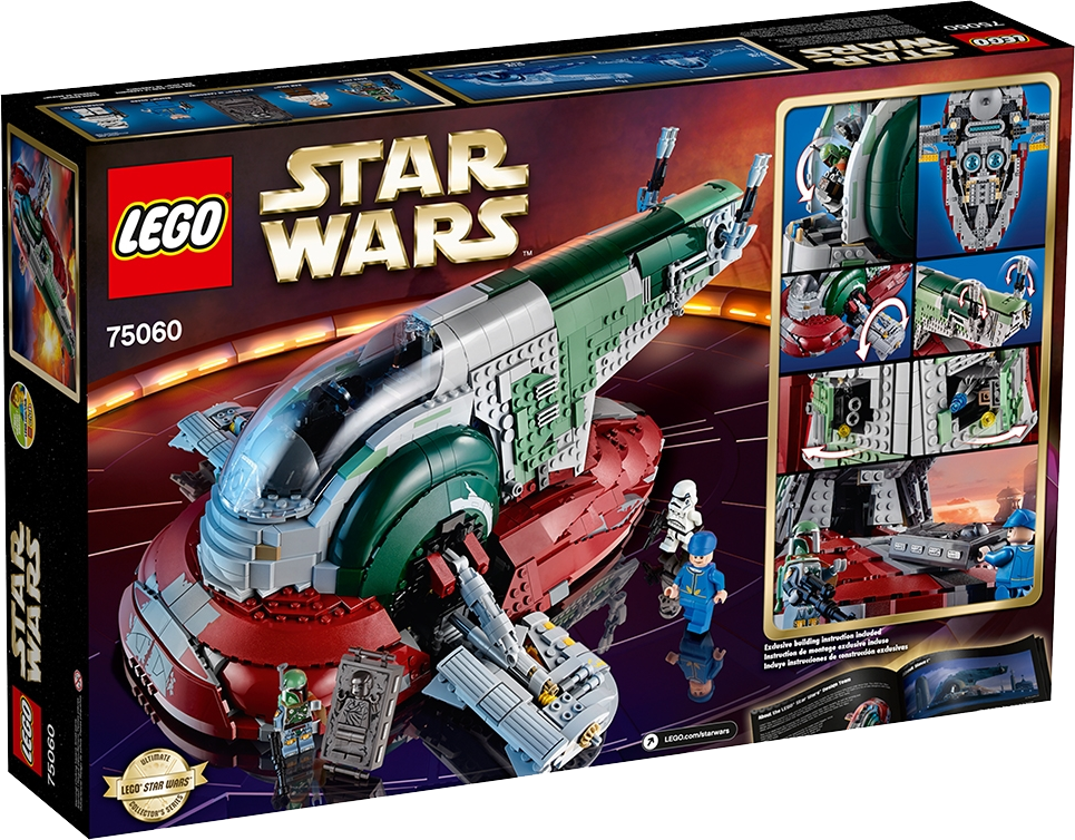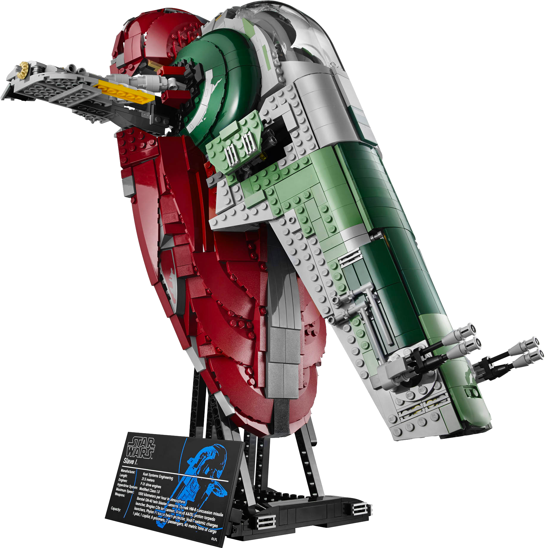 Lift off for bounty-hunting adventures in the Slave I! Track down fugitives with legendary bounty hunter, Boba Fett™ aboard the powerful Slave I! This exclusive LEGO® Star Wars™ model features a rotating cockpit and wings for flight and landing mode, plus dual shooters and hidden blasters to repel attackers. Reenact the capture of Han Solo™ in Star Wars™: Episode V The Empire Strikes Back and take off from Bespin with the carbonite-imprisoned Rebel hero in the cargo hold. Attach the stand to display this iconic ship in characteristic upright flight. Includes 4 minifigures with weapons: Boba Fett™, Bespin Guard™, Stormtrooper™ and Han Solo™. Includes 4 minifigures with weapons: Boba Fett™, Bespin Guard™, Stormtrooper™ and Han Solo™ Also includes Han Solo™ in carbonite! Features a rotating cockpit and wings, opening side hatches with hidden guns and missiles, 2 rotating dual shooters, cargo hold and a display stand with data sheet Weapons include special blaster pistol for Boba Fett™, blaster pistol for Bespin Guard™ and a blaster rifle for the Stormtrooper™ Boba Fett™ and Bespin Guard™ minifigures are unique to this set Rotate the cockpit and wings for flight and landing mode Place carbonite-imprisoned Han Solo™ in the cargo hold Open the side hatches to unleash missiles from the hidden guns Showcase the huge Slave I in upright flight on the display stand Recreate classic scenes from Star Wars™: Episode V The Empire Strikes Back Measures over 7” (20cm) high, 17” (45cm) long and 14” (37cm) wide in landing mode