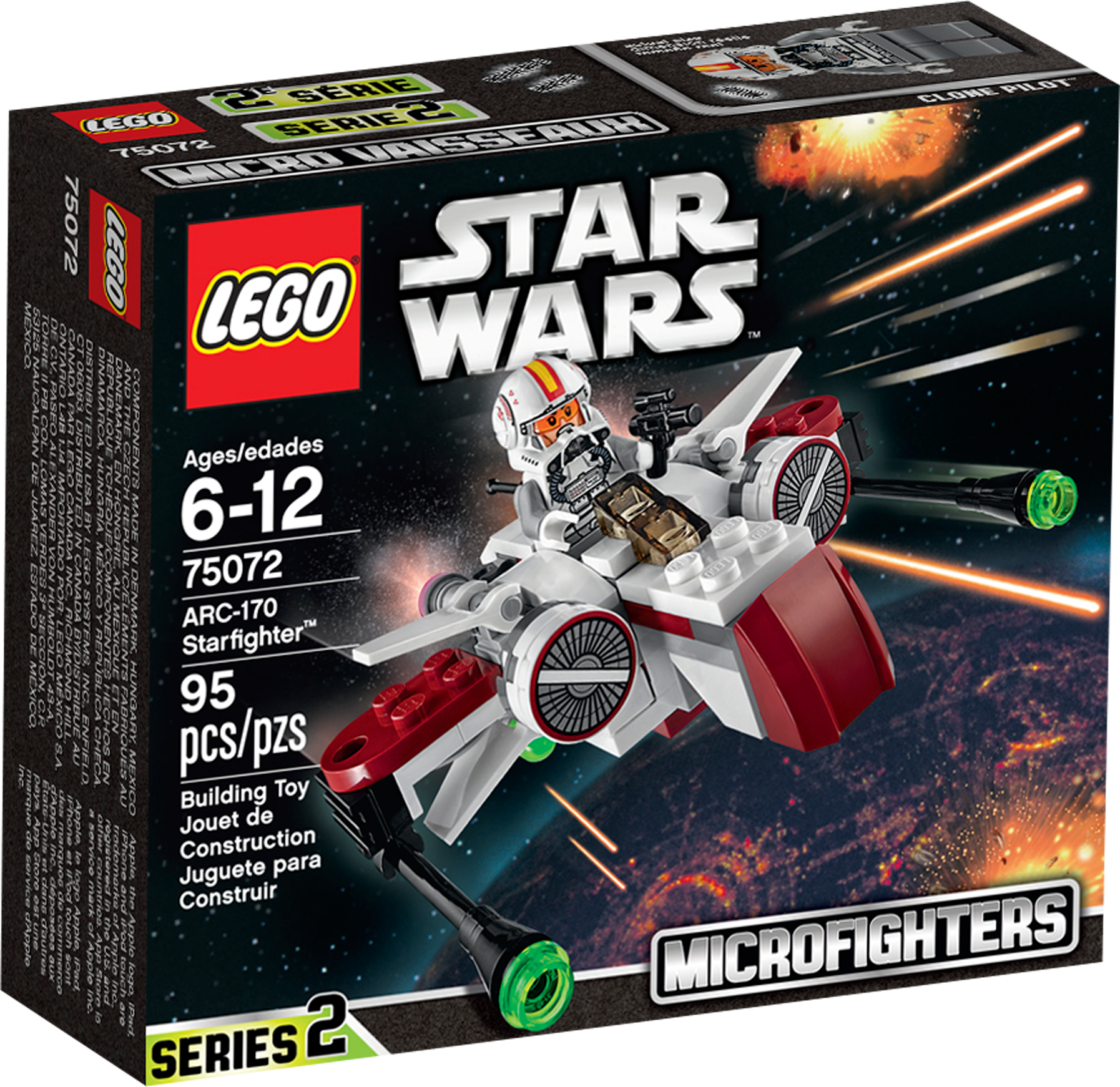 Defeat the Separatists with the ARC-170 Starfighter microfighter! Defend the Republic above Coruscant with the advanced LEGO® Star Wars ARC-170 Starfighter microfighter. This great mini-scale version of the Republic’s rugged starfighter features an amazing amount of detail, including folding wings, 2 flick missiles and a mini cockpit for the Clone Pilot to sit in! Fire up the engines and get ready to track down the Separatists! Includes a Clone Pilot minifigure with a blaster pistol. Includes a Clone Pilot minifigure with a blaster pistol Features realistic detailing, folding wings, 2 flick missiles and a mini cockpit for the Clone Pilot minifigure to sit in Fold out the wings and prepare for battle! Fire the flick missiles Amazing miniature version of the starfighter featured in the Star Wars movies! Fly into action against the 75073 LEGO® Star Wars Vulture Droid As seen in Star Wars: Episode III Revenge of the Sith Measures over 1” (5cm) high, 3” (8cm) longand 3” (9cm) wide