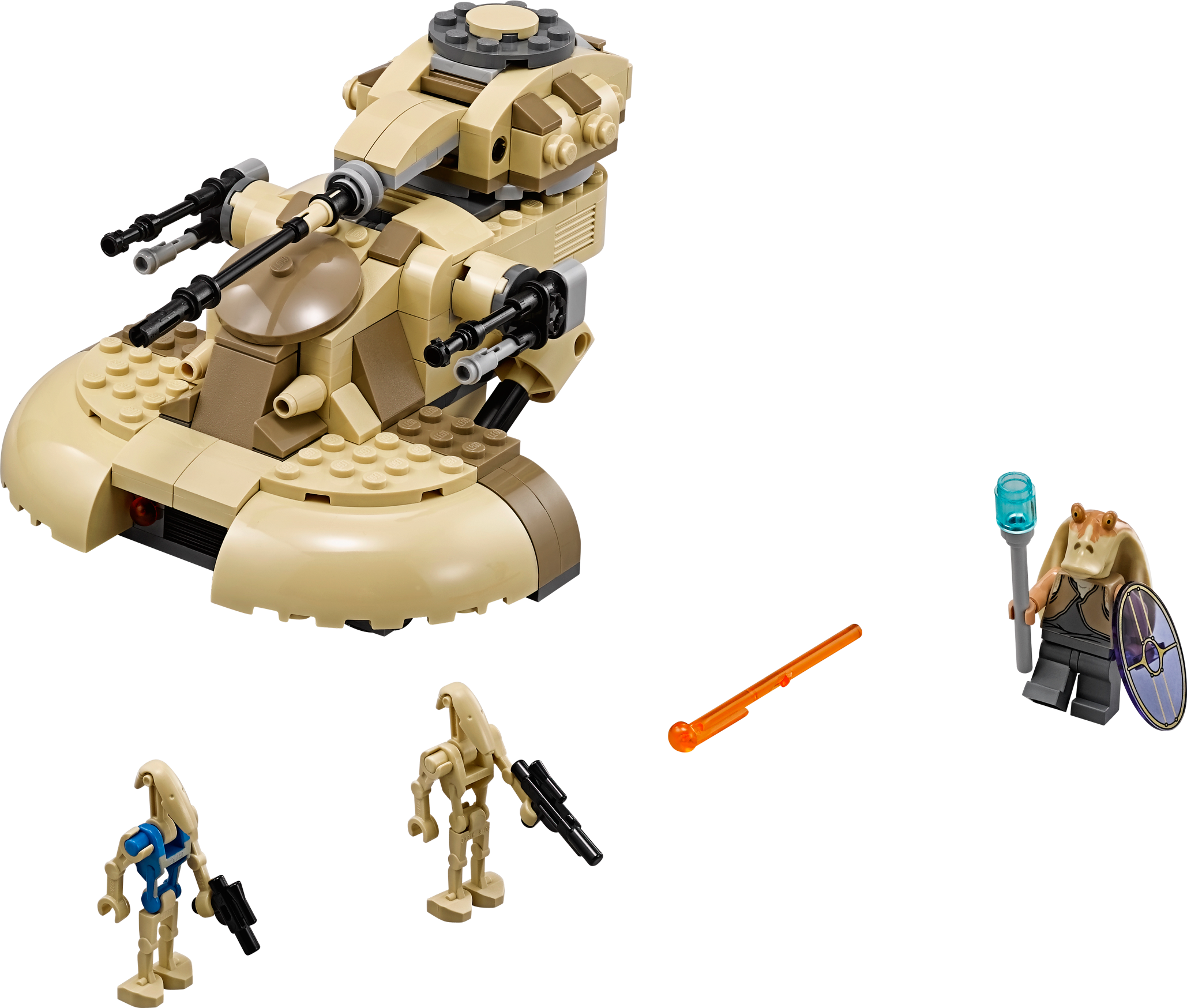 Recreate your own Invasion of Naboo with the armored AAT! As the Trade Federation tightens its grip on Naboo, Jar Jar Binks and his fellow Gungans must do all they can to stop the advancing AAT. Help him dodge the dual spring-loaded shooters, elevating side guns and rotating turret with elevating cannon, and send the armored tank crashing to the ground! Relive classic battle scenes from Star Wars: Episode I The Phantom Menace. Includes a Jar Jar Binks minifigure, plus Battle Droid and Pilot Battle Droid figures with assorted weapons. Includes a Jar Jar Binks minifigure, plus Battle Droid and Pilot Battle Droid figures with assorted weapons Features opening hatches, dual spring-loaded shooters, elevating side guns and a rotating turret with elevating cannon Weapons include a blaster pistol, blaster and Jar Jar Binks’ Gungan staff and shield Fire the spring-loaded shooters! Open the hatches and seat the Battle Droids Take control of the Gungan homeworld Recreate epic scenes from Star Wars: Episode I The Phantom Menace AAT measures over 3” (9cm) high, 6” (16cm) long and 4” (12cm) wide