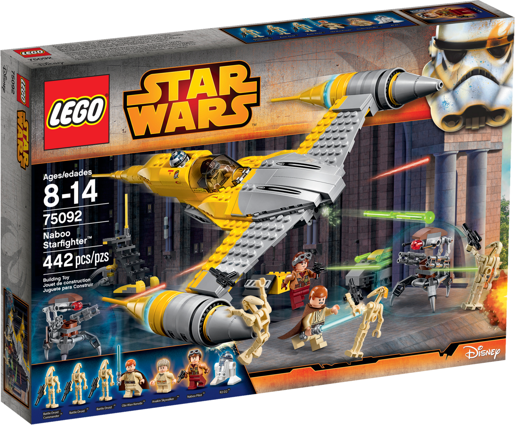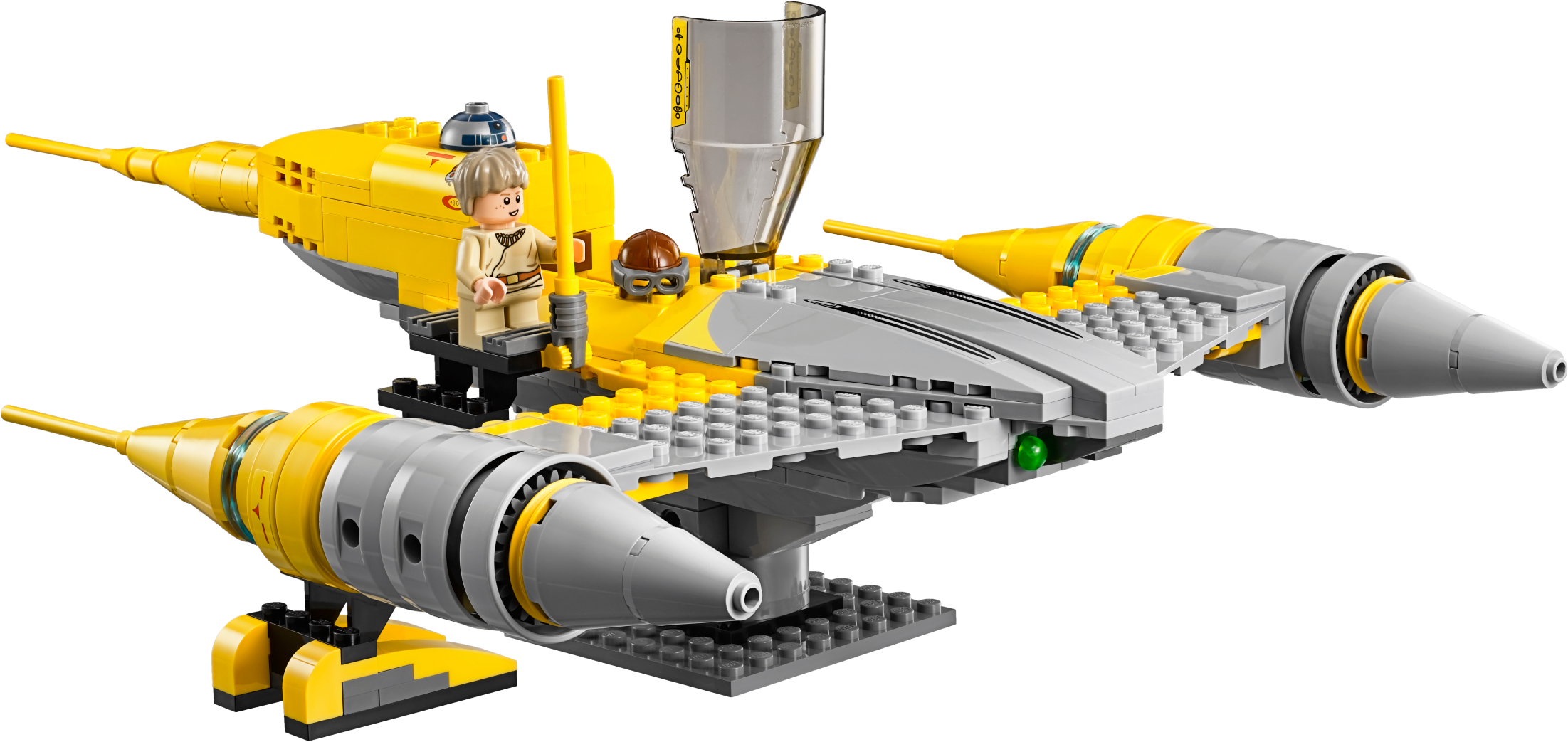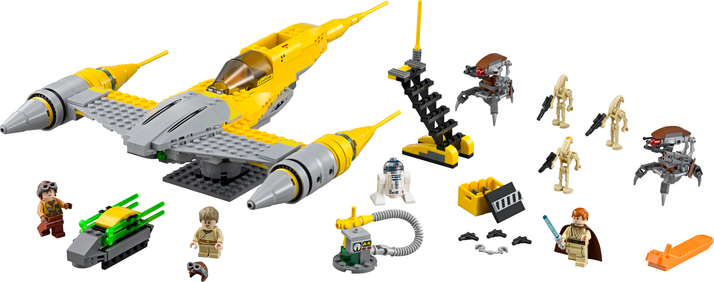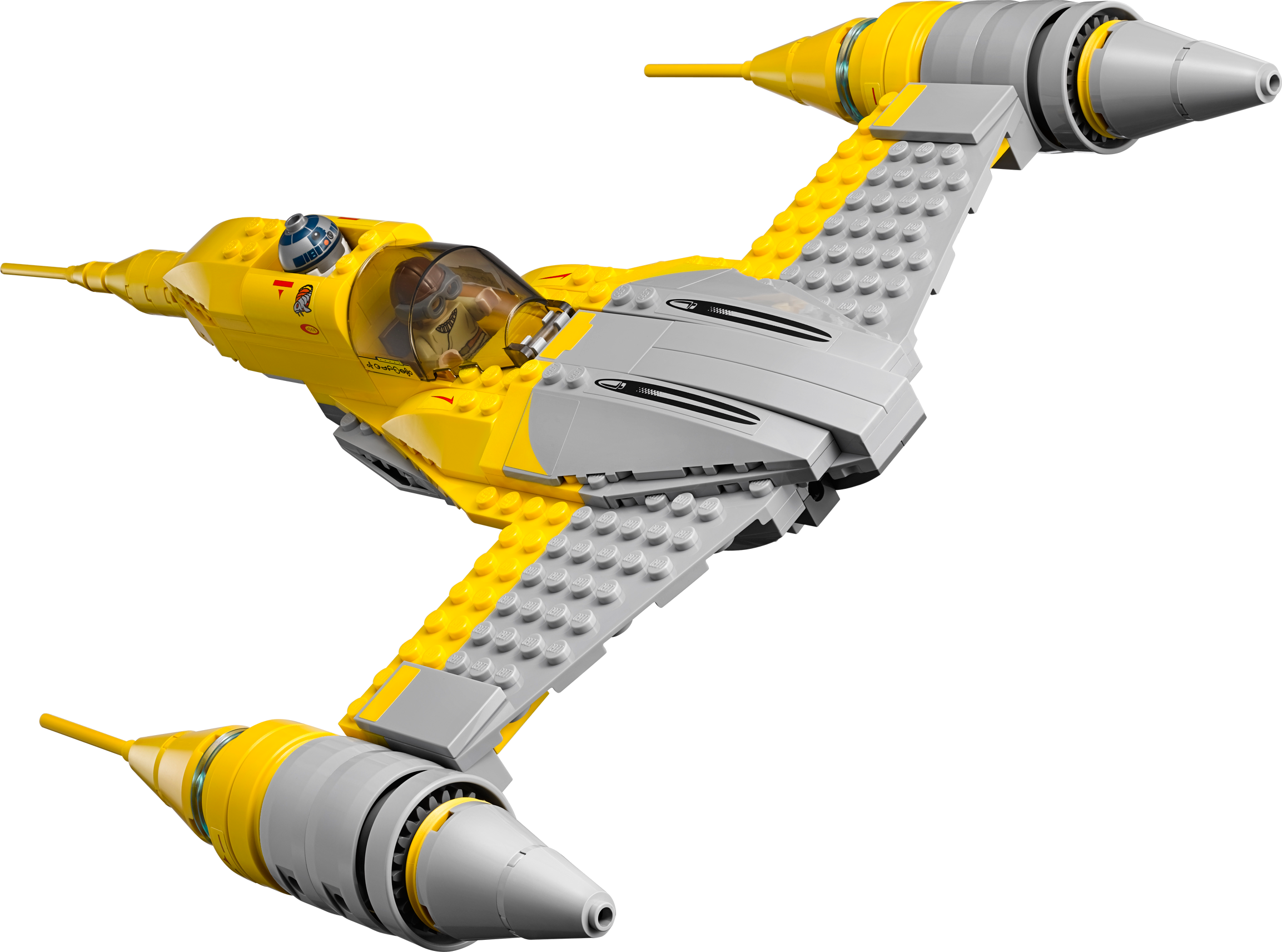 Blast the Droids with the super-sleek Naboo Starfighter! Recreate the exciting Naboo hangar scene from Star Wars: Episode I The Phantom Menace in which young Anakin Skywalker helps his Jedi protector, Obi-Wan Kenobi, fend off the attacking Trade Federation forces. Open the cockpit of the Naboo Starfighter, position the access ladder and load up Anakin and R2-D2. Then fire the twin spring-loaded shooters to send the Destroyer Droids and Battle Droids flying! As well as lots of authentic detailing and a cool R2-D2 ejector function, this LEGO® Star Warsmodel also comes with a fueling station and a rotating stand to mount the model on. Includes 3 minifigures with a weapon and accessory: Anakin Skywalker, Obi-Wan Kenobi and a Naboo Pilot, plus R2-D2, 2 Battle Droids and Battle Droid Commander with assorted weapons. Includes 3 minifigures with a weapon and accessory: Anakin Skywalker, Obi-Wan Kenobi and a Naboo Pilot, plus R2-D2, 2 Battle Droids and Battle Droid Commander with assorted weapons Features a Naboo Starfighter with rotating stand, access ladder, fueling station and 2 Destroyer Droids Naboo Starfighter features an opening cockpit, spring-loaded shooters and R2-D2 eject function Weapons include Obi-Wan’s Lightsaber, a blaster pistol and 2 blasters Also includes a handcuffs elementJumpinto the Naboo Starfighter and blast the droids! Trigger the R2-D2 eject function Fire the twin spring-loaded shooters Uncuff the Naboo Pilot Display the model on the supplied stand As seen in Star Wars: Episode I The Phantom Menace Naboo Starfighter measures over 1” (5cm) high, 13” (35cm) long and 9” (25cm) wide