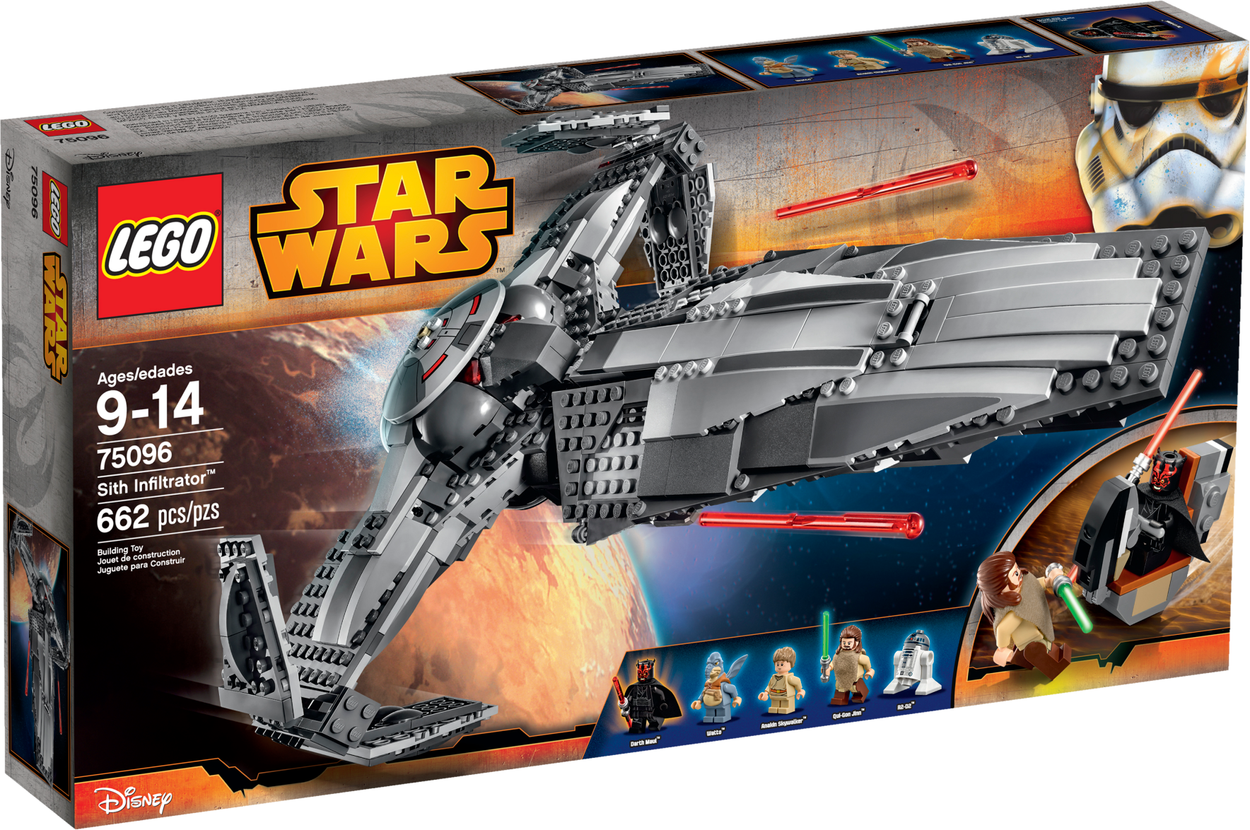 Hunt for Jedi in Darth Maul’s Sith Infiltrator! Track down the Jedi in the advanced LEGO® Star Wars Sith Infiltrator. Given to him by his master Darth Sidious, Darth Maul’s personal starship has everything needed to carry out the Dark Lord’s bidding, including retractable landing gear, folding wings, opening cockpit with space for a minifigure and 2 front or rear-loading spring-loaded shooters. After you’ve released the Droid probes and located the enemy, jump on the detachable Sith Speeder to intercept. With the power of the Sith on your side, you are more than a match for any Jedi Master! Includes 4 minifigures with assorted weapons: Darth Maul, Qui-Gon Jinn, young Anakin Skywalker and Watto, plus R2-D2. Includes 4 minifigures with assorted weapons: Darth Maul, Qui-Gon Jinn, young Anakin Skywalker and Watto, plus R2-D2 Features retractable landing gear, folding wings, opening cockpit with space for a minifigure, 2 front or rear-loading spring-loaded shooters, Droid probes with release function and a detachable Sith Speeder Weapons include Darth Maul’s double-bladed Lightsaber and Qui-Gon’s Lightsaber Also includes an electrobinoculars element Release the Droid probes to track downthe Jedi Load the spring-loaded shooters from the front or back Jump on the Sith Speeder and chase down the enemy Recreate amazing Lightsaber battles from the Star Wars movies! As seen in Star Wars: Episode I The Phantom Menace Sith Infiltrator (with wings open) measures over 5” (15cm) high, 14” (38cm) long and 11” (29cm) wide