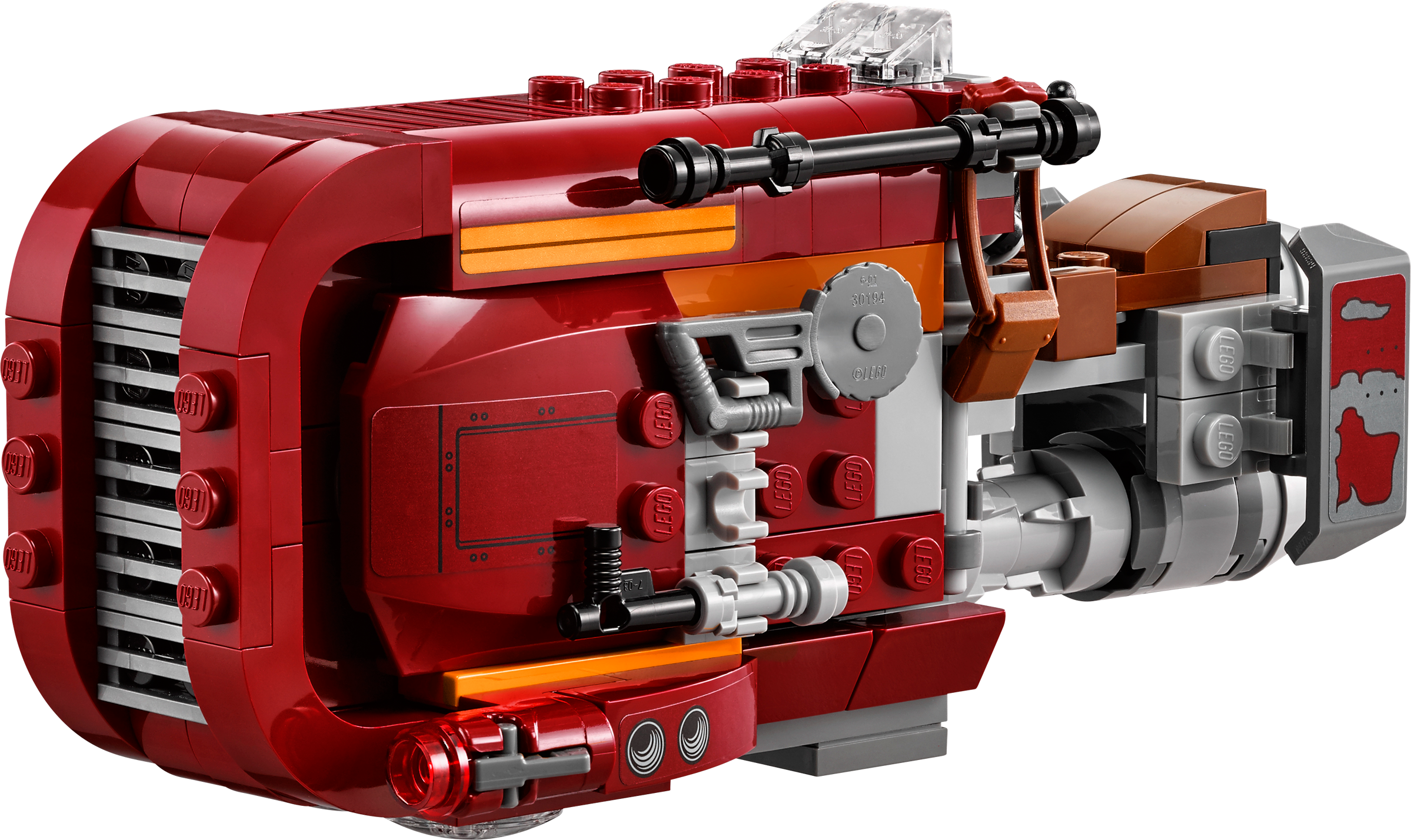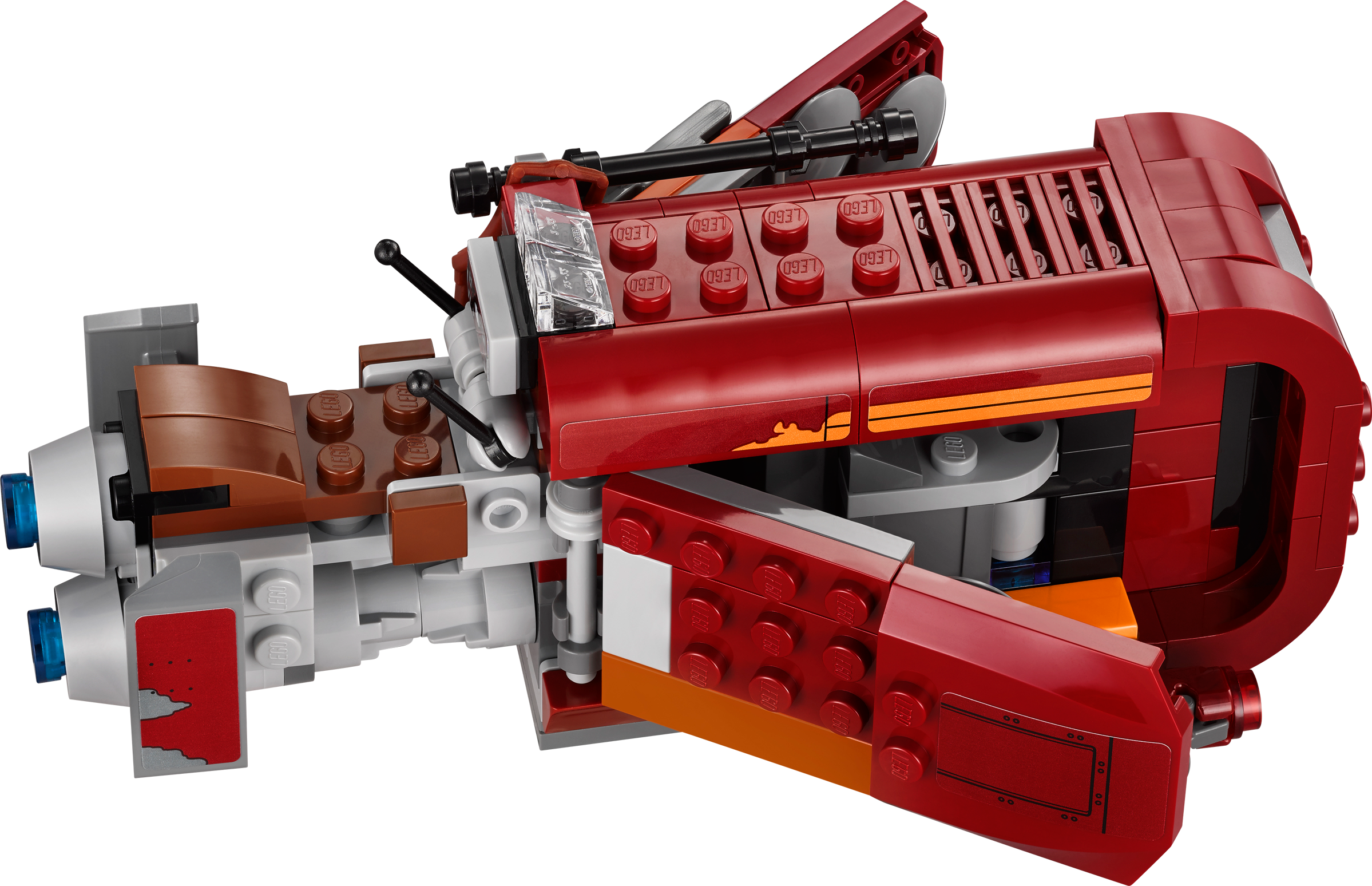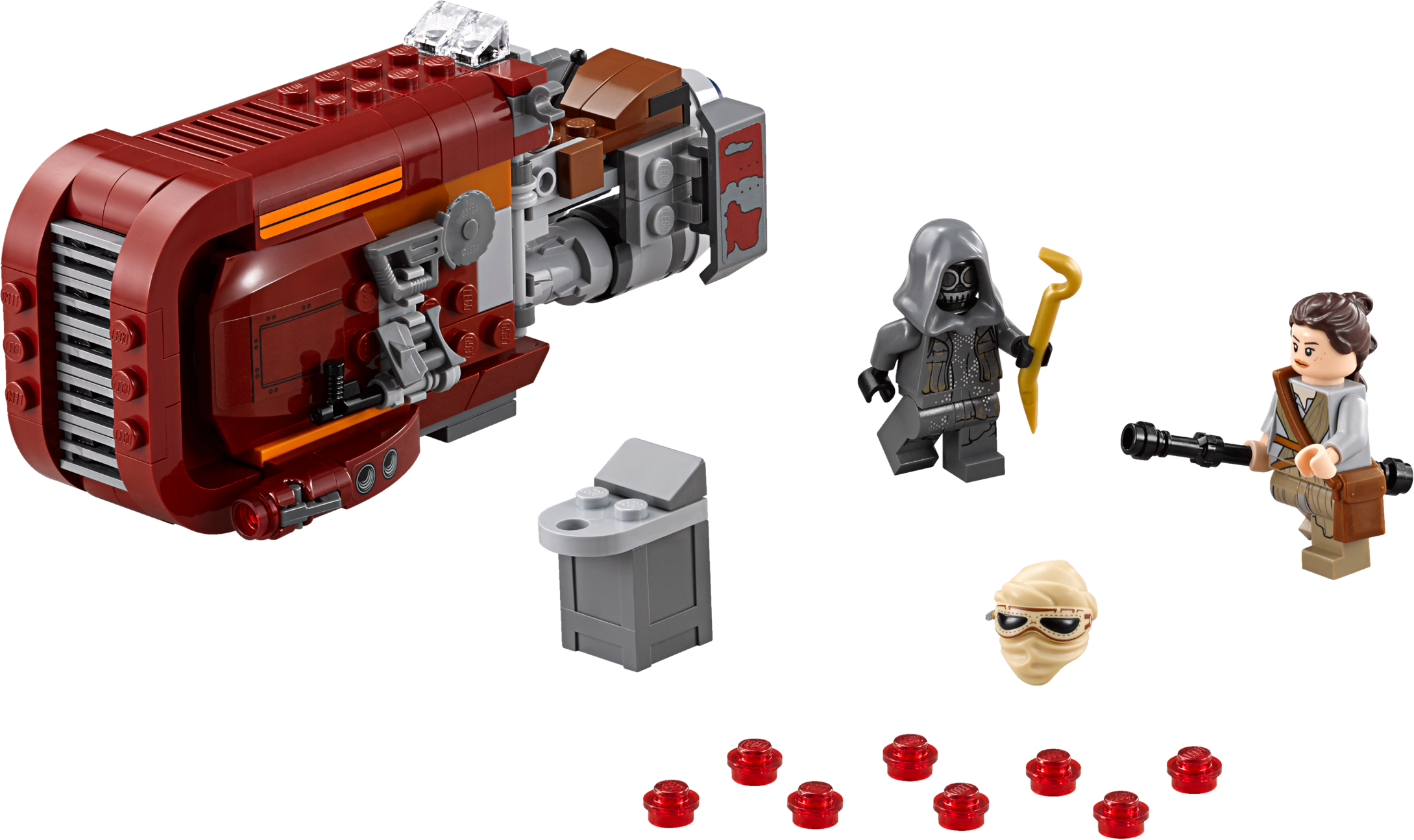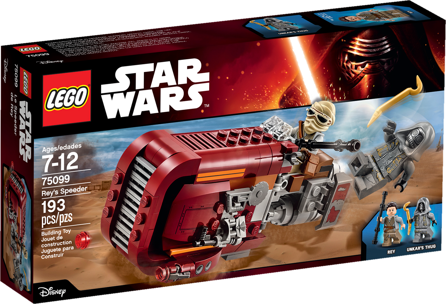 Speed into action on Rey's Speeder! Hover into action on Rey's Speeder! This cool landspeeder has everything Rey needs for scouting the surface of a desert planet, including dual stud shooters, opening storage hatch and side-mounted bag, blaster, buzzsaw and electrobinoculars. There’s also a detachable sled with space for a minifigure when Rey must make a quick escape down the desert dunes! Recreate your own fantastic scenes from Star Wars: The Force Awakens. Includes 2 minifigures: Rey and Unkar’s Thug with a crowbar. Includes 2 minifigures: Rey and Unkar’s Thug with a crowbar Rotate the engine to open the storage hatch Grab the side-mounted accessories Unhitch the sled and get ready for an adrenalin-filled sandsurf! Recreate fantastic scenes from Star Wars: The Force Awakens The perfect addition to any LEGO® Star Wars collection Measures over 3” (9cm) high, 5” (14cm) long and 1” (5cm) wide