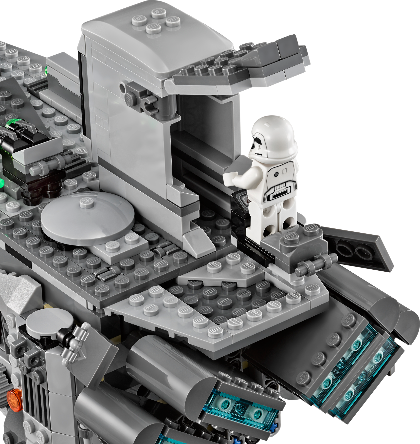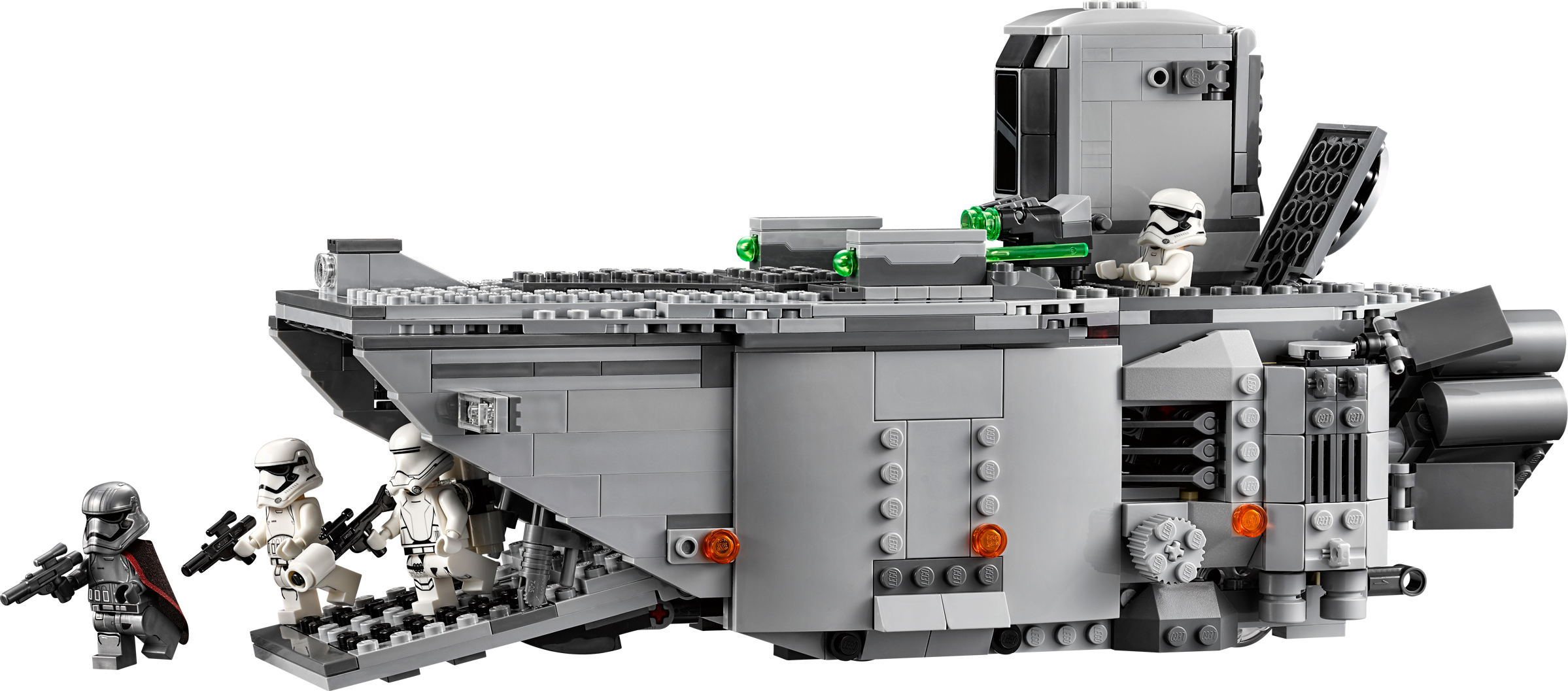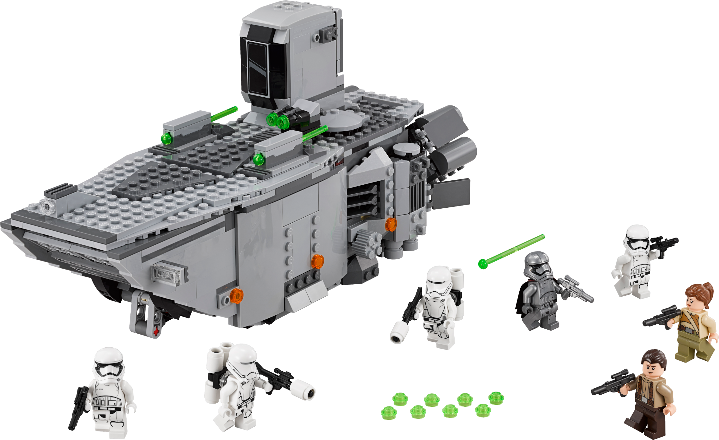 Deliver troops to the battle with the super-tough First Order Transporter! Lower the ramp, load the troopers and get ready to transport them into battle! This heavily armored First Order Transporter is packed with cool features, like dual spring-loaded shooters, top-mounted dual-stud shooter and hatch with space for a minifigure, pilot cabin with opening hatch and space for 4 minifigures in the hold, big engines at the rear, and hidden, transparent wheels for a cool ‘hover’ look. You can also remove the top section for easy access. Get ready to recreate incredible battle scenes from Star Wars: The Force Awakens! Includes 7 minifigures with assorted weapons and accessories: 2 Resistance Soldiers, 2 First Order Flametroopers, 2 First Order Stormtroopers and Captain Phasma. Includes 7 minifigures with assorted weapons and accessories: 2 Resistance Soldiers, 2 First Order Flametroopers, 2 First Order Stormtroopers and Captain Phasma Features dual spring-loaded shooters, top-mounted stud shooter, pilot cabin with opening hatch and space for a minifigure, hold with space for 4 minifigures, big engines at the rear, removable top section, and hidden, transparent wheels for a ‘hovering’ look Weapons include 2 blasters, silver-look blaster, titanium-look blaster and2 flamethrowers Accessories include 6 helmets Turn the gear to lower the ramp Remove the top for easy access Looks like it really hovers! Recreate fantastic scenes from Star Wars: The Force Awakens The perfect addition to any LEGO® Star Wars collection Measures over 5” (15cm) high, 12” (31cm) long and 5” (13cm) wide