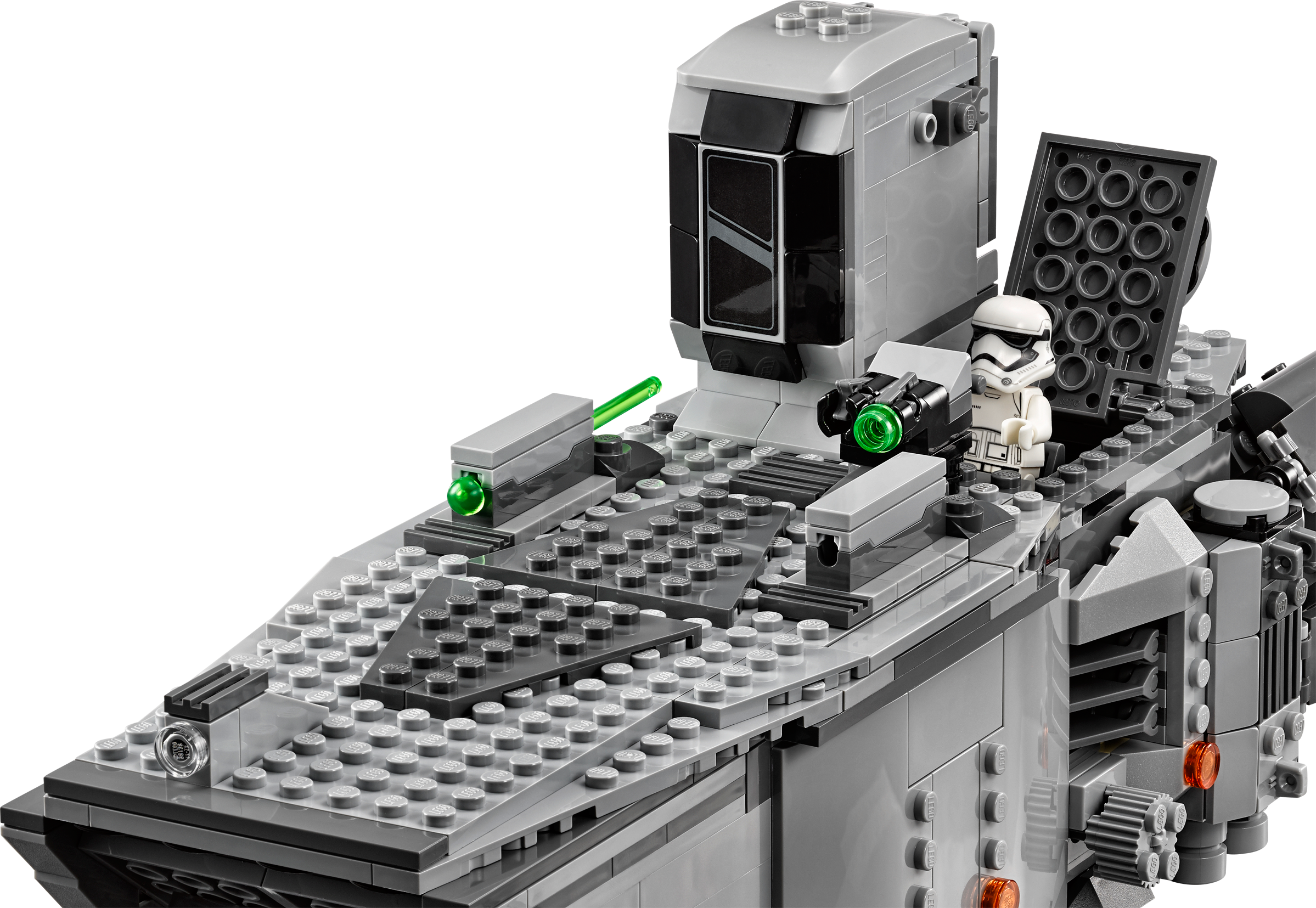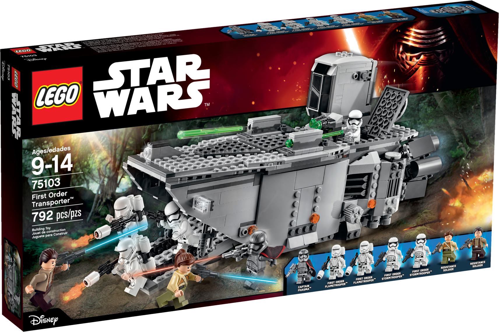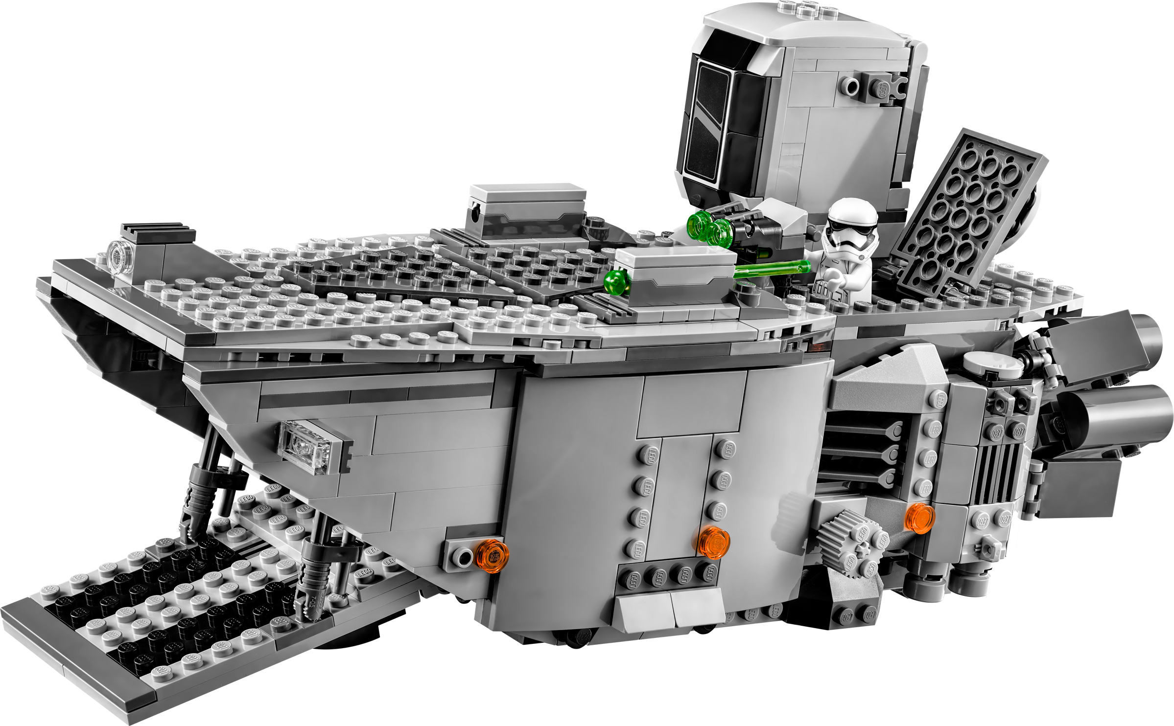 Deliver troops to the battle with the super-tough First Order Transporter! Lower the ramp, load the troopers and get ready to transport them into battle! This heavily armored First Order Transporter is packed with cool features, like dual spring-loaded shooters, top-mounted dual-stud shooter and hatch with space for a minifigure, pilot cabin with opening hatch and space for 4 minifigures in the hold, big engines at the rear, and hidden, transparent wheels for a cool ‘hover’ look. You can also remove the top section for easy access. Get ready to recreate incredible battle scenes from Star Wars: The Force Awakens! Includes 7 minifigures with assorted weapons and accessories: 2 Resistance Soldiers, 2 First Order Flametroopers, 2 First Order Stormtroopers and Captain Phasma. Includes 7 minifigures with assorted weapons and accessories: 2 Resistance Soldiers, 2 First Order Flametroopers, 2 First Order Stormtroopers and Captain Phasma Features dual spring-loaded shooters, top-mounted stud shooter, pilot cabin with opening hatch and space for a minifigure, hold with space for 4 minifigures, big engines at the rear, removable top section, and hidden, transparent wheels for a ‘hovering’ look Weapons include 2 blasters, silver-look blaster, titanium-look blaster and2 flamethrowers Accessories include 6 helmets Turn the gear to lower the ramp Remove the top for easy access Looks like it really hovers! Recreate fantastic scenes from Star Wars: The Force Awakens The perfect addition to any LEGO® Star Wars collection Measures over 5” (15cm) high, 12” (31cm) long and 5” (13cm) wide