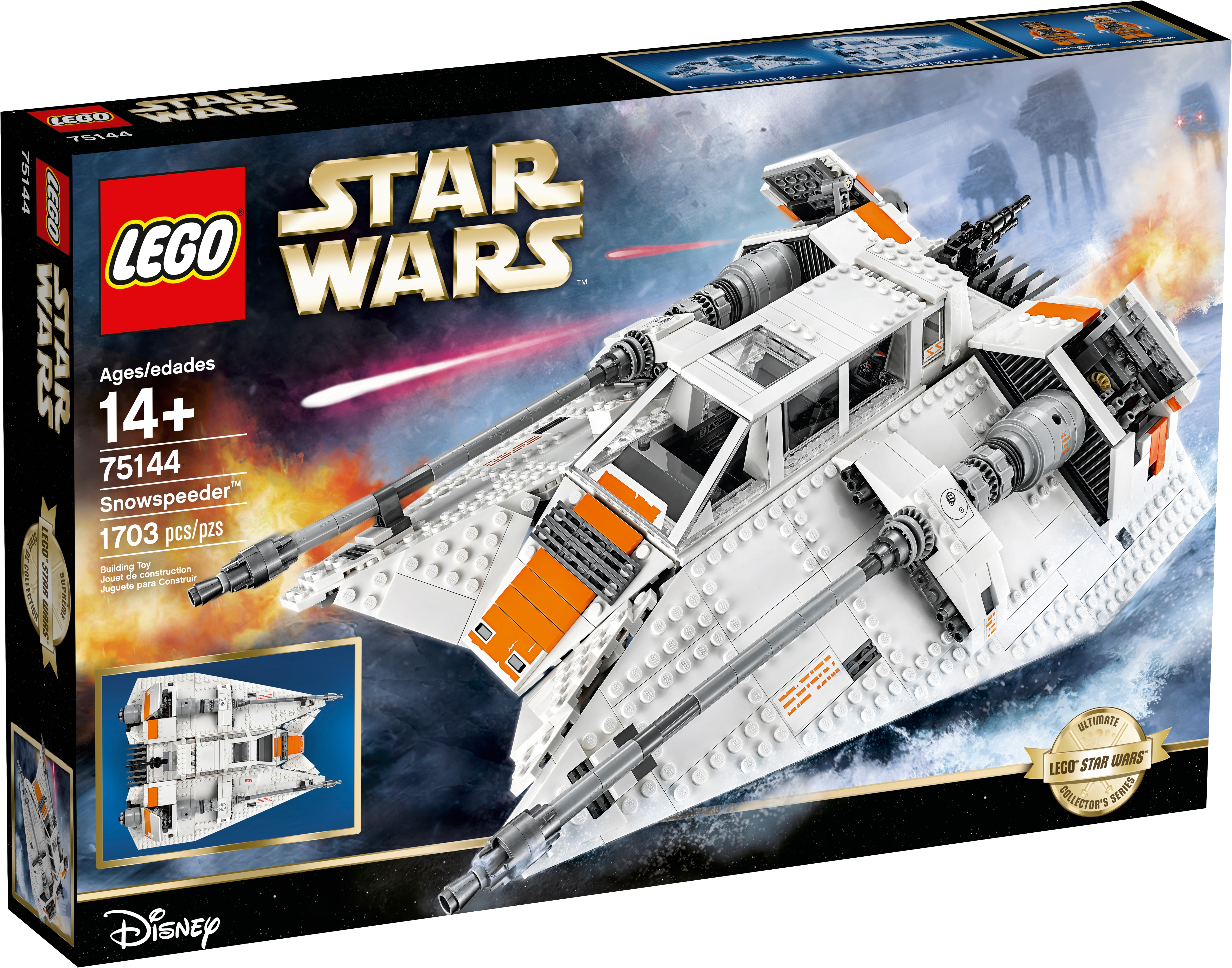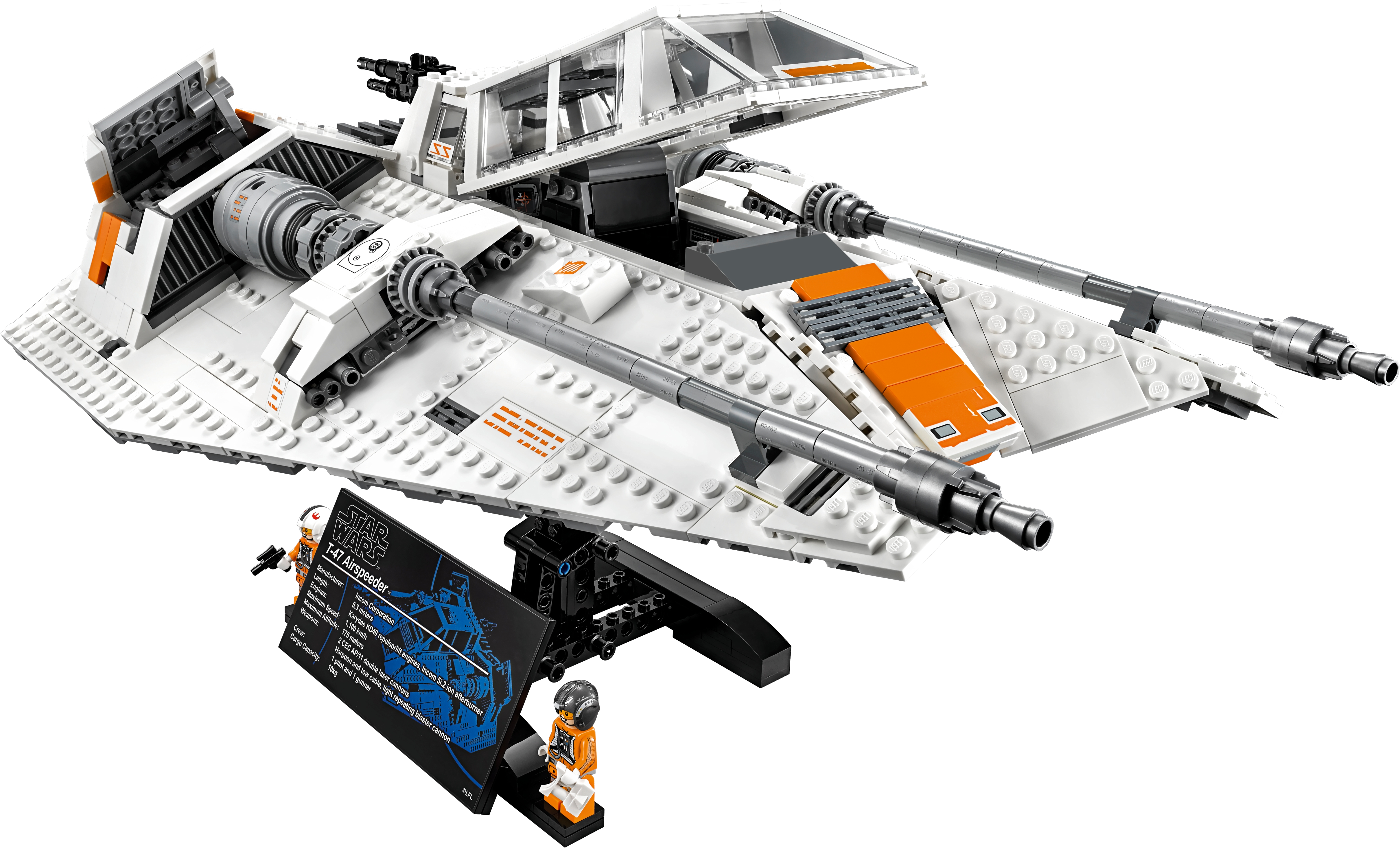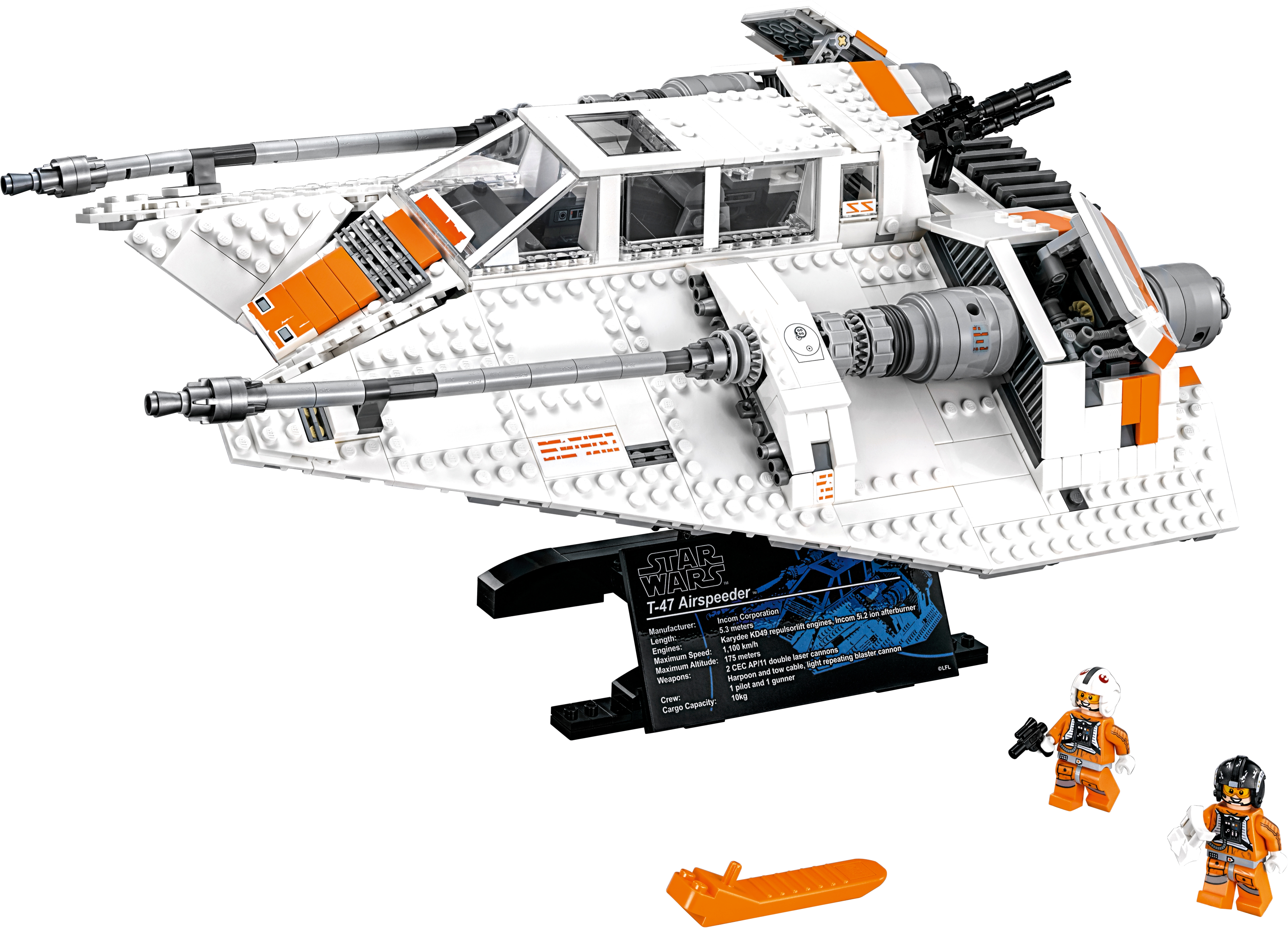 Collect a true Star Wars classic: the T-47 Snowspeeder. This LEGO® interpretation of the iconic airspeeder that fans will remember from Star Wars: Episode V The Empire Strikes Back has all the details you'd expect, including opening airbrakes, rotating rear gun, and an opening cockpit with space for the included Rebel Snowspeeder Pilot and Rebel Snowspeeder Gunner minifigures. This model also comes with a display stand and fact plaque, so it can take pride of place in any LEGO Star Wars collection. Includes 2 minifigures: a Rebel Snowspeeder Pilot and a Rebel Snowspeeder Gunner. Features intricate, authentic detailing, opening airbrakes, rotating rear gun and an opening cockpit with space for the 2 included minifigures. Attach the Snowspeeder to the stand with fact plaque to display it. Impress your friends with this amazing recreation of a classic Star Wars Snowspeeder. Includes 2 blaster pistols. Accessory elements include electrobinoculars, a Snowspeeder Pilot helmet and a Snowspeeder Gunner helmet. Snowspeeder on display stand measures over 8” (21cm) high, 15” (39cm) long and 11” (29cm) wide, and over 4” (11cm) high without stand.