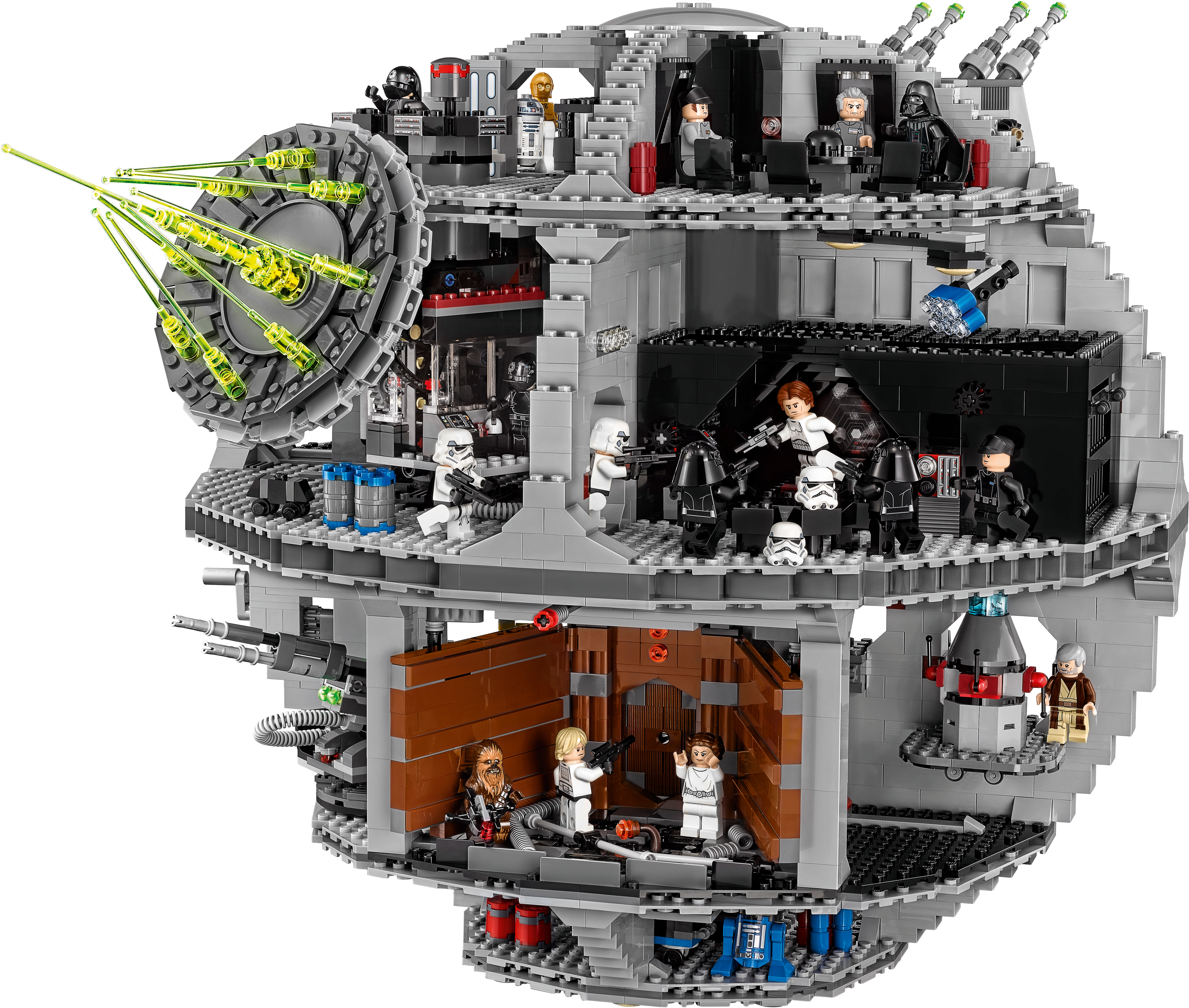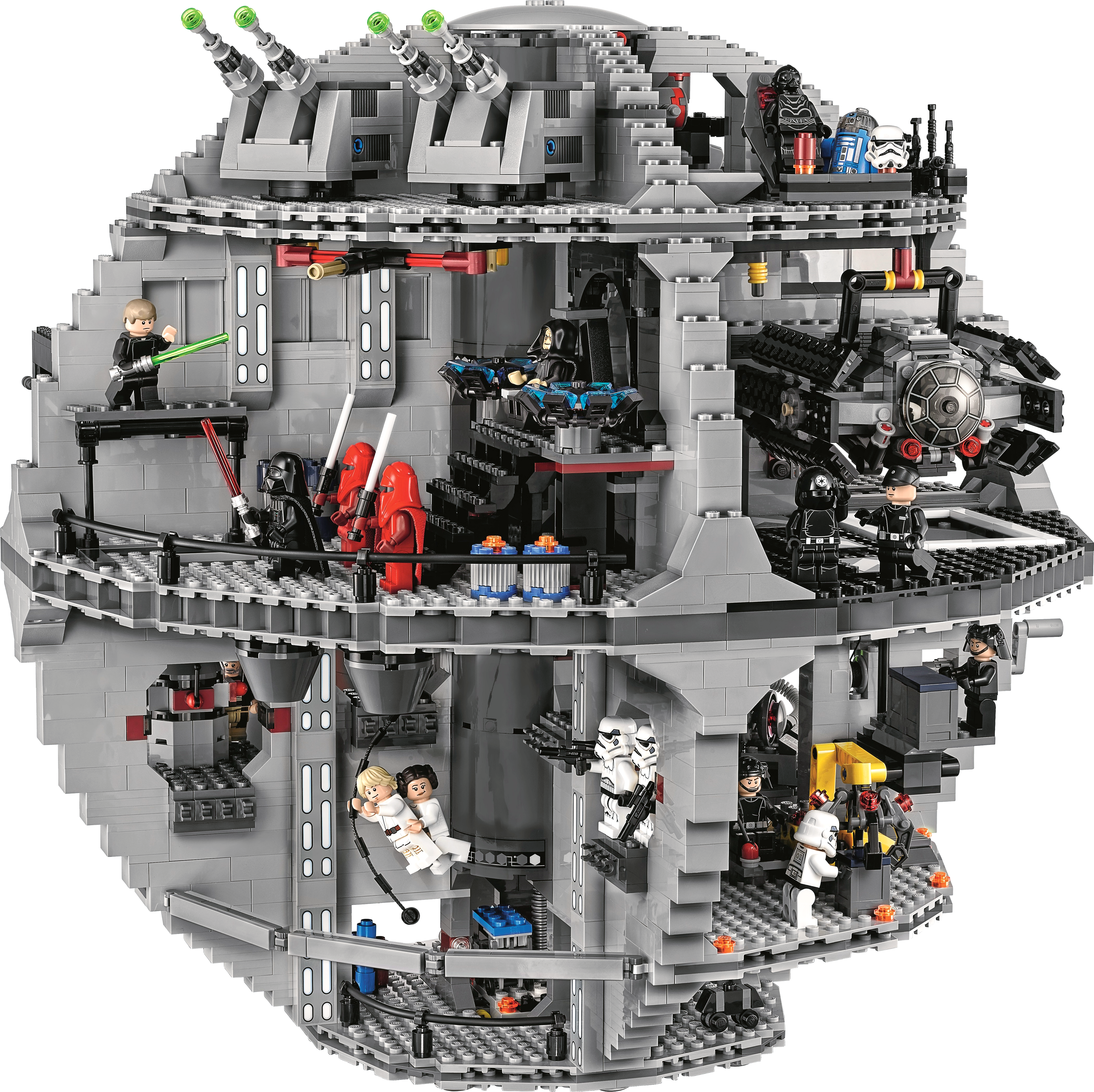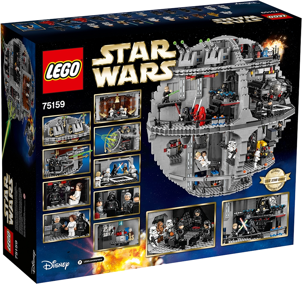 Reenact amazing scenes from the Star Wars saga with the Empire’s ultimate planet-zapping weapon—the Death Star! With over 4,000 pieces, this fantastic model has a galaxy of intricate and authentic environments, including a superlaser control room, Imperial conference chamber, hangar bay with moving launch rack and Lord Vader’s TIE Advanced with space for Vader inside, Emperor Palpatine’s throne room, Droid maintenance room, detention block, trash compactor, tractor beam, cargo area, turbo laser with spring-loaded shooters and seats for the 2 Death Star Gunners, and 2 movable turbo laser towers. This fantastic set also includes 23 iconic minifigures and 2 Droids to ensure hours of Star Wars battle fun. Includes 23 minifigures: Grand Moff Tarkin, Darth Vader, Emperor Palpatine, Imperial Navy Officer, Imperial Officer, 2 Stormtroopers, 2 Death Star Troopers, 2 Emperor's Royal Guards, 2 Death Star Gunners, Death Star Droid, Obi-Wan Kenobi, Chewbacca, Princess Leia, C-3PO, Han Solo, Han Solo (disguise), Luke Skywalker (Tatooine), Luke Skywalker (disguise) and Luke Skywalker (final duel), plus R2-D2, an Imperial Astromech and a Dianoga trash compactor monster. Features a superlaser control room, Imperial conference chamber, hangar bay with moving launch rack and detachable TIE Advanced with space for Lord Vader inside, Emperor Palpatine’s throne room, Droid maintenance room, detention block, trash compactor, tractor beam, cargo area, turbo laser with spring-loaded shooters and seats for the 2 Death Star gunners, and 2 movable turbo laser towers. Weapons include 3 Lightsabers, 4 blasters, 3 blaster pistols, 4 blaster rifles, 2 force pikes, 2 Force Lightning elements and a bowcaster. Load up and fire the turbo laser’s spring-loaded shooters to keep the rebels at bay. Maneuver Lord Vader’s TIE Advanced into position and prepare for launch. Battle the Royal Guard in the throne room and then take on Palpatine himself! Help Leia escape from the detention block and swing to safety with Luke across the chasm! Will Obi-Wan shut down the tractor beam and help the rebels defeat the Empire? Can you spot the Dianoga trash compactor monster? Recreate other unforgettable scenes from the classic Star Wars films. The perfect addition to any LEGO® Star Wars collection. This set offers an age-appropriate building experience for ages 14 and over. Measures over 16” (41cm) high, and 16” (42cm) wide.