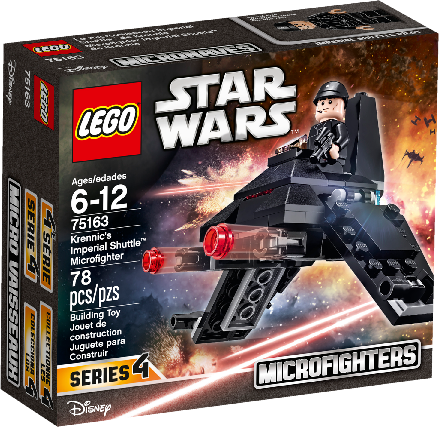 Recreate mini Star Wars: Rogue One adventures with Krennic's Imperial Shuttle Microfighter, featuring folding wings, two stud shooters and space to seat the included Imperial Shuttle Pilot with his blaster pistol. Includes an Imperial Shuttle Pilot minifigure. Features folding wings, two stud shooters and an open cockpit with space for a minifigure to sit. Fold the wings up, arm the stud shooter and get ready for galactic adventures. Also includes the Imperial Shuttle Pilot's blaster pistol. This set offers an age-appropriate build and play experience for ages 6-12. Recreate your own action-packed scenes from the blockbuster movie Star Wars: Rogue One. Measures over 3” (8cm) high, 3” (8cm) long and 4” (11cm) wide with wings folded down.