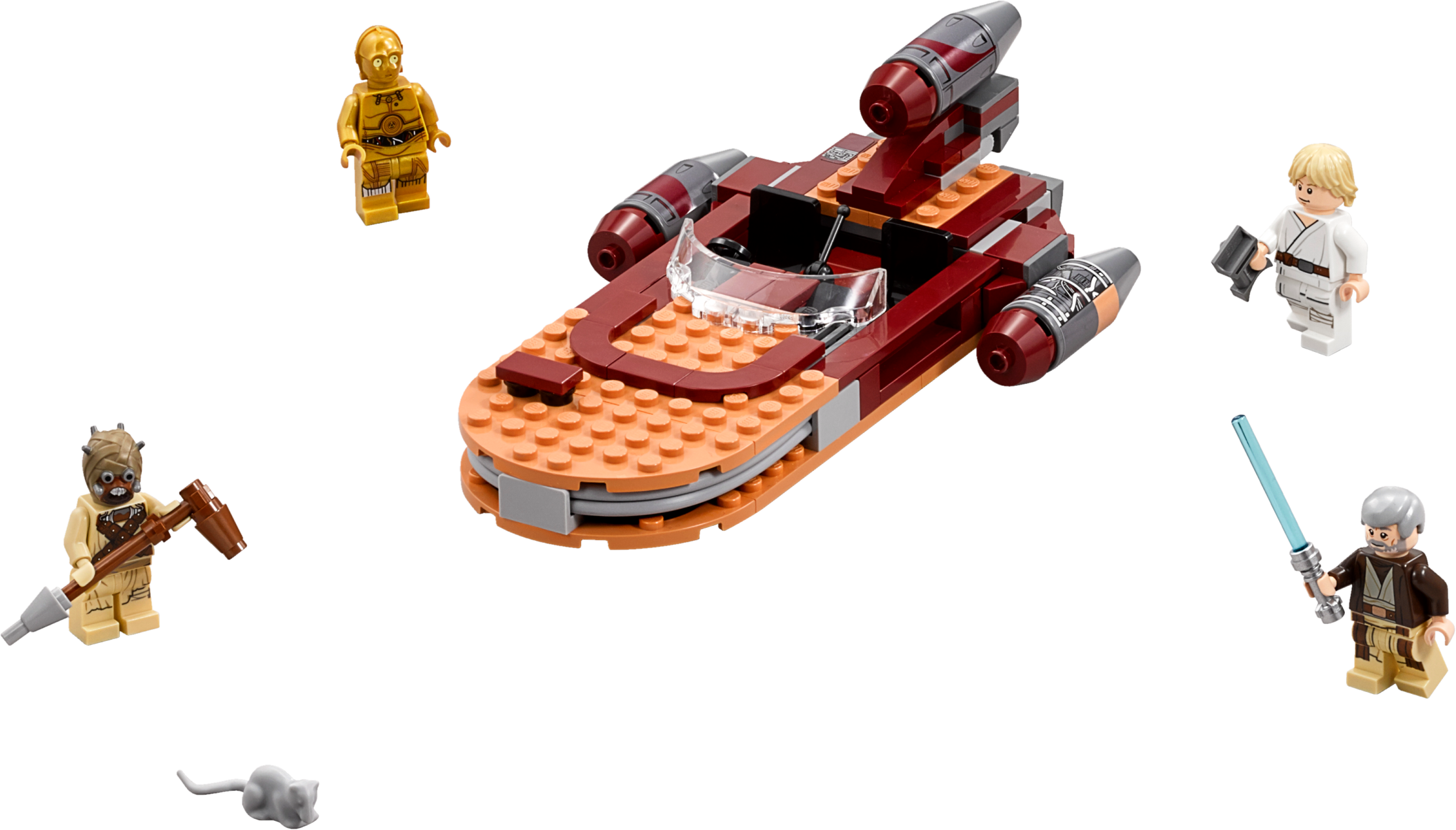 Recreate unforgettable scenes on desert-planet Tatooine, as young Luke and C-3PO go in search of mysterious hermit Ben Kenobi in his landspeeder. This iconic model features a two-minifigure open cockpit, three engines and an opening trunk to store his electrobinoculars. There’s also a Tusken Raider and womp rat to keep the action level high. Includes four minifigures plus a womp rat figure.