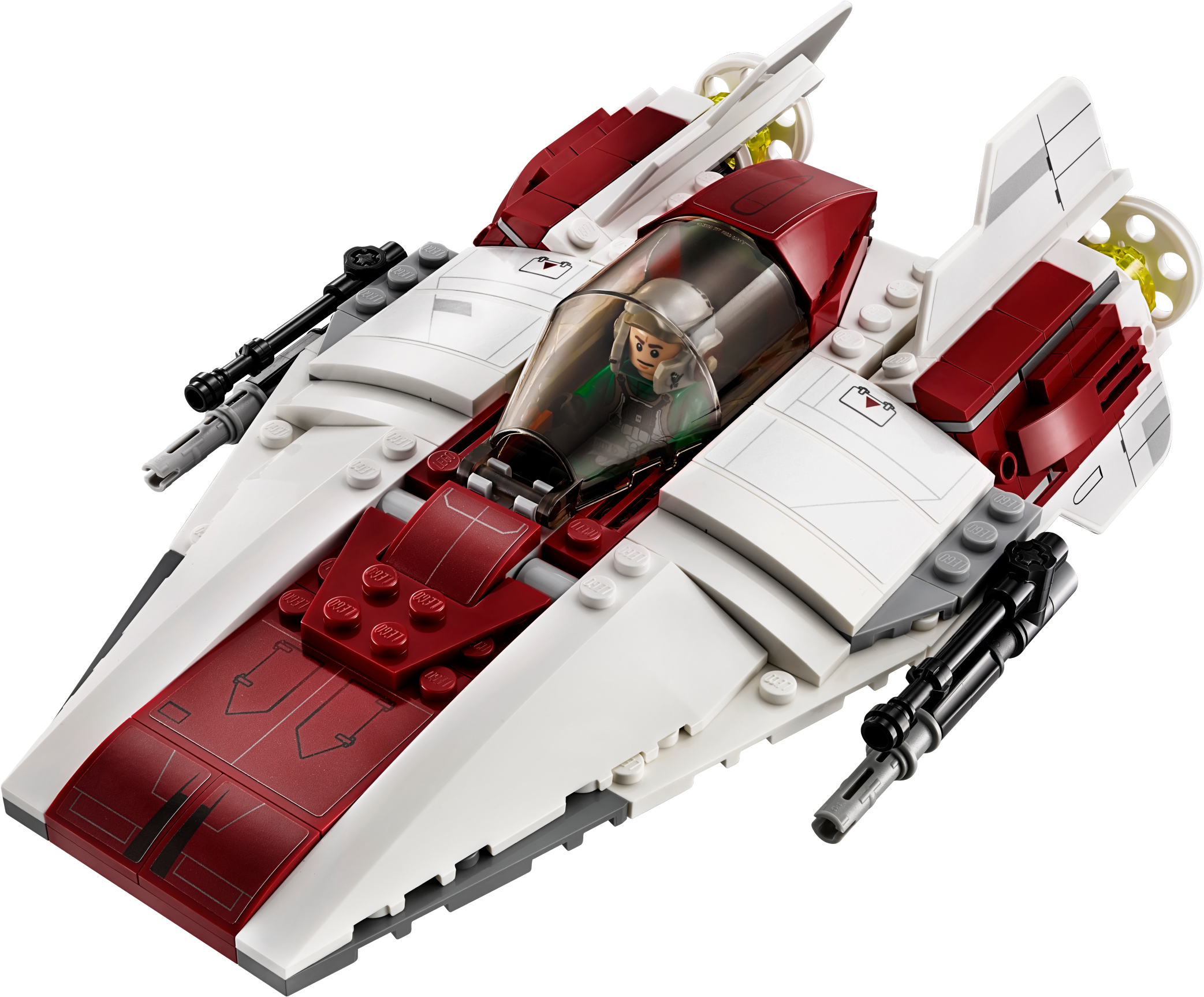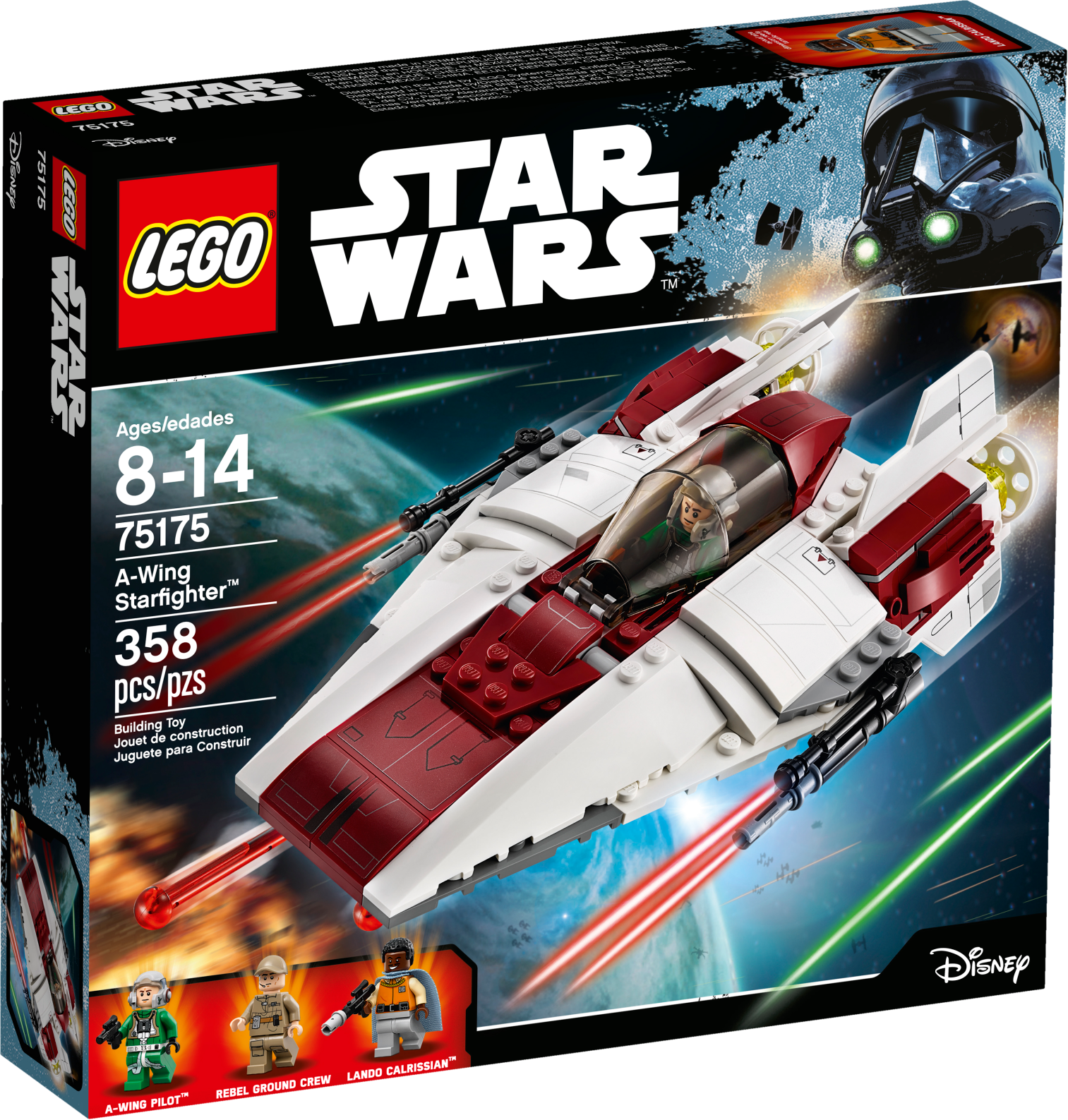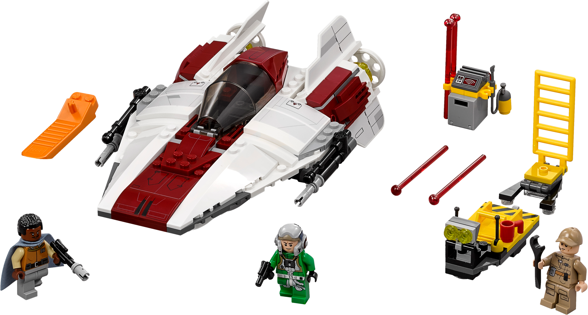 Launch into LEGO® Star Wars missions with the high-speed A-Wing Starfighter, featuring an opening minifigure cockpit, retractable landing gear, rotating laser cannons and dual spring-loaded shooters. There’s also a service cart loaded with tools, extra ammo and a detachable access ladder to load the A-Wing Pilot into position. Includes three minifigures. Includes three minifigures: Lando Calrissian, an A-Wing Pilot and a Rebel Ground Crew. Features an A-Wing Starfighter and a service cart. A-Wing Starfighter features an opening minifigure cockpit, retractable landing gear, rotating laser cannons and two spring-loaded shooters. Service cart features a detachable access ladder, toolbox, wrench, welding apparatus, cup and extra ammo. Weapons include Lando's special blaster and the A-Wing Pilot's blaster pistol. This set offers an age-appropriate build and play experience for ages 8-14. A-Wing Starfighter measures over 2” (7cm) high, 7” (20cm) long and 4” (12cm) wide. Service cart measures over 2” (7cm) high, 3” (9cm) long and 1” (3cm) wide.