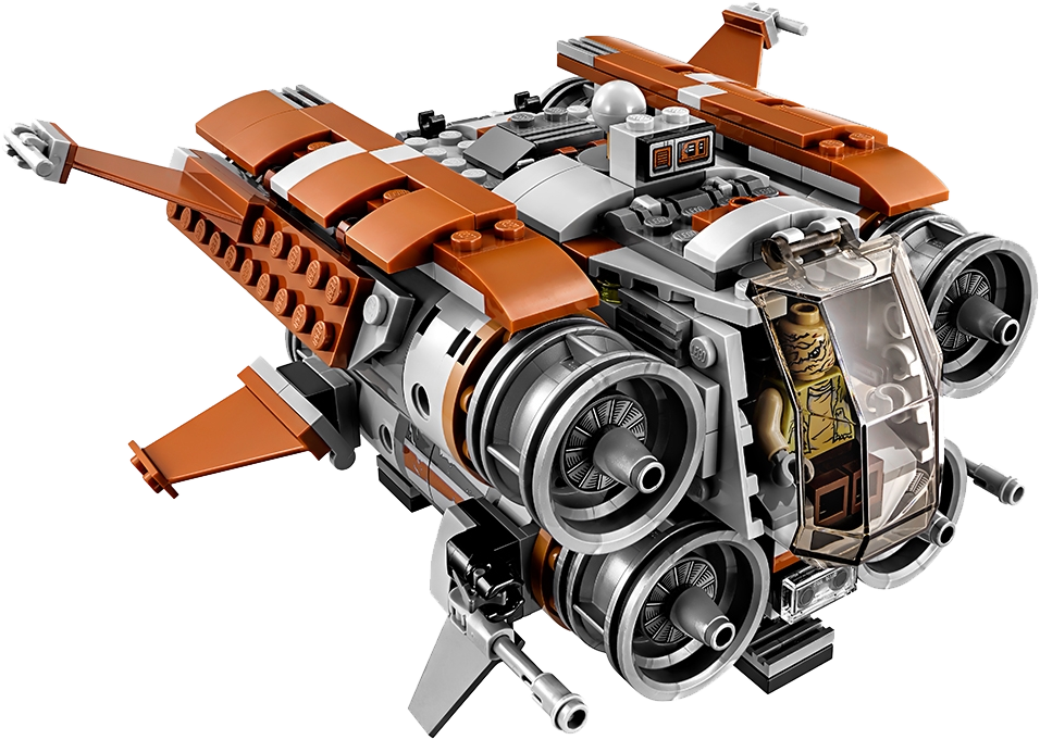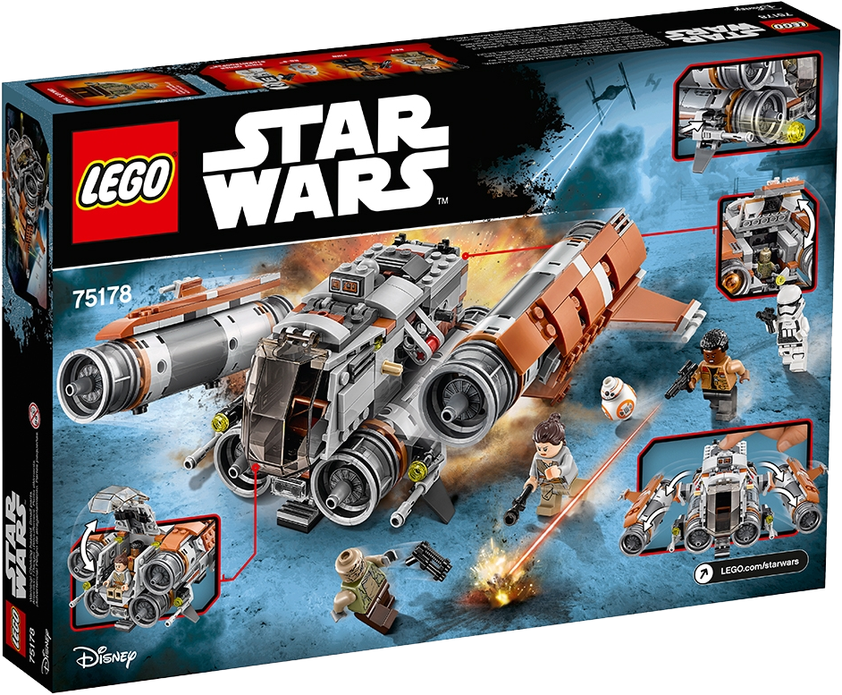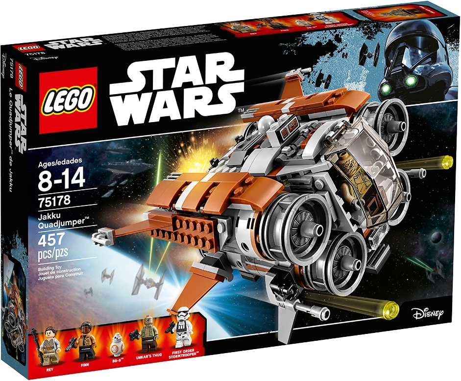 Create your own action-packed LEGO® Star Wars adventures with the Jakku Quadjumper, featuring an opening 2-minifigure cockpit, opening rear compartment with gunner station, 2 front stud shooters, detachable rear stud blaster and 4 big engines with an explode function to send them flying. Includes 4 minifigures and a BB-8 figure. Includes 4 minifigures: Rey, Finn, Unkar’s Thug and a First Order Stormtrooper, plus a BB-8 figure. Features an opening 2-minifigure cockpit, front stud shooters, rear compartment with gunner station, detachable rear stud blaster and 4 big engines with explode function. Hit the button on top to send the engines flying! Weapons include Rey’s staff, 2 blasters and a blaster pistol. Also includes a thermal detonator element. Recreate exciting desert-planet scenes from the blockbuster Star Wars: The Force Awakens movie. Measures over 3” (9cm) high, 5” (15cm) long and 7” (19cm) wide.