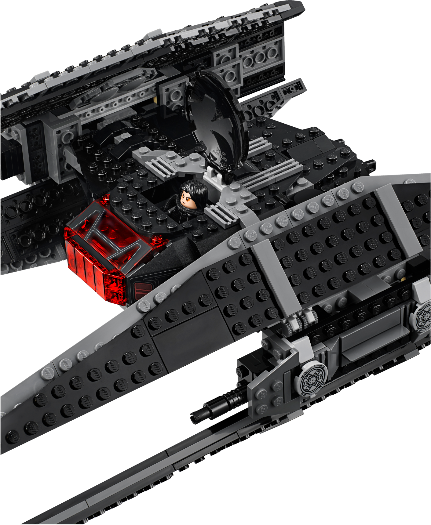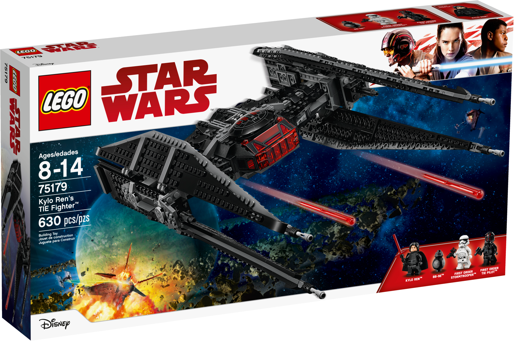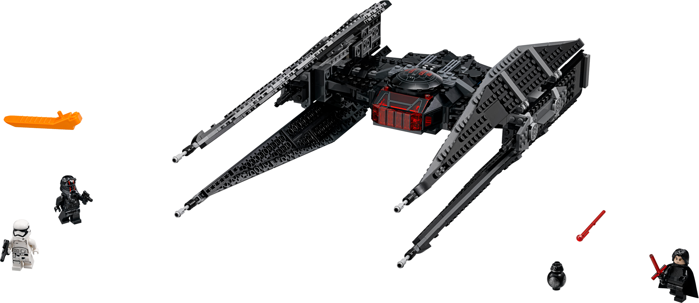 Create your own LEGO® Star Wars: Episode VIII battle adventures with Kylo Ren’s TIE Fighter. This model features large wings, red exhaust detailing, an opening minifigure cockpit and trigger-activated spring-loaded shooters. The set also includes 3 minifigures and a BB-9E figure. Includes 3 minifigures: Kylo Ren, a First Order TIE Pilot and a First Order Stormtrooper, plus a BB-9E figure. Features an opening minifigure cockpit, large wings, red exhaust detailing and 2 trigger-activated spring-loaded shooters. First Order TIE Pilot's helmet features new-for-September-2017 red-stripe decoration. Weapons include Kylo's Lightsaber, a blaster and a blaster pistol. Push the triggers on top to fire the spring-loaded shooters. Measures over 4” (12cm) high, 16” (41cm) long and 9” (23cm) wide.