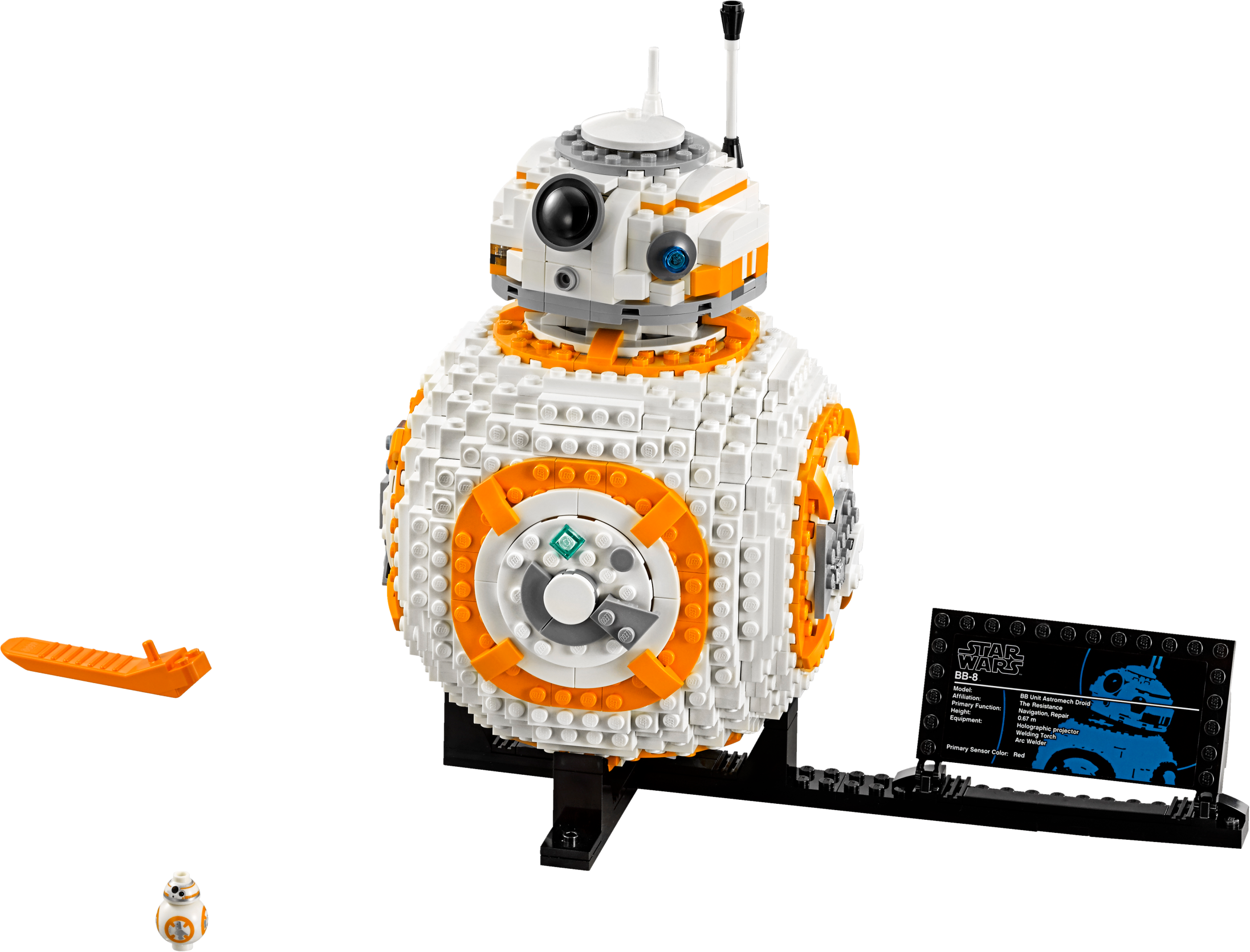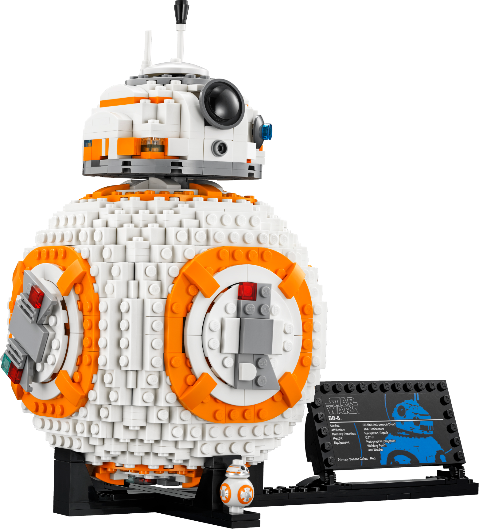 This faithfully reproduced LEGO® Star Wars incarnation of the diminutive BB-8 droid from the new Star Wars movie trilogy makes the perfect gift for any Star Wars or LEGO fan. Turn one wheel at the side to rotate the detailed head, and another to open the access hatch and extend the ‘welding torch’. This faithfully reproduced model also comes with a display stand, decorative fact plaque and small BB-8 figure, making it a great display piece for any bedroom or office. Features authentic detailing, and wheel-activated rotating head and opening hatch with non-functioning welding torch. Also includes a display stand, decorative fact plaque and a small BB-8 figure. This set includes over 1,100 pieces. BB-8 model does not roll. BB-8 without stand measures over 9” (25cm) high and 5” (15cm) wide. Display stand measures over 10” (26cm) long.