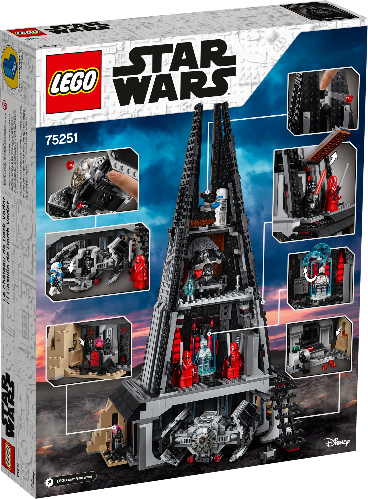 Set the scene for action on planet Mustafar with LEGO® Star Wars 75251 Darth Vader’s Castle! This building set of Vader’s menacing-looking home features lots of great details, including a brick-built lava flow, an underground hangar with mouse droid and docking station, ancient Sith shrine with holocron, racks for extra ammunition, and secret compartments hiding more Sith relics. The hangar also houses a buildable TIE Advanced Fighter model with stud shooters and space to sit the Darth Vader minifigure. There’s also a bacta tank, Darth Vader’s meditation chamber with holographic communication unit, and a meeting platform at the top with a defensive stud-shooter cannon. As well as classic Darth Vader, the set also includes a bacta tank version of the Dark Lord, plus 2 Royal Guards and an Imperial Transport Pilot.