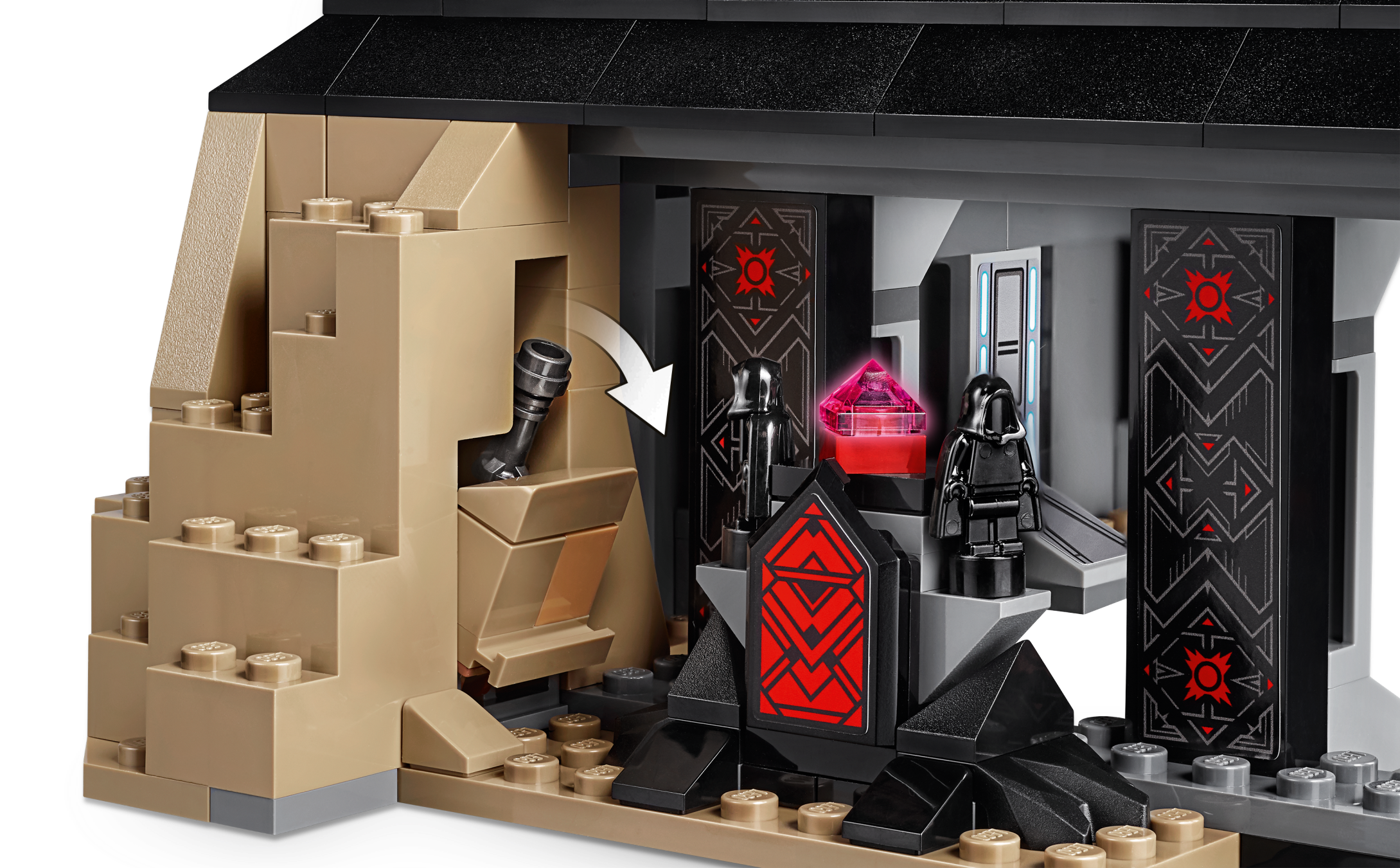 Underground hangar with mouse droid and docking station, ancient Sith shrine with holocron, racks for extra ammunition, Sith relics, secret compartments hiding a Lightsaber handle and a red kyber crystal element, plus space for Vader’s TIE Advanced Fighter.
