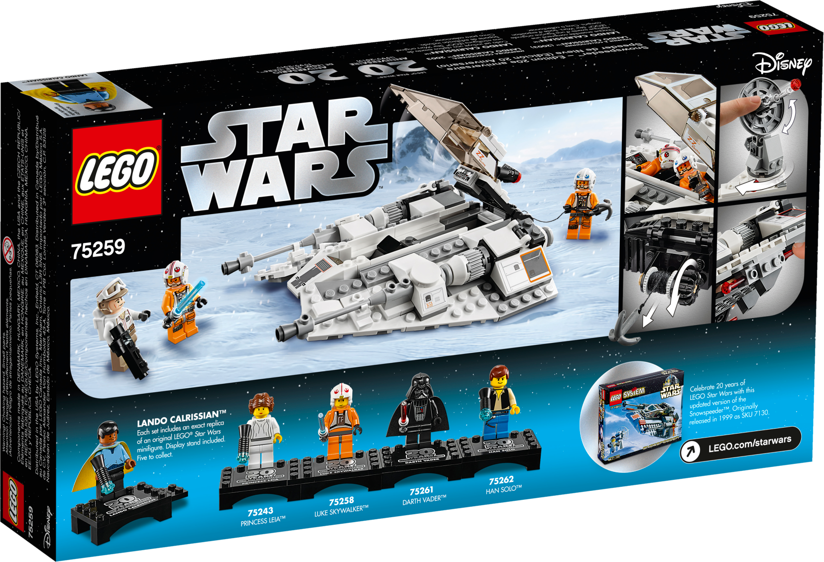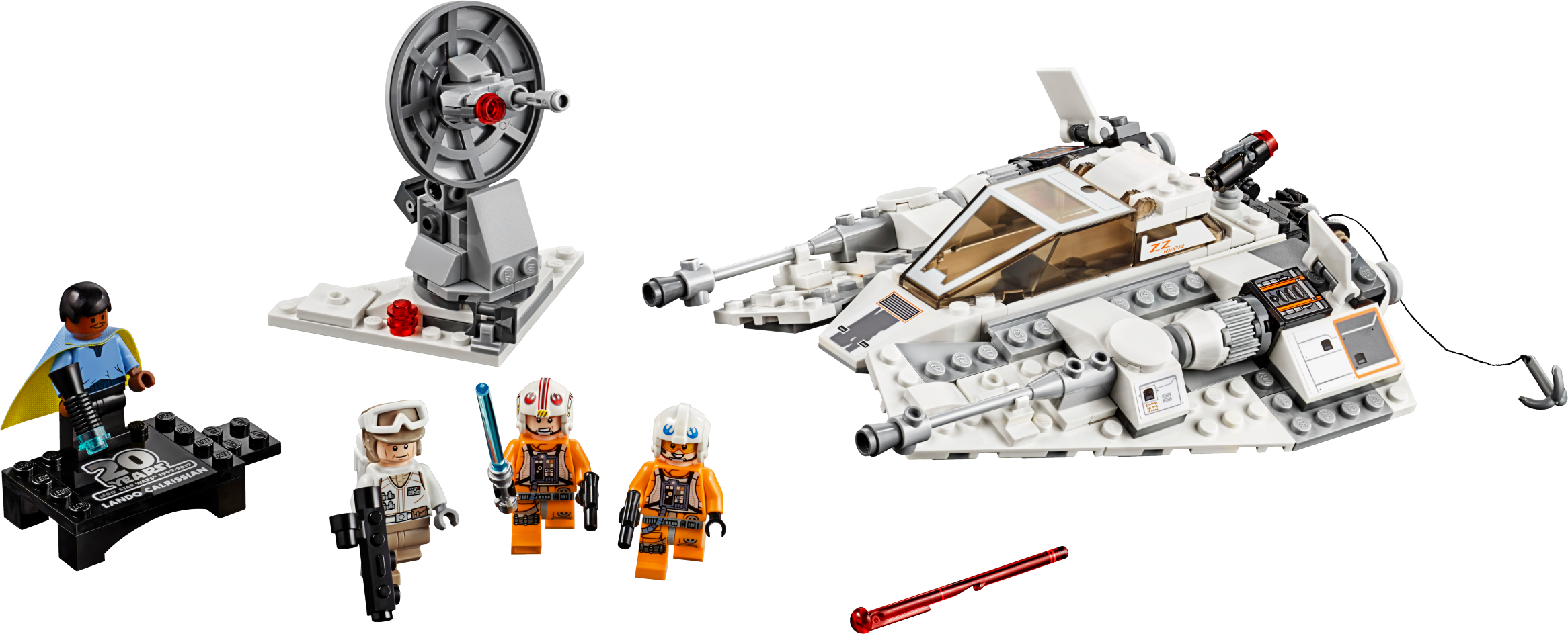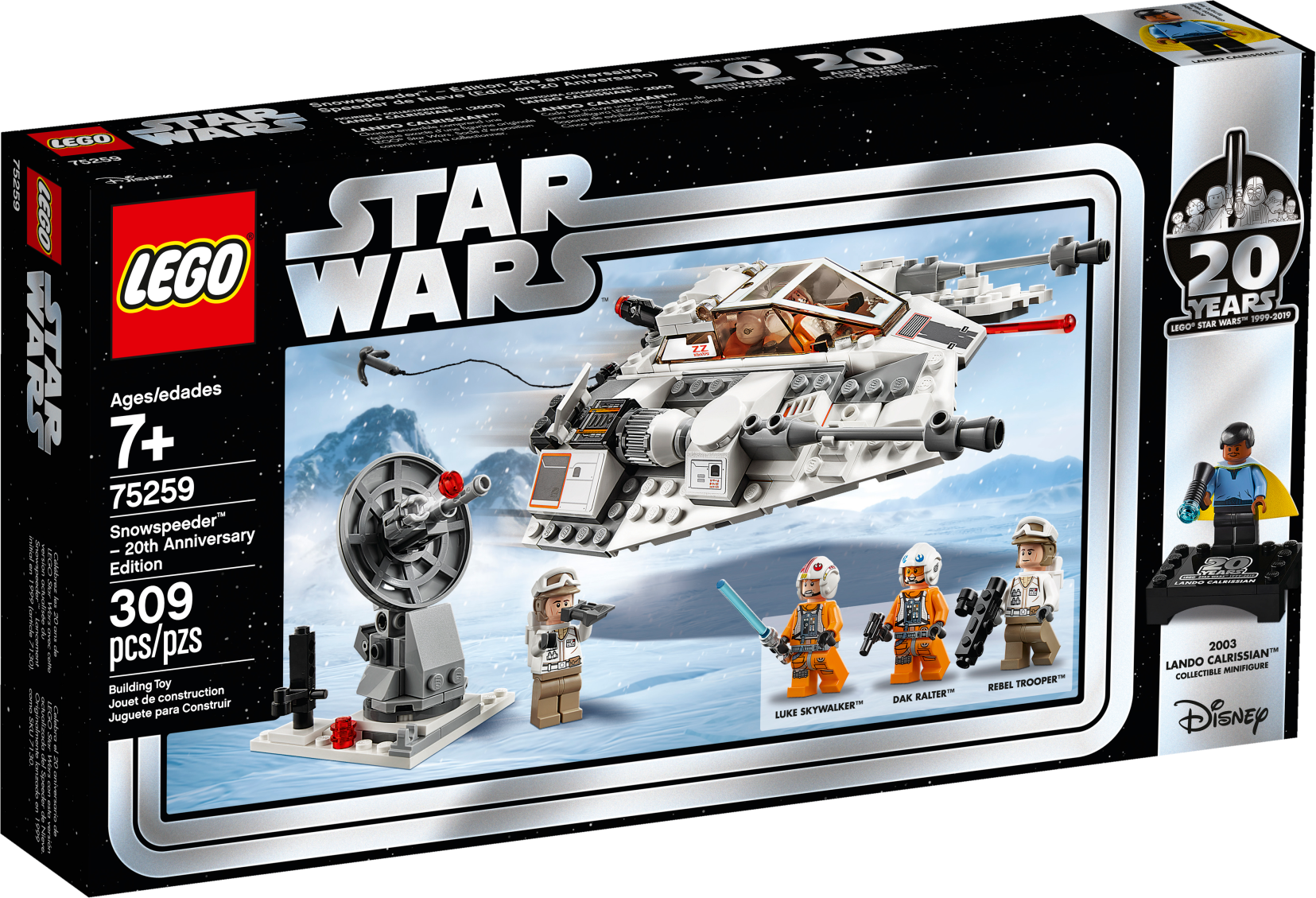 Includes 4 LEGO® Star Wars™ minifigures: Luke Skywalker and Dak Ralter in their pilot outfits, a Rebel Trooper and a bonus anniversary Lando Calrissian on a detachable display stand. Features a Snowspeeder building toy with opening 2-minifigure cockpit, 2 spring-loaded shooters, a stud shooter and harpoon with string at the rear, plus an elevating and rotating gun tower with stud shooter. Weapons include Lando Calrissian's original blaster, Luke's blaster pistol and blue Lightsaber, and the Rebel Trooper’s blaster. Also includes a pair of electrobinoculars. This LEGO® Star Wars™ construction toy is a reinterpretation of the 7130 Snowspeeder vehicle from 1999 and makes a great LEGO Star Wars gift for builders of any age. Lando Calrissian minifigure is a reproduction of the original minifigure from 2003 and includes a 20th anniversary logo. Connect the LEGO® Star Wars™ 20th anniversary minifigure display stands for the perfect collector's item. Play out unforgettable Battle of Hoth scenes from Star Wars: The Empire Strikes Back and other scenes from the Star Wars™ saga for creative play. Snowspeeder model measures over 1” (5cm) high, 7” (18cm) long and 5” (14cm) wide. Gun Tower measures over 3” (8cm) high, 2” (6cm) wide and 2” (6cm) deep.
