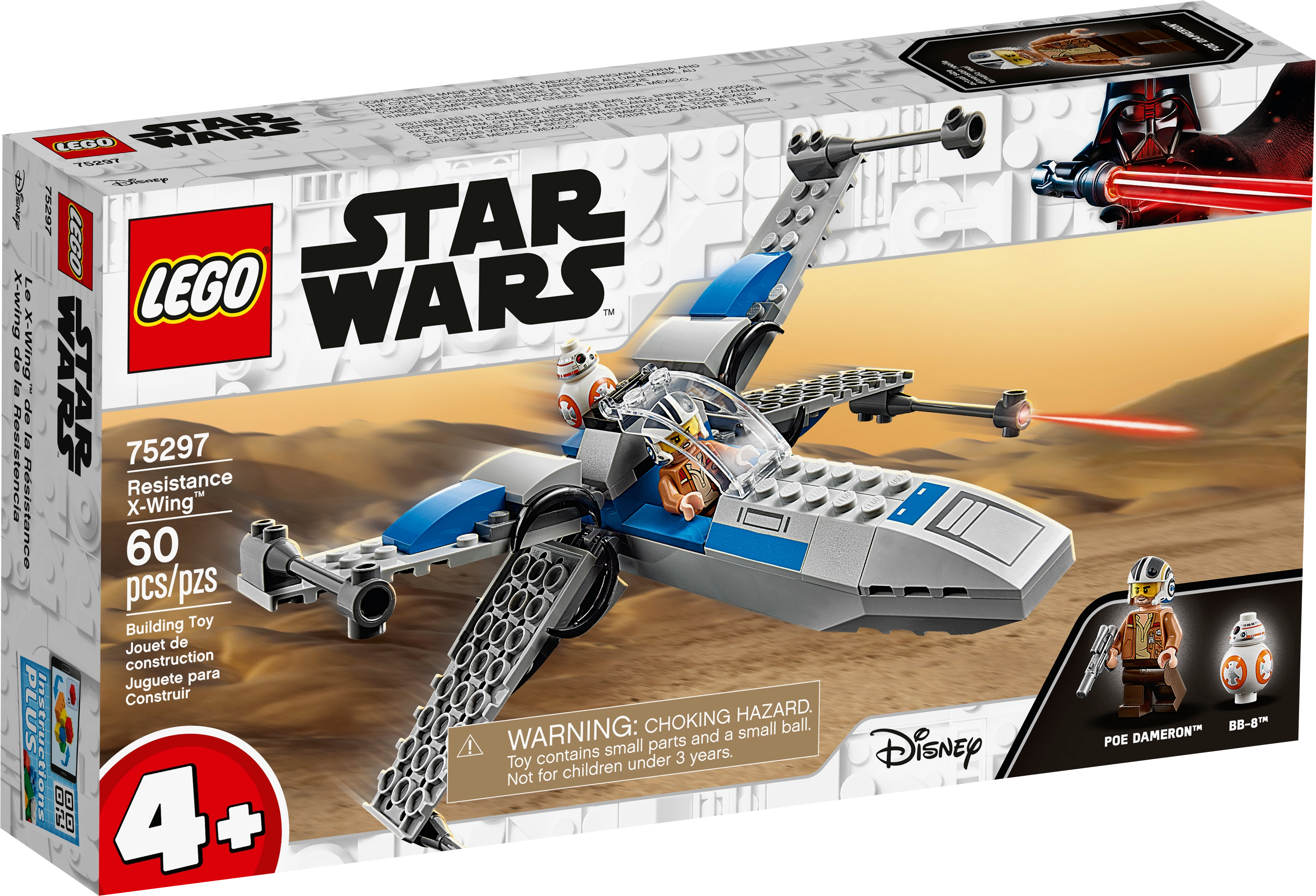 Let youngsters learn to build and role-play with this LEGO Star Wars" Resistance X-wing (75297) for ages 4 and up. A simple-to-build version of the starfighter from Star Wars: The Force Awakens, this awesome building toy has wings that fold out for flight and in for landing. The Poe Dameron LEGO minifigure, which comes with a blaster pistol, fits in the X-wing's opening cockpit and there is space behind for the BB-8 droid LEGO figure. Instructions PLUSCheck out interactive Instructions PLUS, available in the free LEGO Building Instructions app. It has cool zoom and rotate viewing tools to make building this starfighter even more rewarding for kids. Welcome to 4+LEGO Star Wars 4+ buildable toy playsets give younger kids aged 4 and up the best introduction to LEGO building and the Star Wars saga. With Starter Brick bases to help them, they can construct vehicles, buildings and more on their own, or with assistance from an older sibling or adult and get playing fast.