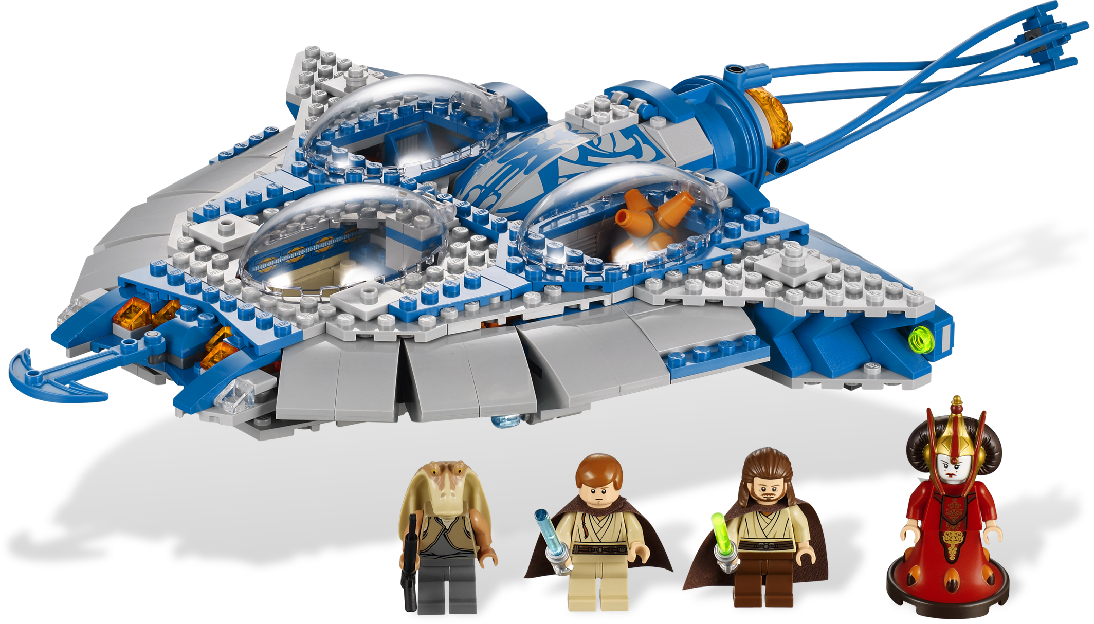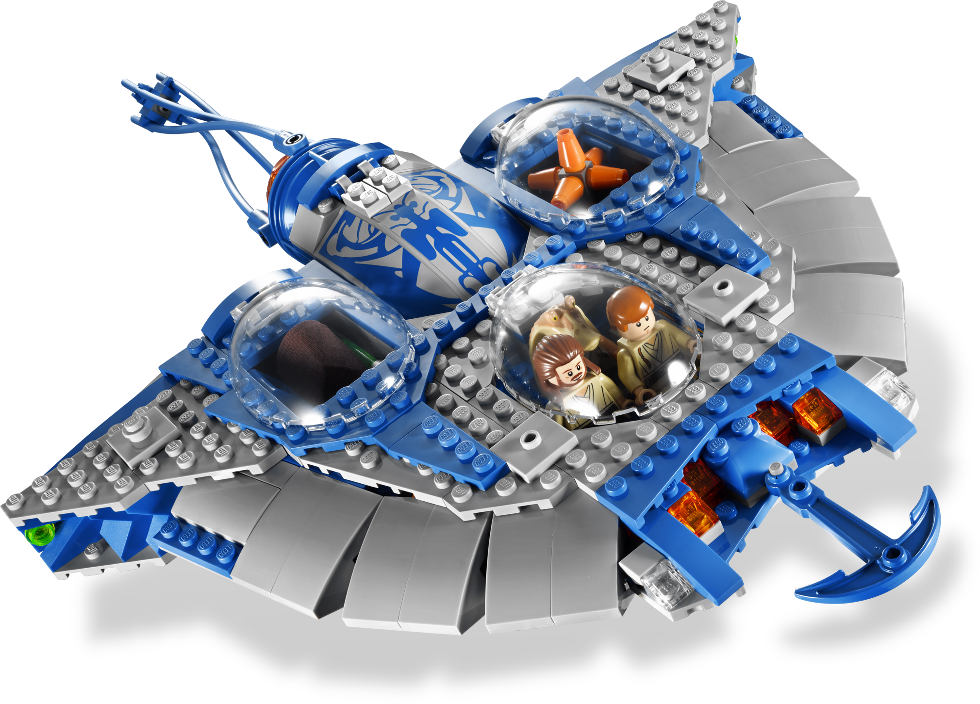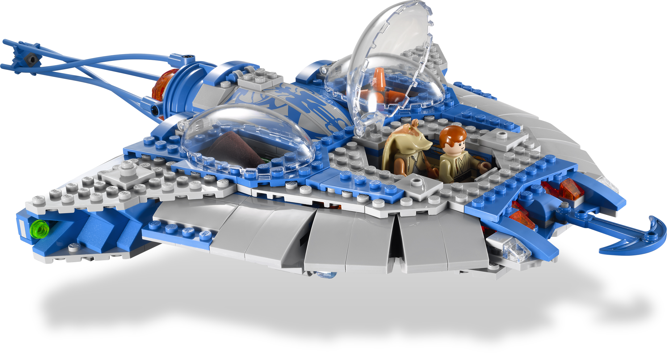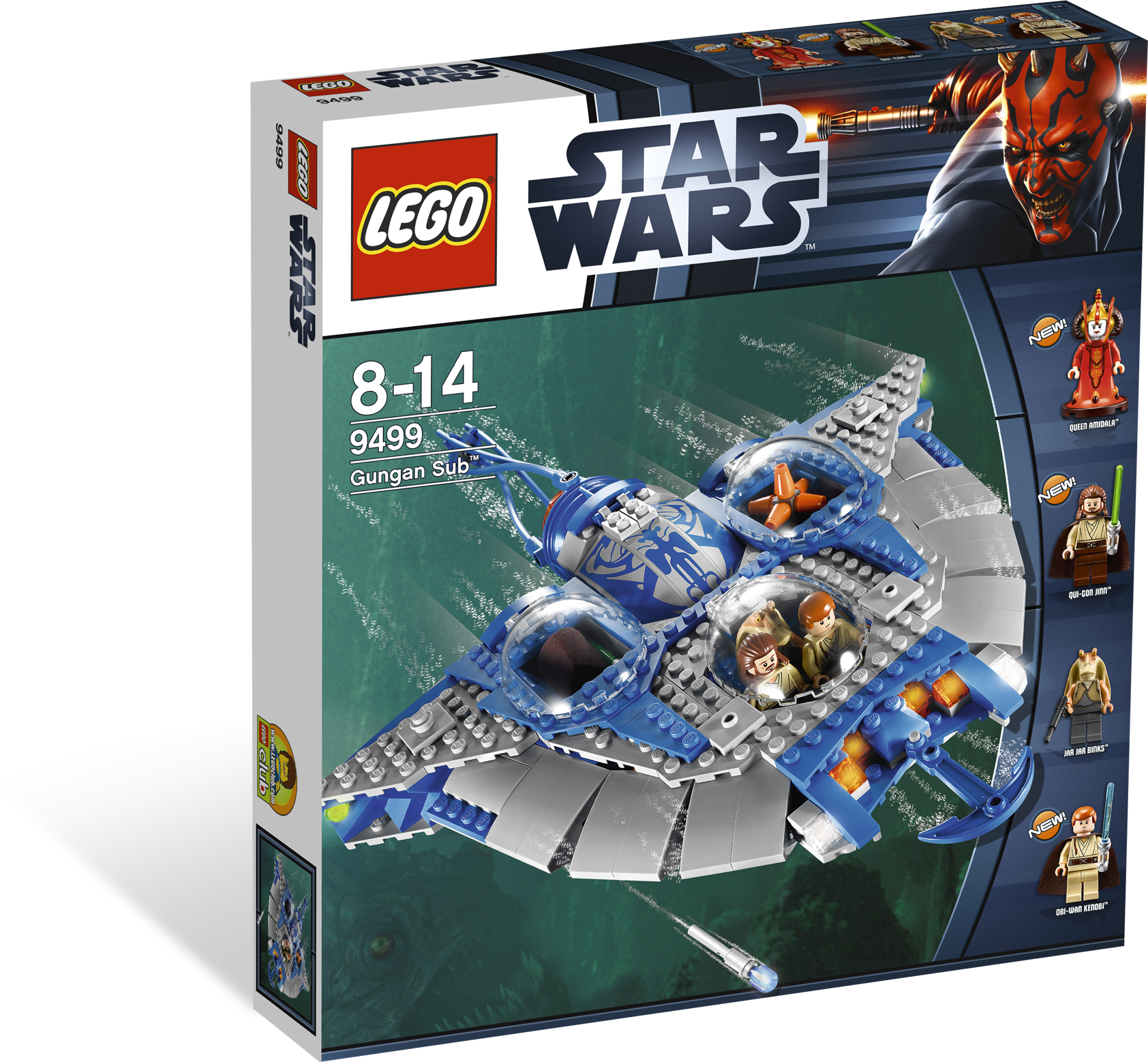 Navigate the underwater world of Naboo with the Gungan Sub! Jar Jar Binks guides his friends Obi-Wan Kenobi and Qui-Gon Jinn through the watery core of planet Naboo in the elegant Gungan Sub. Built to resemble some of the many creatures that inhabit the underwater world, the Gungan Sub features a large cockpit, cargo bays, storage boxes, rotating tail propulsion, missiles and even a mini-sub with harpoon. Includes Queen Amidala, Obi-Wan Kenobi, Qui-Gon Jinn and Jar Jar Binks.• Includes Queen Amidala, Obi-Wan Kenobi, Qui-Gon Jinn and Jar Jar Binks• Features opening cockpit, 2 cargo holds, 2 cargo containers, rotating tail, 4 flick missiles, detachable mini-sub with harpoon and 2 Lightsabers• Detach the mini-sub!• Fire the missiles!• Rotate Qui-Gon Jinn and Obi-Wan Kenobi minifigure heads to reveal decoration with underwater breathing devices!• Gungan Sub measures over 16" (43cm) long and 10" (27cm) wide