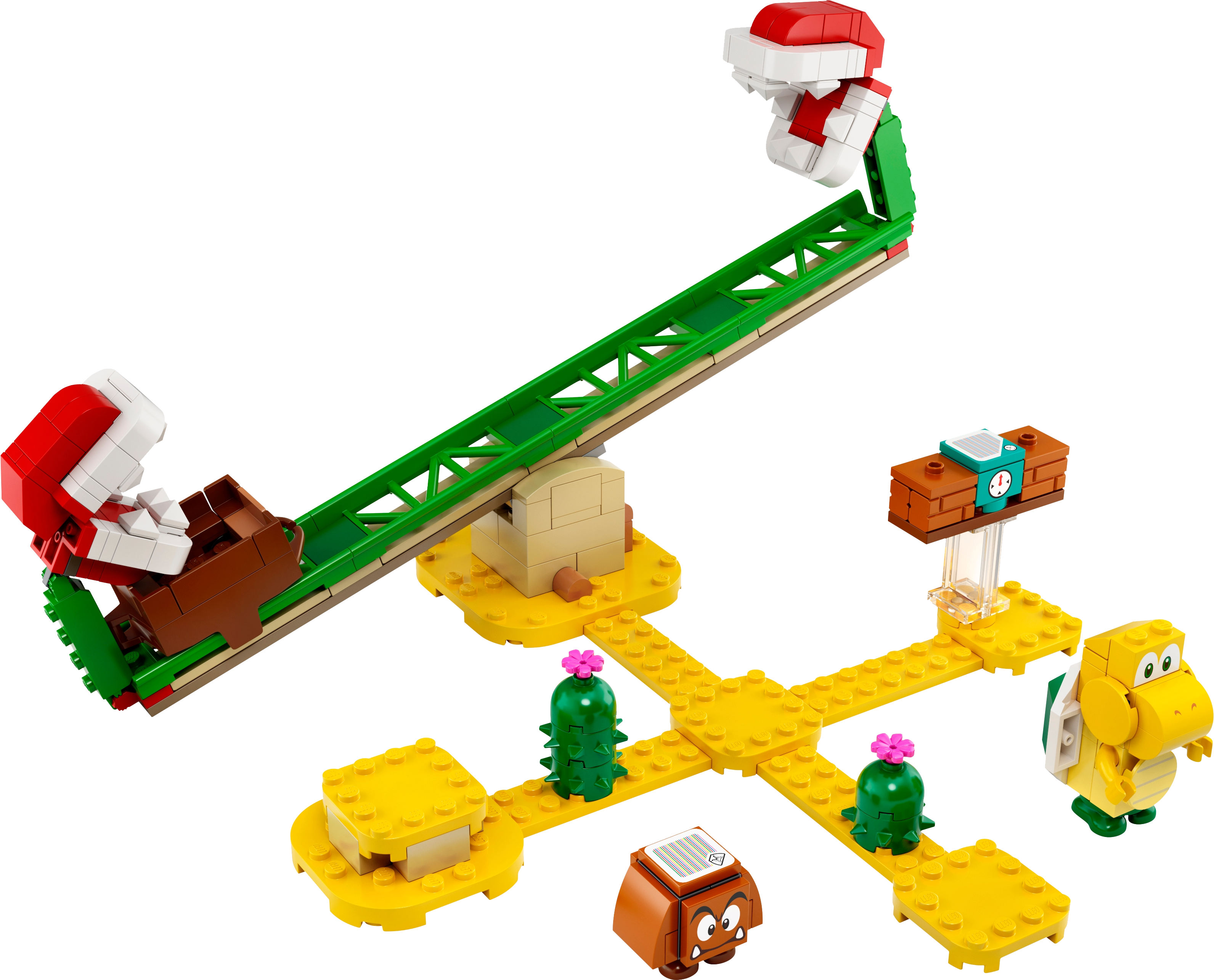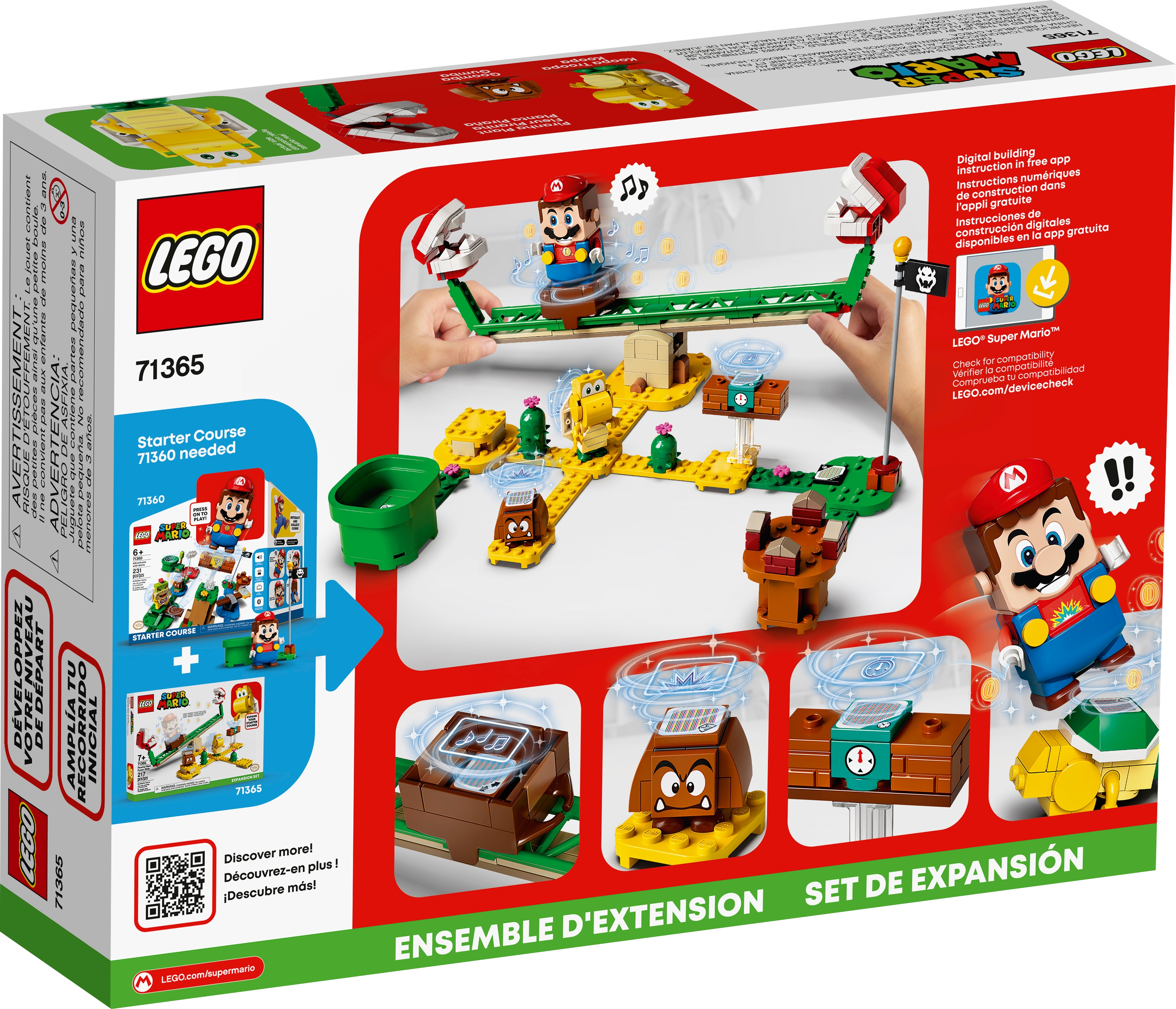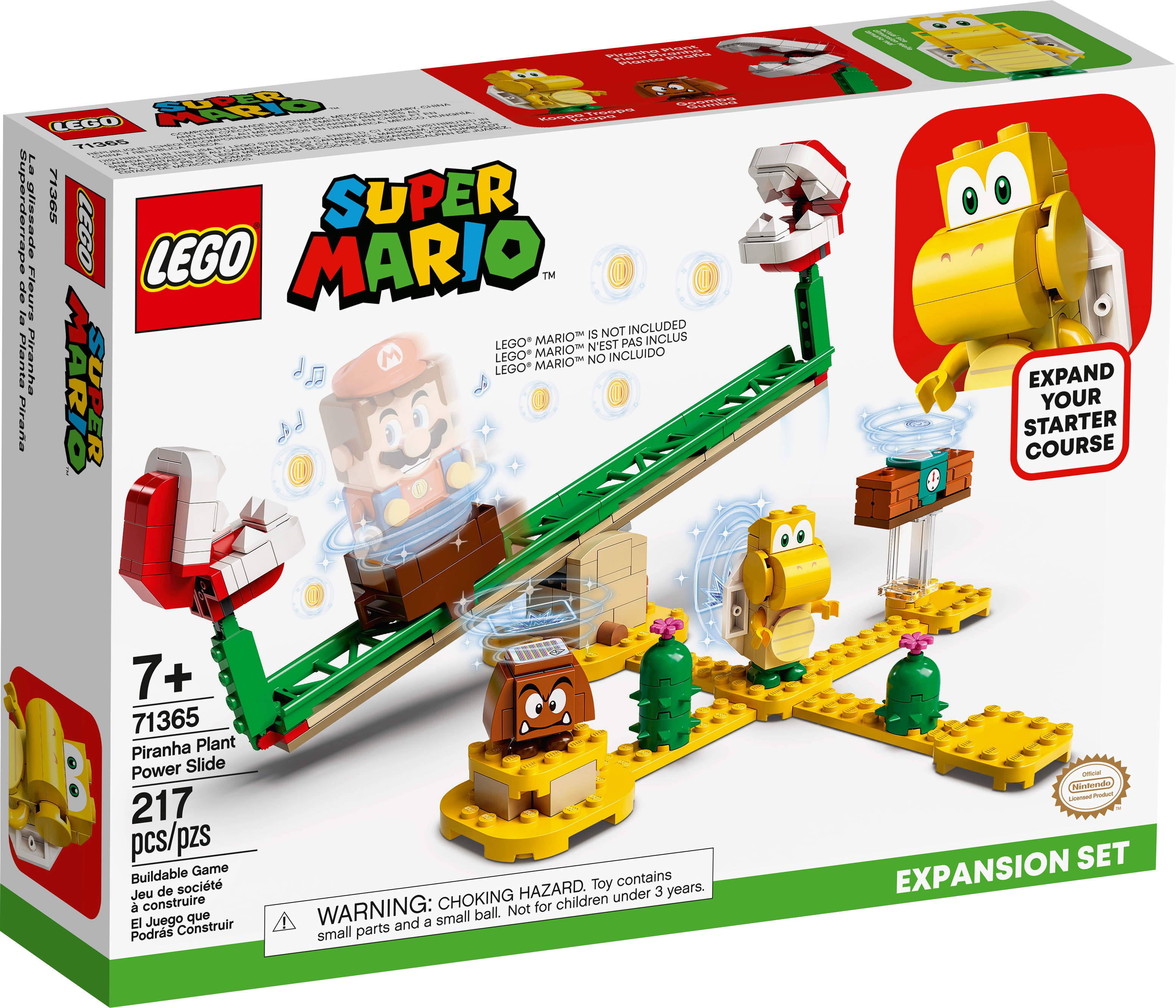 Fans can add a Piranha Plant Power Slide challenge to their LEGO® Super Mario™ universe and train to be better at collecting coins with this fun Expansion Set (71365). This collectible toy playset features a platform on rails on a seesaw with Piranha Plants at either end, a Time Block to earn extra time on the course for LEGO® Mario™ (figure not included), plus Goomba and Koopa Troopa figures to defeat. A great gift for kids, this building toy combines with the Adventures with Mario Starter Course (71360), which has the LEGO Mario figure and can be rearranged for fresh gameplay options.Free appThe free LEGO Super Mario app comes with Instructions PLUS to help build this module, plus suggestions for creative ways to build and play, and is a safe platform to share ideas with other fans.Unlimited creative funLEGO Super Mario sets bring a family-favorite character into the real world. The Starter Course building toy, Expansion Sets and Power-Up Packs let fans build their own unique levels.Kids can add this brilliant Piranha Plant Power Slide Expansion Set (71365) to their LEGO® Super Mario™ Adventures with Mario Starter Course (71360) and compete against friends to master the sliding, seesaw challenge.This collectible toy playset has a buildable seesaw with a platform on rails for LEGO® Mario™ (figure not included) to stand on. Players must seesaw quickly to win coins but stay clear of the Piranha Plants at each end.The Time Block in this Expansion Set offers players the chance to gain more time on the course. This module also includes Goomba and Koopa Troopa toy figures for LEGO® Mario™ to defeat to win more coins.This 217-piece LEGO® building toy makes a fun birthday or holiday gift for kids aged 7+, inspiring them to create their own unique levels and learn new skills to become better at collecting coins.Measuring over 5” (12cm) high, 10.5” (27cm) wide and 9” (23cm) deep in its basic formation, this module can be rearranged and combined with the Starter Course and other LEGO® Super Mario™ Expansion Sets in many ways.No batteries required for this creative toy building set – it comes to life when combined with the LEGO® Mario™ figure in the Starter Course. The set comes with clear instructions so kids can build independently.The free LEGO® Super Mario™ app features digital building instructions and cool viewing tools, and suggests creative ways to play and more. For a list of compatible Android and iOS devices, visit LEGO.com/devicecheck.Collectible LEGO® Super Mario™ toy building sets bring an iconic character into the real world and give kids and all fans loads of options to expand, rebuild, customize and create unlimited challenges.No need for a Super Star’s power to connect or pull apart LEGO® bricks! They meet the highest industry standards to ensure a perfect, easy connection every time and consistently robust builds.LEGO® building bricks and pieces are dropped, crushed, twisted, heated and rigorously analyzed to ensure that every LEGO set meets the highest safety standards.