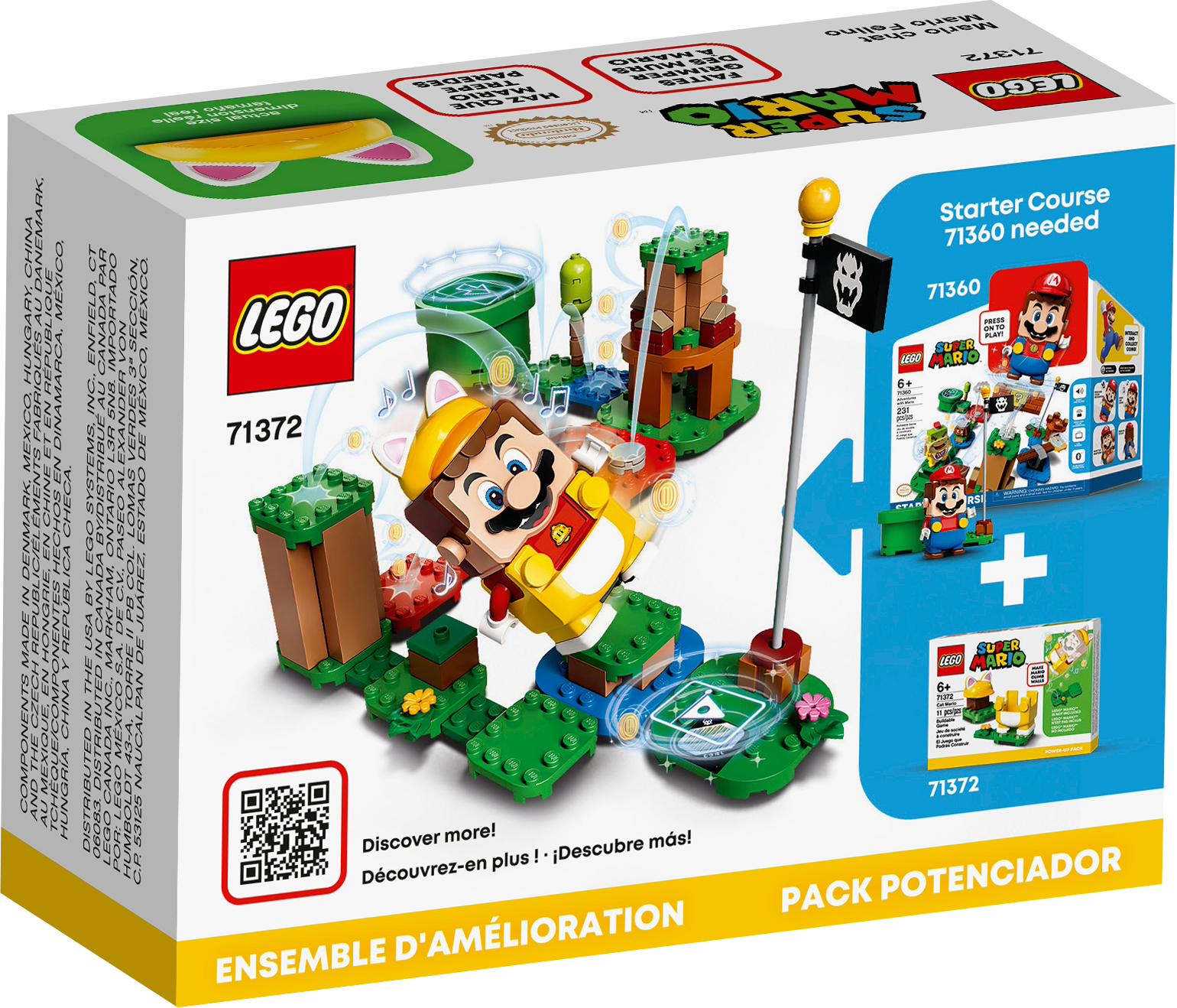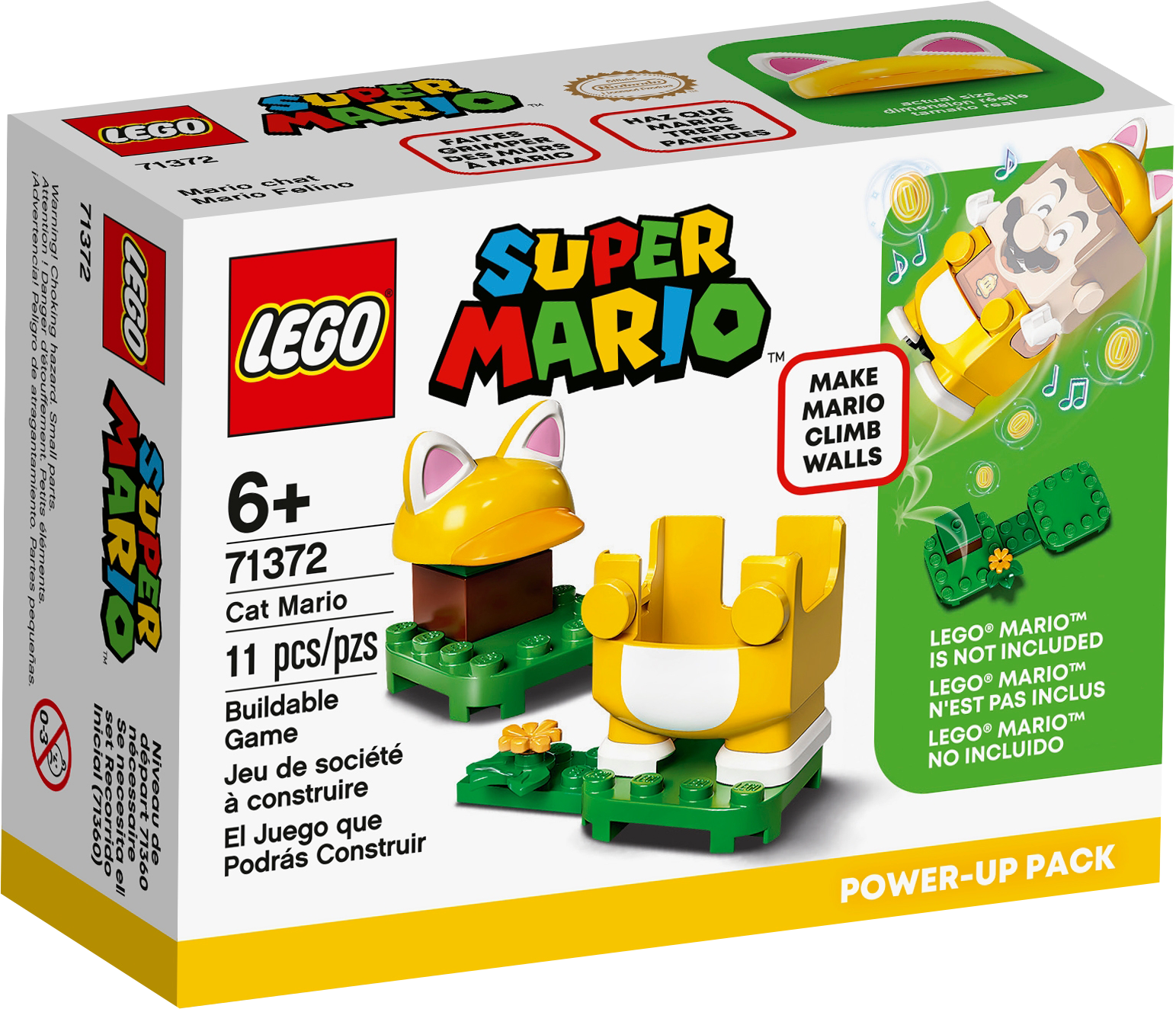 Kids add feline ability to their LEGO® Super Mario™ gameplay with this Cat Mario Power-Up Pack (71372). It features an interactive outfit for LEGO® Mario™ (figure not included) to wear that causes him to make purring sounds and meow and gives him the power to walk up walls and win digital coins. This unique toy playset makes a great gift for kids who own the Adventures with Mario Starter Course (71360), which includes the LEGO Mario figure.Build and playBuilding instructions for this LEGO set can be found in the box and on the free LEGO Super Mario app. The app is a safe environment for kids to share their creations and includes inspiration for creative ways to build and play, plus other fun stuff.Competitive funCollectible LEGO Super Mario toy playsets bring a family-favorite character into the real world and are great for competitions with friends or as solo games. The Starter Course, Expansion Sets and Power-Up Packs allow fans to create their own levels for unlimited creative fun. Give kids cat-like qualities in their LEGO® Super Mario™ games with this Cat Mario Power-Up Pack (71372), featuring a buildable, interactive outfit for LEGO® Mario™ (figure not included) to wear. This brick-built accessory fits on the LEGO® Mario™ figure that is included in the Adventures with Mario Starter Course (71360) toy playset, causing unique sounds and a unique image to appear on Mario’s torso screen. The LEGO® Mario™ figure meows and purrs when he wears the cat costume. He also gains the special ability to walk up vertical obstacles and collect digital coins to boost the player’s score. This collectible, 11-piece LEGO® building toy makes a top birthday or holiday gift for kids and fans aged 6 and up, adding extra interactive fun to their Adventures with Mario Starter Course (71360) and Expansion Sets. Other LEGO® Mario™ upgrades are available to use with the Starter Course and Expansion Sets, including the Fire Mario Power-Up Pack (71370), Propeller Power-Up Pack (71371) and Builder Mario Power-Up Pack (71373). No batteries required for this creative building toy – just add the outfit to the LEGO® Mario™ figure in the Starter Course set to activate. The pack includes illustrated instructions to help kids build independently. The free LEGO® Super Mario™ app features building instructions and inspiration for creative ways to play and is a safe forum to share ideas. For a list of compatible Android and iOS devices, visit LEGO.com/devicecheck. LEGO® Super Mario™ toy building sets bring an iconic character into the real world. They allow fans to expand and rebuild to create unlimited challenges to attempt to master solo or with friends and family. No need for a Super Star’s power to connect or pull apart LEGO® bricks! They meet the highest industry standards to ensure a perfect, easy connection every time and consistently robust builds. LEGO® building bricks and pieces are dropped, crushed, twisted, heated and rigorously analysed so you can be assured that every LEGO set meets the highest safety standards.