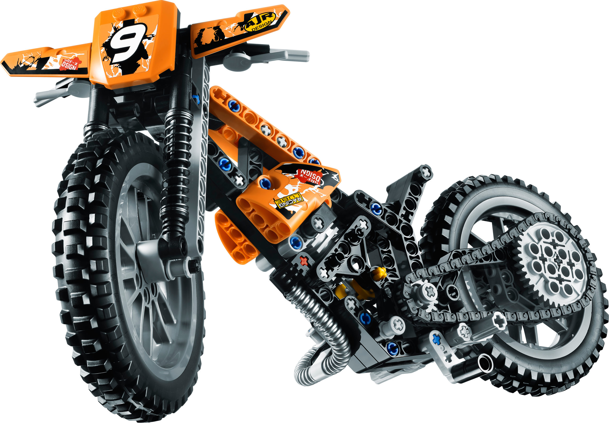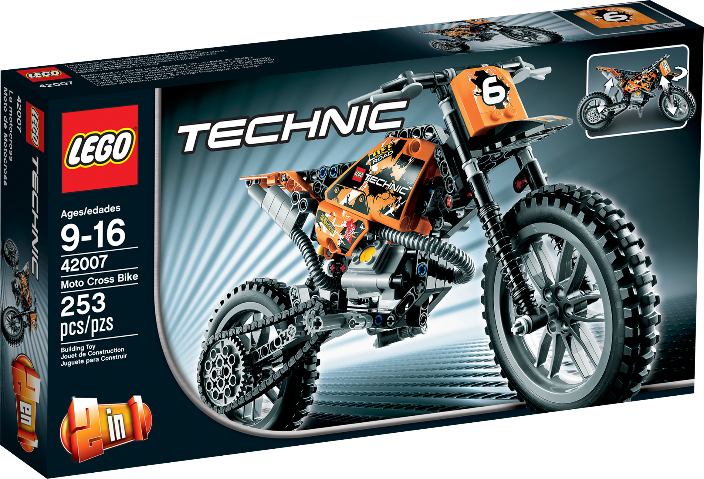 Ride the roughest trails with the Moto Cross Bike! Tear up the trails on the awesome Moto Cross Bike! This tough-as-dirt LEGO® Technic 2-wheeler has lots of authentic features, like chain-drive, working pistons, front and rear suspension and knobby tires. This cool 2-in-1 model is just like the real thing! Rebuilds into a racing Speedway Motorbike with front suspension, rear suspension and engine with moving pistons.• Features chain-drive, working pistons, front and rear suspension and knobby tires• Absorb the biggest bumps with the working suspension!• See the pistons move!• Kick up the dirt with knobby rubber tires!• Build a realistic chain-drive!• 2-in-1 model: Rebuilds into a Speedway Motorbike with front suspension, rear suspension and engine with moving pistons• Measures over 6" (16cm) high, 12" (31cm) long and 4" (11cm) wide• Speedway Motorbike measures over 5" (15cm) high, 11" (30cm) long and 4" (12cm) wide