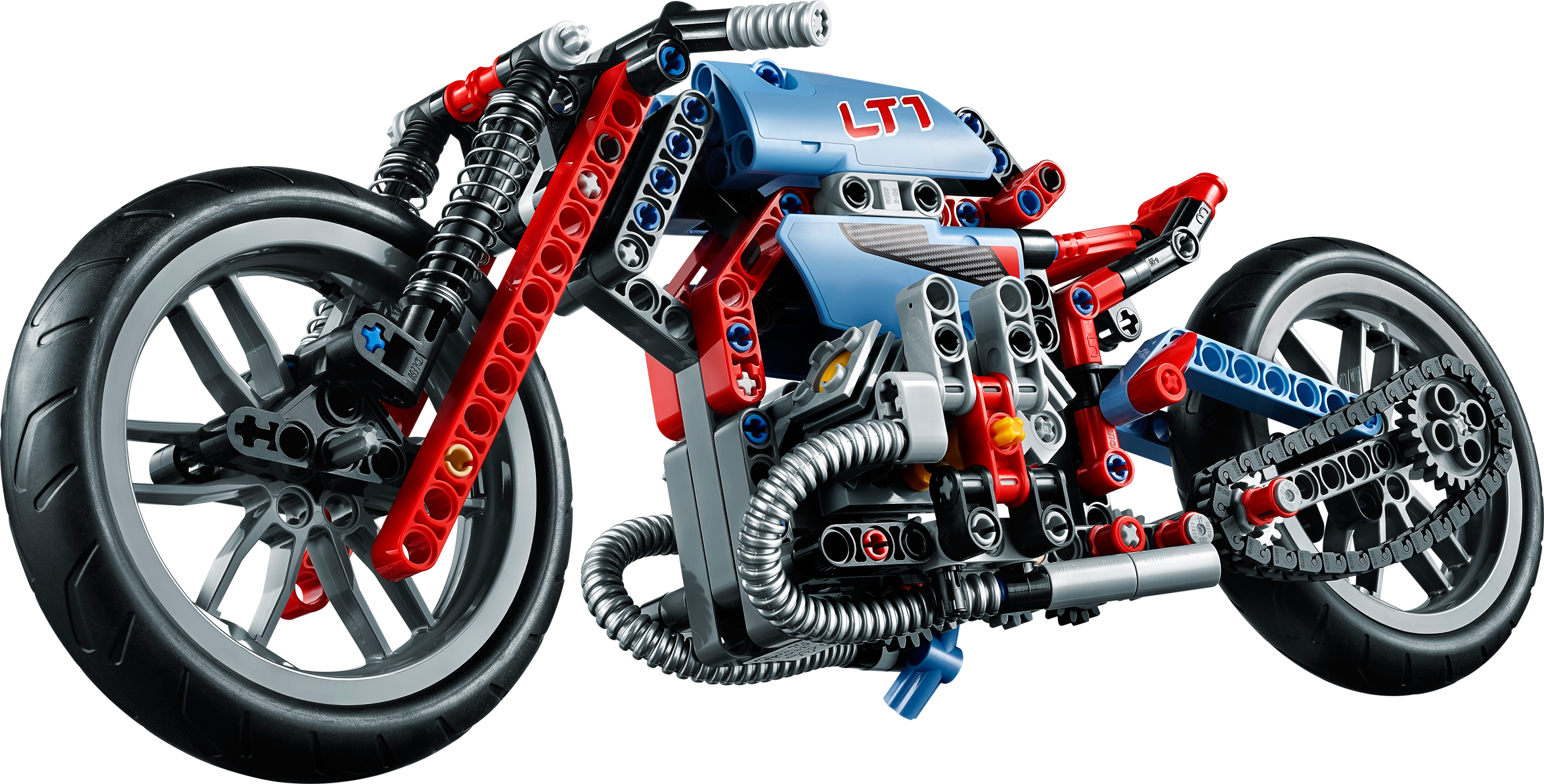 Cruise on the open road with the awesome LEGO® Technic Street Motorcycle! This cool, sturdy model has all the features of the real-life machine, including full fairing, rugged front and rear suspension, chain drive, working steering, kickstand, detailed engine with moving pistons and a sporty, light blue and red color scheme. Experience the joy of motorcycling! This 2-in-1 model rebuilds into a cool Retro Bike.