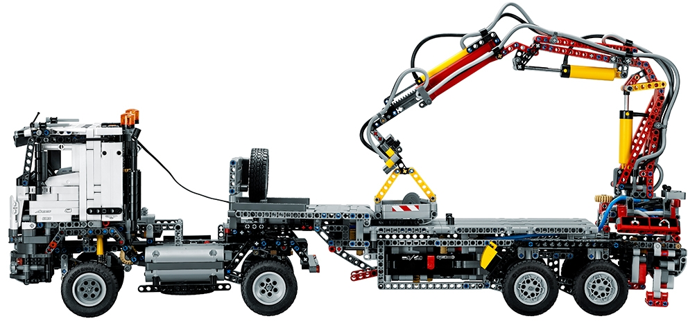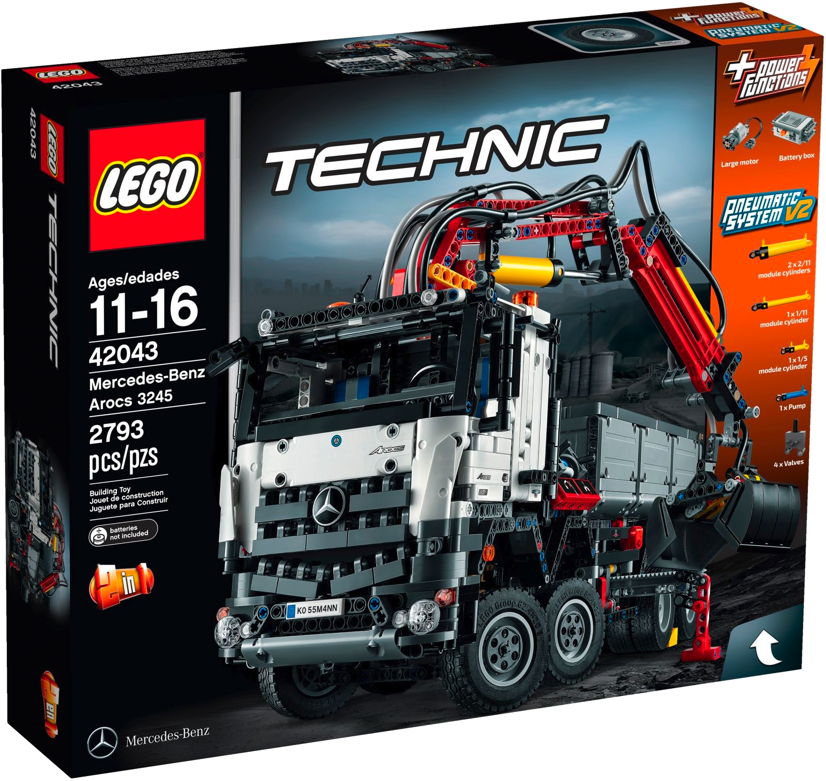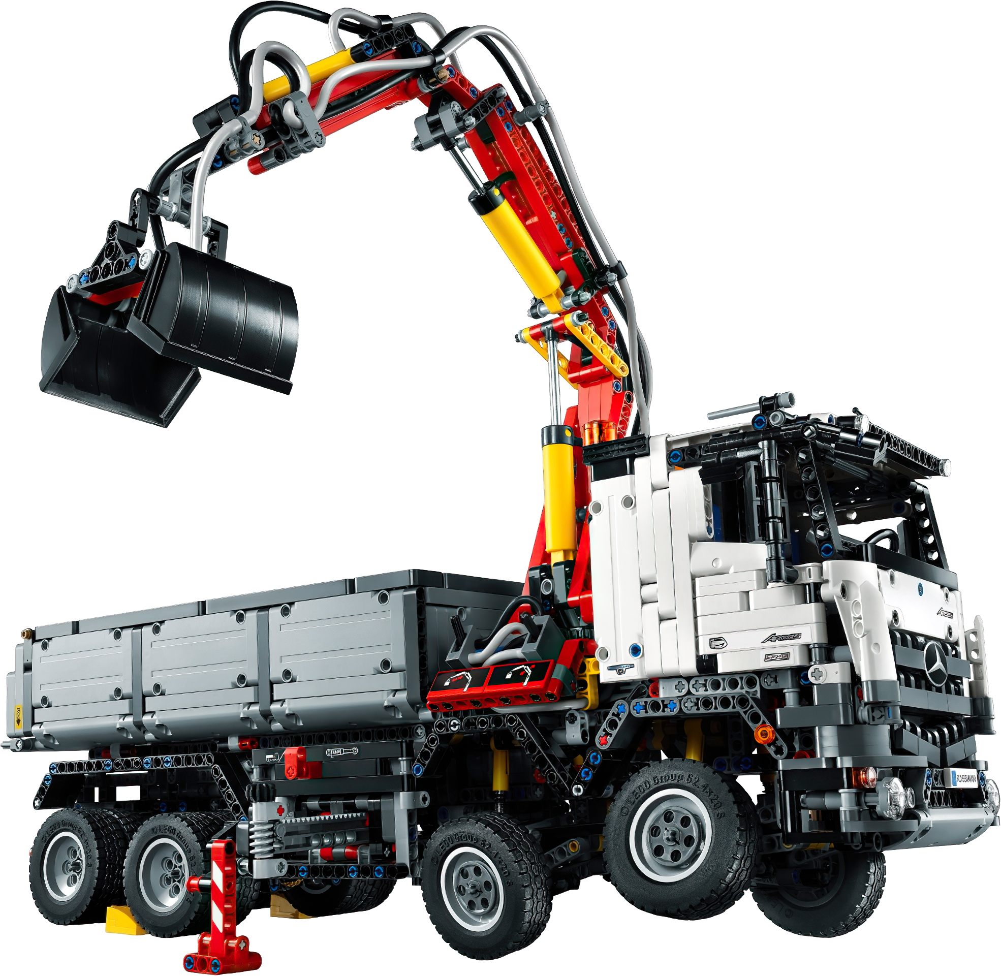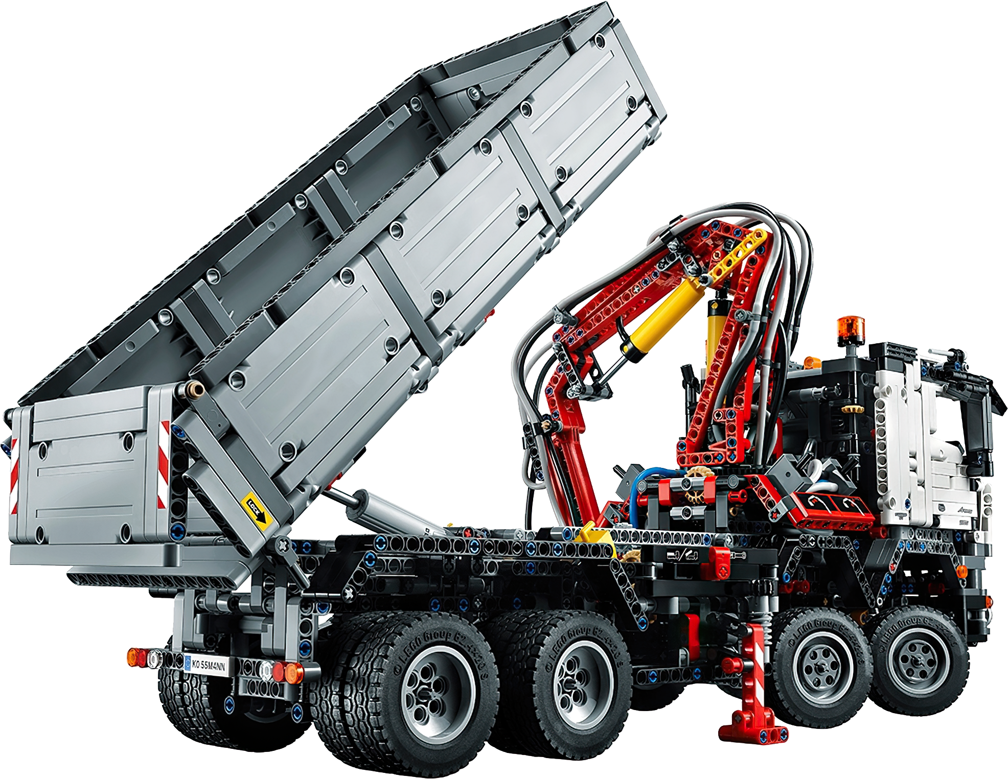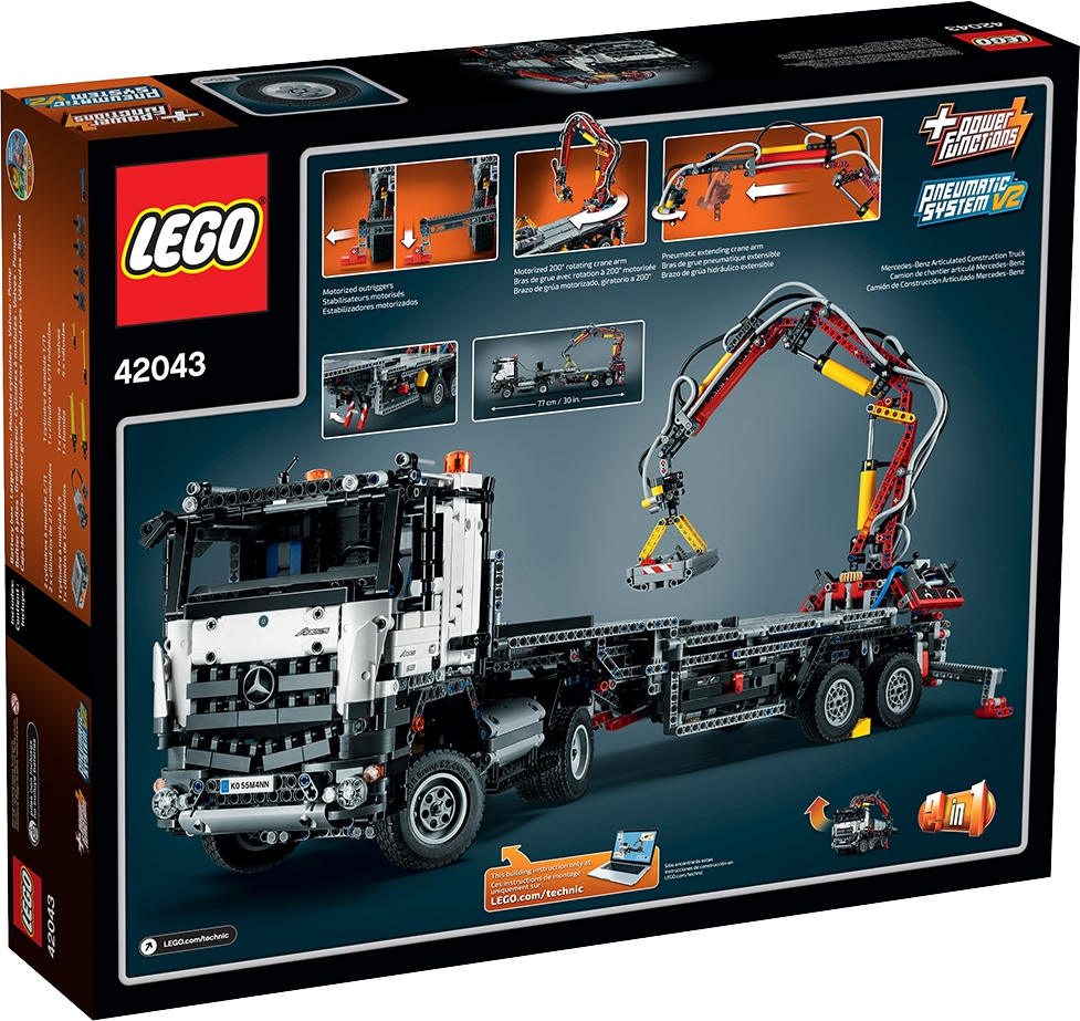 Climb aboard the awesome Mercedes-Benz Arocs 3245! This huge, robust, 2-in-1 LEGO® Technic model is packed with authentic details and features. Turn on the included Power Functions large motor and engage the advanced pneumatic system (new for fall 2015) for complete control over an array of exciting motorized functions. You can operate the ultra-versatile crane arm mechanism, open and close the grabber, extend the outriggers or raise and lower the tipper body! Twin axle steering, double differential drive and fully independent suspension provide ultimate maneuverability, and the driver’s cab tilts to reveal a detailed 6-cylinder engine with moving pistons. Open the cab doors to access the detailed interior with dashboard, blue seating and steering wheel with Mercedes-Benz logo. This meticulously detailed 2015 model also features an extendable crane arm, 4 suspended axles, double wheels on the 2 rear axles, opening tailgate, warning beacons, wing mirrors and comprises 2753 elements, making it the largest LEGO Technic model ever produced. An authentic white, gray and black color scheme and iconic 3-pointed Mercedes-Benz star add the finishing touches to this impressive model. When you feel like another building challenge, rebuild it into the rugged Mercedes-Benz Articulated Construction Truck.