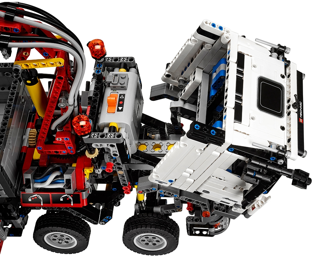 Features a LEGO® Power Functions large motor and an advanced pneumatic system for an array of motorized features, including extendable outriggers, automated crane arm and grabber, and a working tipper body