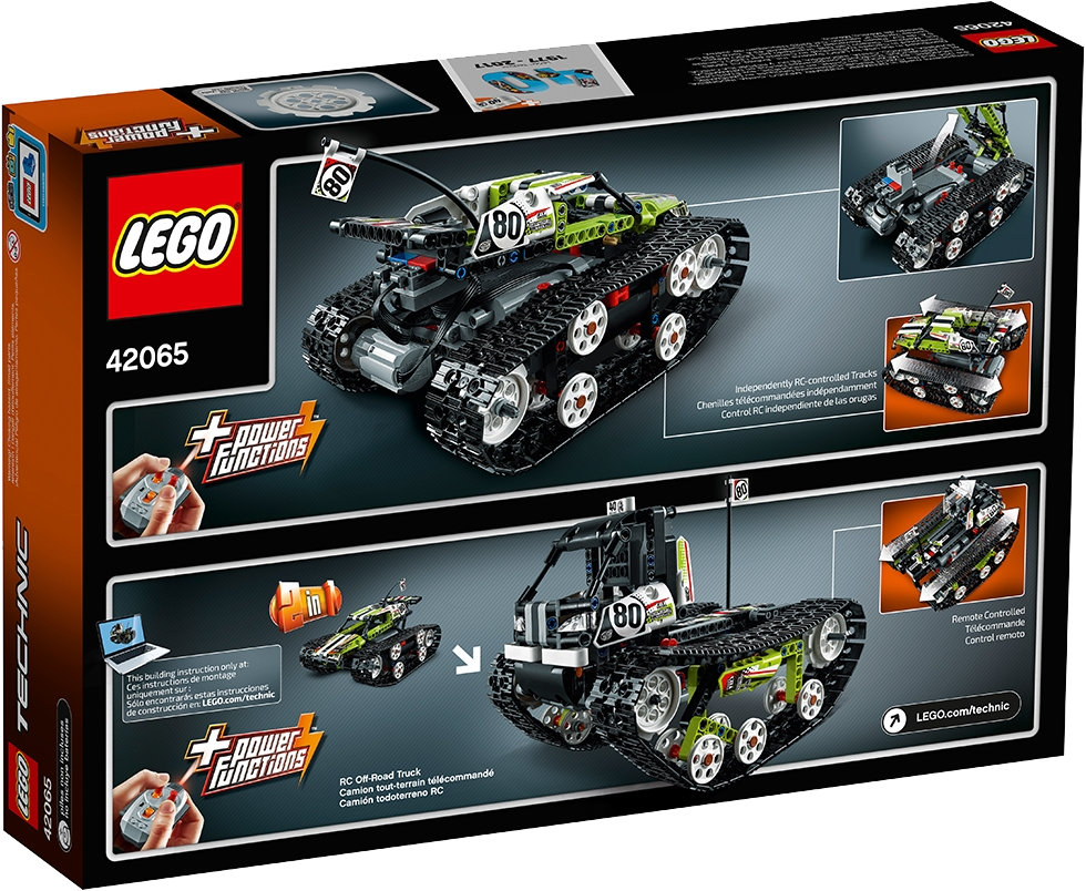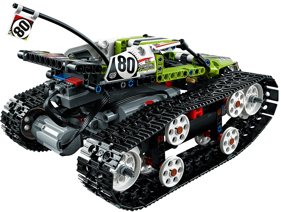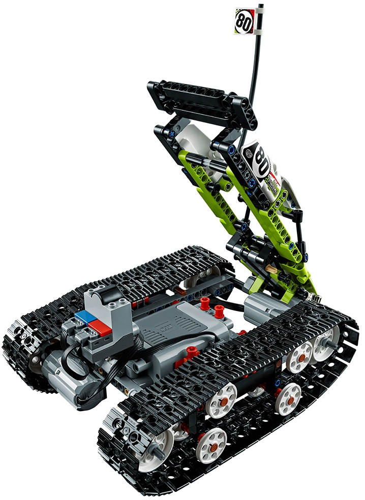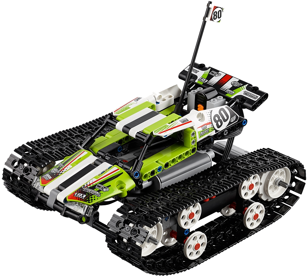 Spin, turn, clamber over obstacles and race at breakneck speed with this fully motorized, remote-controlled LEGO® Technic RC Tracked Racer, featuring a lime-green, white and black color scheme with decorative stickers, driver’s cab with roll bars and two large tracks, each powered by six wheels. Drive forward or backward, left or right and make 360° turns. Rebuild to create an RC Off-Road Truck. Features a high-speed, fully motorized, remote-controlled vehicle with large tracks. Check out the fresh lime-green, white and black color scheme with cool stickers. Drive forward, backward, left and right, perform turns up to 360° and drive over large obstacles with ease. A uniquely decorated LEGO® Technic 40th Anniversary brick is included with this model. Includes the following LEGO® Power Functions components: two medium motors, one receiver, one battery box and a remote control. This LEGO® Technic model is designed to provide an immersive and rewarding building experience. This set offers an age-appropriate building experience for ages 9-16. Designed for indoor use only. 2-in-1 model: rebuilds into an RC Off-Road Truck. Batteries not included. RC Tracked Racer measures over 3” (9cm) high, 8” (22cm) long and 6” (16cm) wide. RC Off-Road Truck measures over 5” (15cm) high, 7” (20cm) long and 6” (16cm) wide.