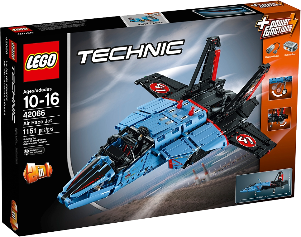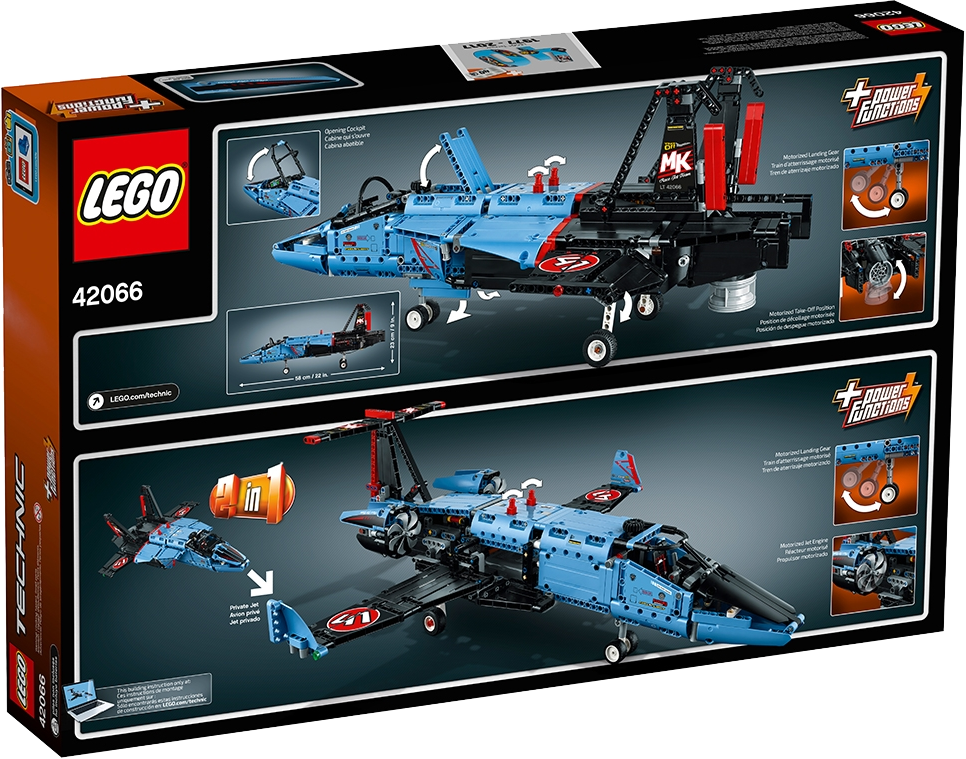 Includes a LEGO® Power Functions motor for an array of motorized functions, including an adjustable jet nozzle, opening fuselage, retractable undercarriage and adjustable flaps, plus working front steering, movable tail rudders and an opening cockpit.
