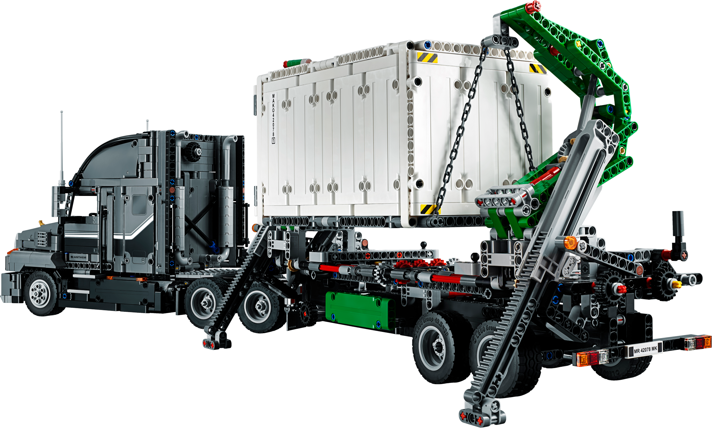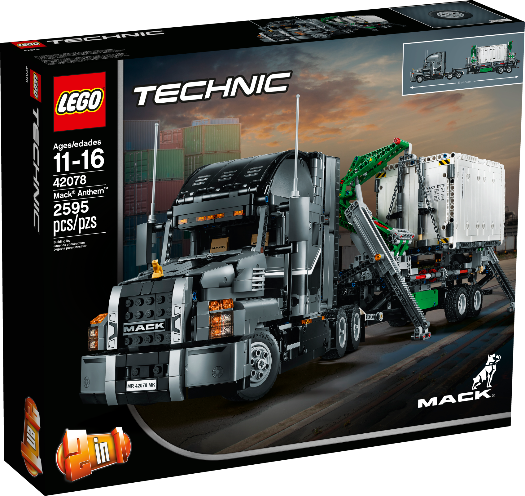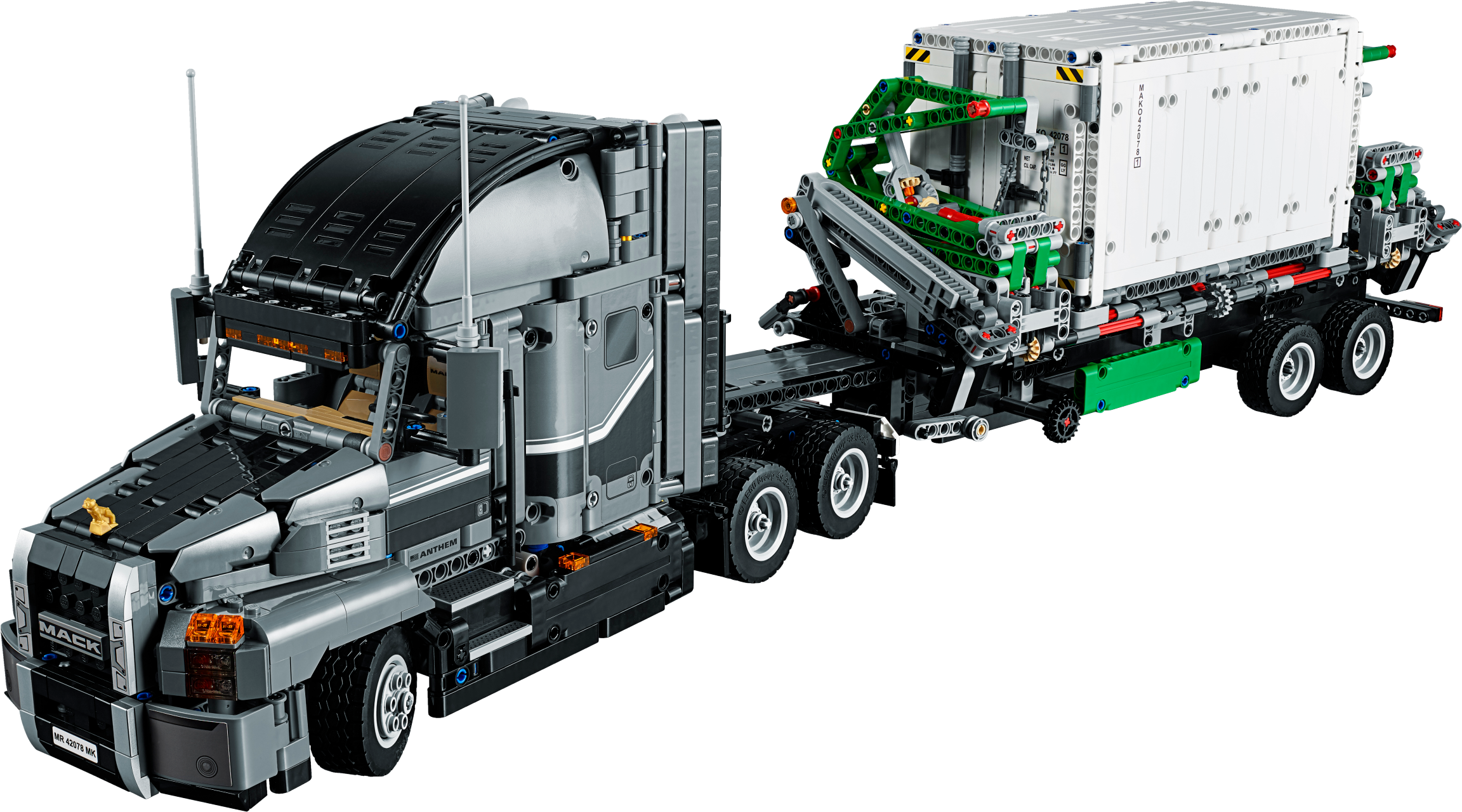 Explore state-of-the-art engineering and design with this authentic LEGO® Technic replica of the Mack Anthem truck and trailer. Developed in partnership with Mack® Trucks Inc., this model comes with an array of realistic technical details and functions, including front-axle steering, rear wheel drive and a 6 cylinder straight engine with working pistons and spinning radiator fan. The detachable trailer has extendable outriggers, working landing legs, synchronized crane arms with side loading capability, and a loadable container with lockable doors, while the accessible driver’s cab has opening doors, adjustable seats, detailed dashboard, steering wheel, sun visors and a bunk bed. This 2-in-1 advanced building set also features a Mack bulldog hood ornament, and can be rebuilt into a detailed replica of the iconic Mack LR garbage truck. Features authentically designed bodywork, front-axle steering, rear wheel drive, 6 cylinder straight engine with moving pistons and spinning radiator fan, detailed driver’s cab with opening doors, adjustable seats, steering wheel, dashboard, sun visors and a bunk bed, and adjustable wing mirrors. Also features a detachable trailer with extendable outriggers, landing legs, synchronized crane arms and a container with lockable doors. Includes special decorated elements and manufacturer´s logo, plus an iconic Mack® bulldog hood ornament and a collection of authentic stickers. Check out the authentic gray, black, white and green color scheme. Steer the truck into position, lower the landing legs, extend the outriggers and operate the synchronized crane arms to side-load the container onto the trailer. Lift the hood to reveal a detailed 6 cylinder straight engine with moving pistons and spinning radiator fan. Open the side panels to access the fuel tanks. This LEGO® Technic advanced building set is designed to provide an immersive and rewarding building experience. This set includes over 2,590 pieces and is suitable for ages 11-16. 2-in-1 model: rebuilds into a replica of the iconic Mack LR garbage truck. Building instructions for the Mack LR garbage truck are available at LEGO.com/technic. Mack Anthem truck and trailer with crane boom and landing legs extended measures over 10” (27cm) high, 32” (83cm) long and 7” (18cm) wide, and over 8” (22cm) high and 5” (15cm) wide with the crane boom and landing legs retracted. Mack LR measures over 7” (19cm) high, 22” (58cm) long and 6” (17cm) wide with forks and container lowered, and over 12” (33cm) high with forks and container raised.