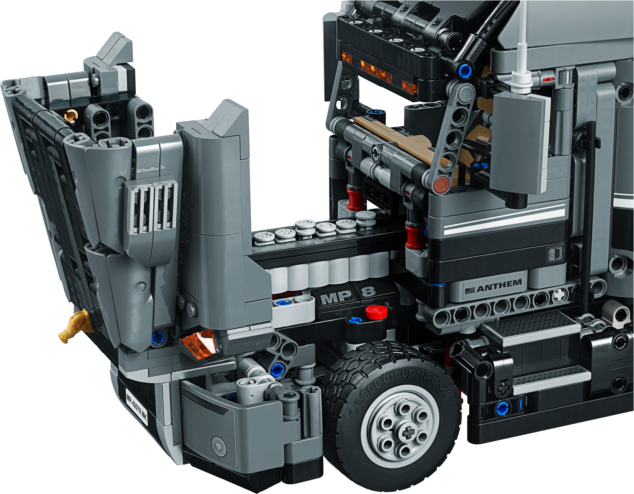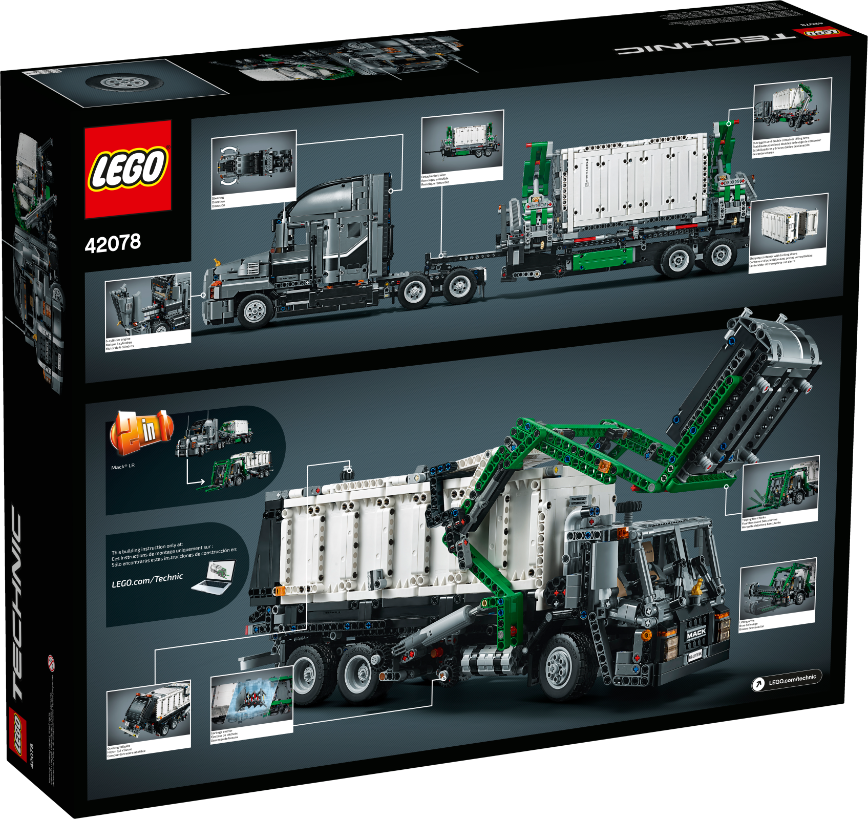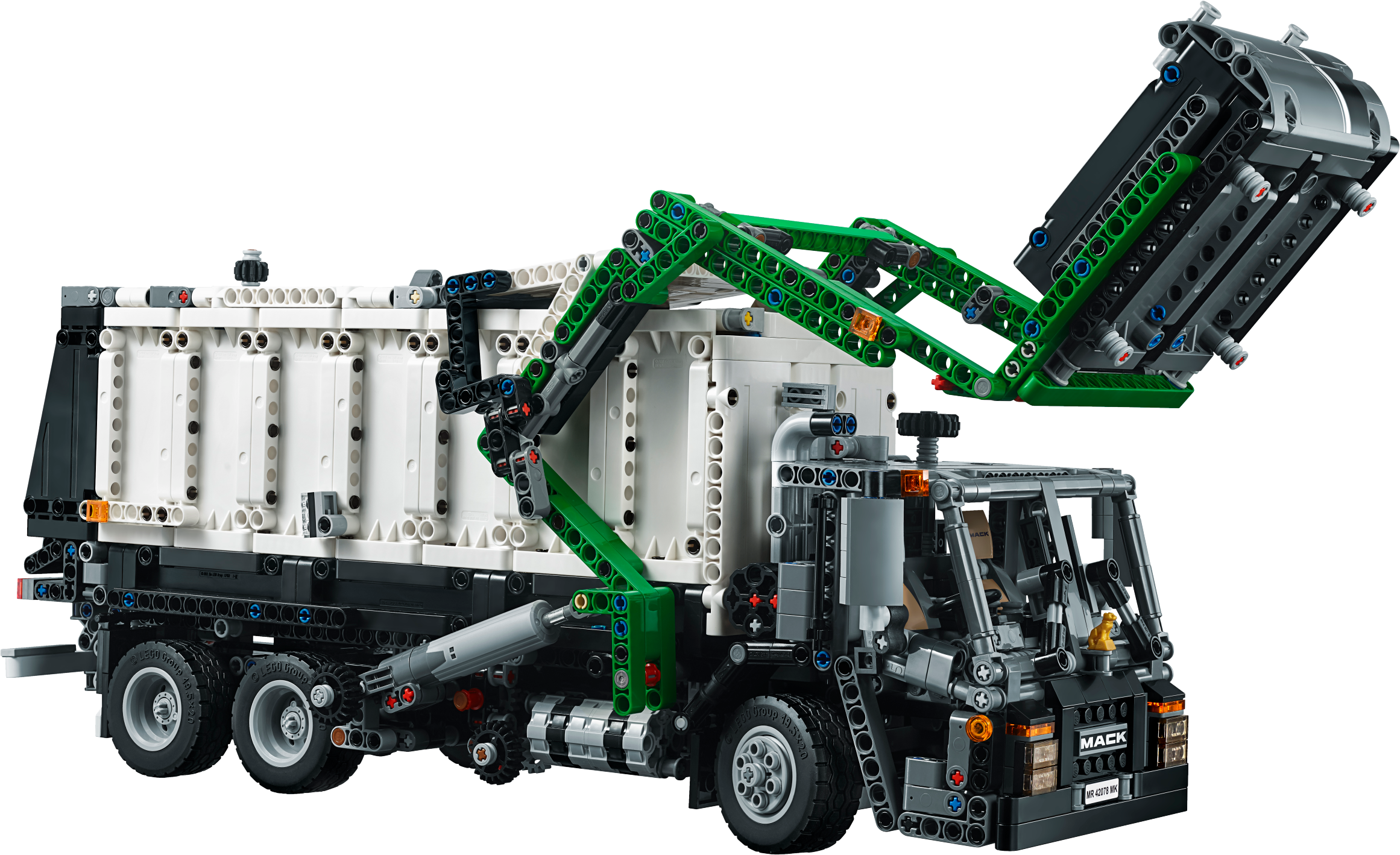 Explore state-of-the-art engineering and design with this authentic LEGO® Technic replica of the Mack Anthem truck and trailer. Developed in partnership with Mack® Trucks Inc., this model comes with an array of realistic technical details and functions, including front-axle steering, rear wheel drive and a 6 cylinder straight engine with working pistons and spinning radiator fan. The detachable trailer has extendable outriggers, working landing legs, synchronized crane arms with side loading capability, and a loadable container with lockable doors, while the accessible driver’s cab has opening doors, adjustable seats, detailed dashboard, steering wheel, sun visors and a bunk bed. This 2-in-1 advanced building set also features a Mack bulldog hood ornament, and can be rebuilt into a detailed replica of the iconic Mack LR garbage truck. Features authentically designed bodywork, front-axle steering, rear wheel drive, 6 cylinder straight engine with moving pistons and spinning radiator fan, detailed driver’s cab with opening doors, adjustable seats, steering wheel, dashboard, sun visors and a bunk bed, and adjustable wing mirrors. Also features a detachable trailer with extendable outriggers, landing legs, synchronized crane arms and a container with lockable doors. Includes special decorated elements and manufacturer´s logo, plus an iconic Mack® bulldog hood ornament and a collection of authentic stickers. Check out the authentic gray, black, white and green color scheme. Steer the truck into position, lower the landing legs, extend the outriggers and operate the synchronized crane arms to side-load the container onto the trailer. Lift the hood to reveal a detailed 6 cylinder straight engine with moving pistons and spinning radiator fan. Open the side panels to access the fuel tanks. This LEGO® Technic advanced building set is designed to provide an immersive and rewarding building experience. This set includes over 2,590 pieces and is suitable for ages 11-16. 2-in-1 model: rebuilds into a replica of the iconic Mack LR garbage truck. Building instructions for the Mack LR garbage truck are available at LEGO.com/technic. Mack Anthem truck and trailer with crane boom and landing legs extended measures over 10” (27cm) high, 32” (83cm) long and 7” (18cm) wide, and over 8” (22cm) high and 5” (15cm) wide with the crane boom and landing legs retracted. Mack LR measures over 7” (19cm) high, 22” (58cm) long and 6” (17cm) wide with forks and container lowered, and over 12” (33cm) high with forks and container raised.