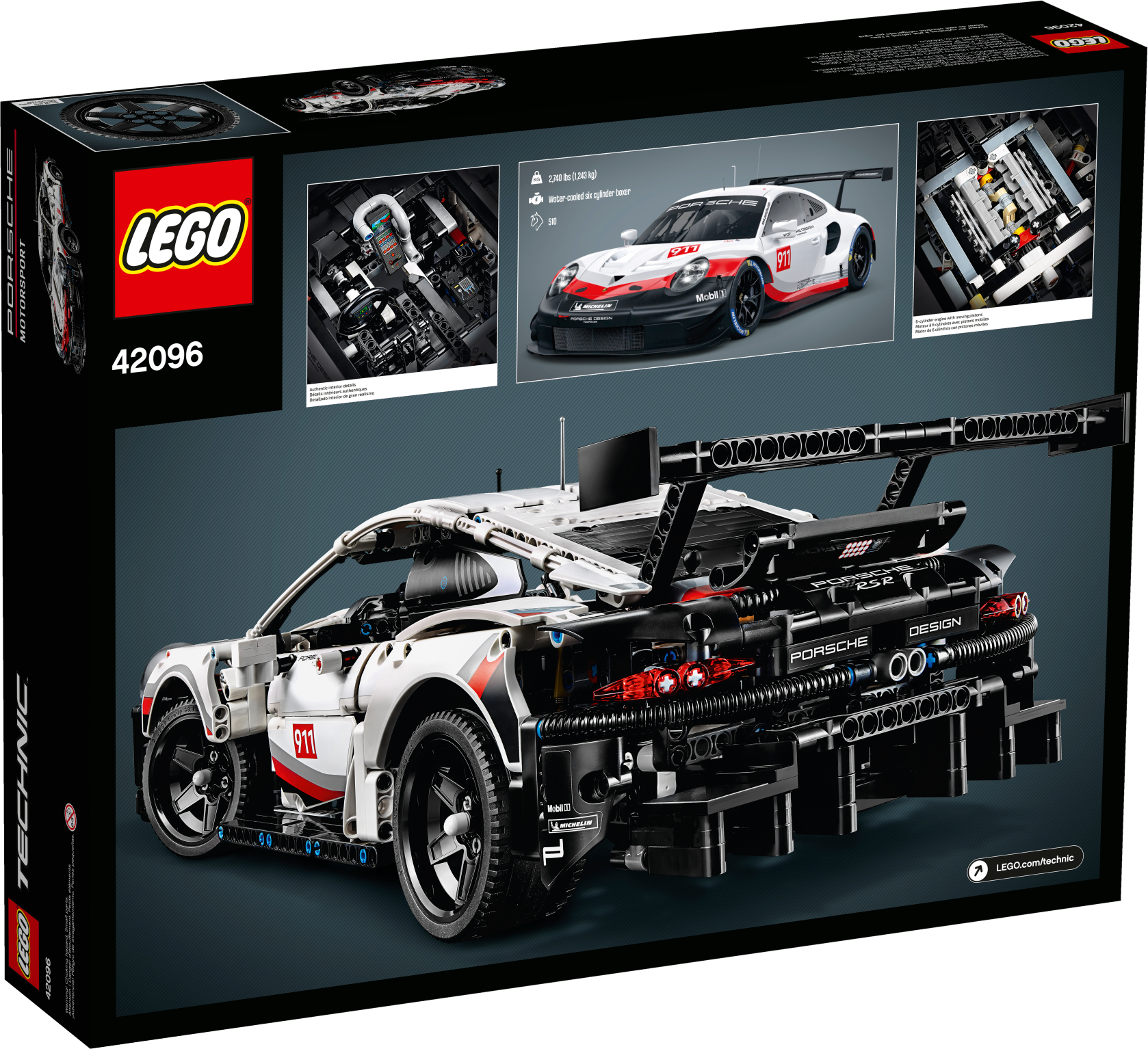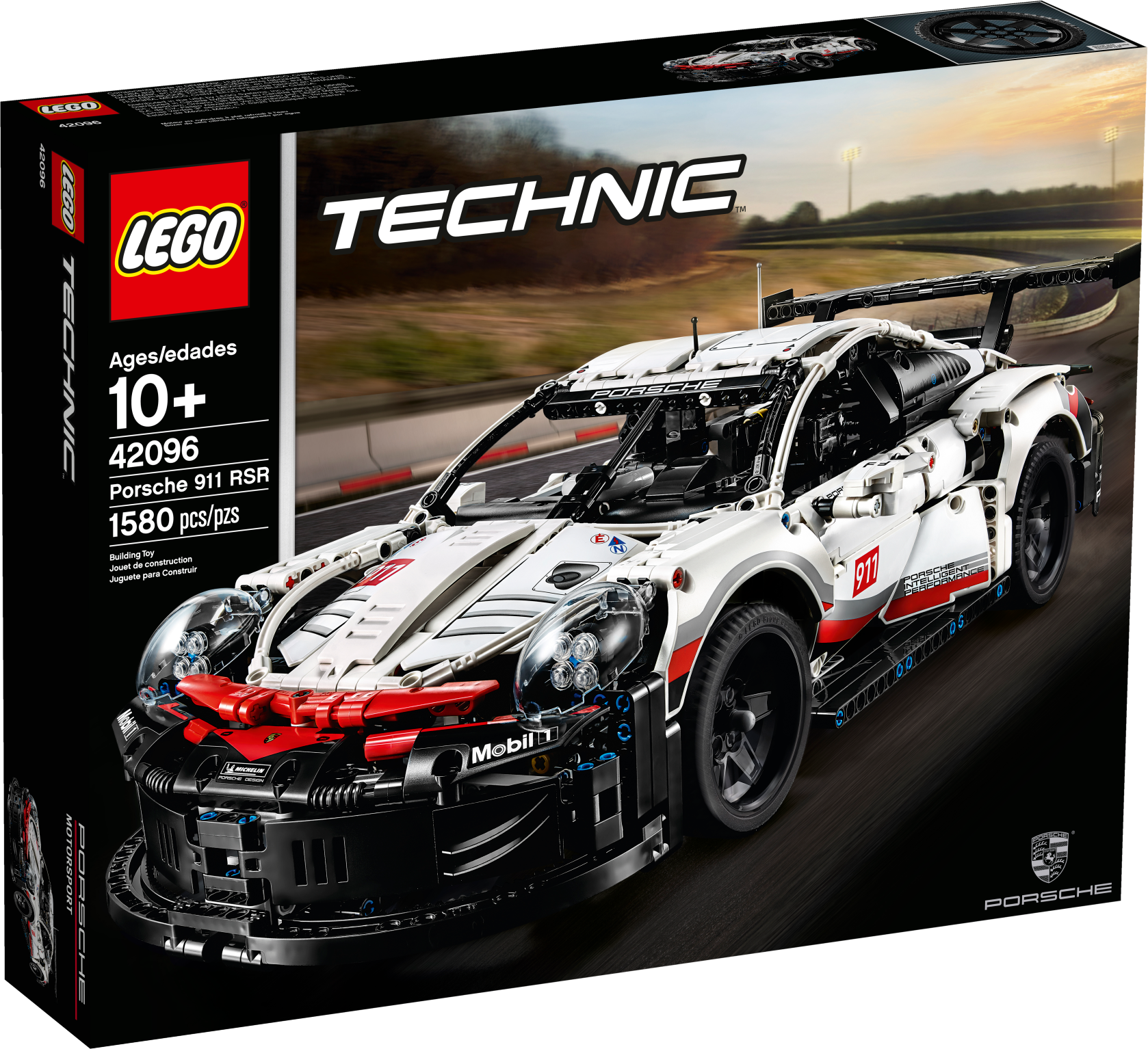 Celebrate an icon of engineering excellence with the LEGO® Technic™ 42096 Porsche 911 RSR. Developed in partnership with Porsche, this authentic replica captures the vehicle’s powerful appearance with its sharp contours and aerodynamic detailing, including a rear wing with ‘swan neck' mounts, extended rear diffuser and specially designed side mirrors. Functions include a visible, working differential, independent suspension and a six-cylinder boxer engine with moving pistons positioned in front of the rear axle, while the accessible cockpit features a radar screen, working steering, fire extinguisher system and even a track map of the Laguna Seca circuit printed onto the driver’s door. Black spoked rims, realistic head and tail lights and an authentic white, red and black color scheme with sticker detailing add the final touches to this awesome LEGO Technic Porsche 911 RSR model, a perfect display piece for the home or office!me or office! Porsche 911 RSR replica model with a wealth of authentic features, including a rear wing with ‘swan neck’ mounts, extended rear diffuser and aerodynamic side mirrors, plus black spoked rims and realistic head and tail lights. Also includes a detailed cockpit, working differential, independent suspension and a six-cylinder boxer engine with moving pistons positioned in front of the rear axle. This collectible toy car also features an authentic white, red and black color scheme and a sticker sheet for additional detailing. Open the doors to access a cockpit packed with realistic details, including a radar screen, working steering, fire extinguisher system and a track map of the Laguna Seca circuit printed onto the driver’s door. Check out the six-cylinder boxer engine with moving pistons. This set includes 1,580 pieces. This LEGO® Technic™ model is designed to provide an immersive and rewarding building experience. Suitable for ages 10+. LEGO® Technic™ sets feature realistic movement and mechanisms that introduce young LEGO builders to the universe of engineering in an approachable and realistic way. Porsche 911 RSR measures over 5” (13cm) high, 19” (50cm) long and 7” (20cm) wide.